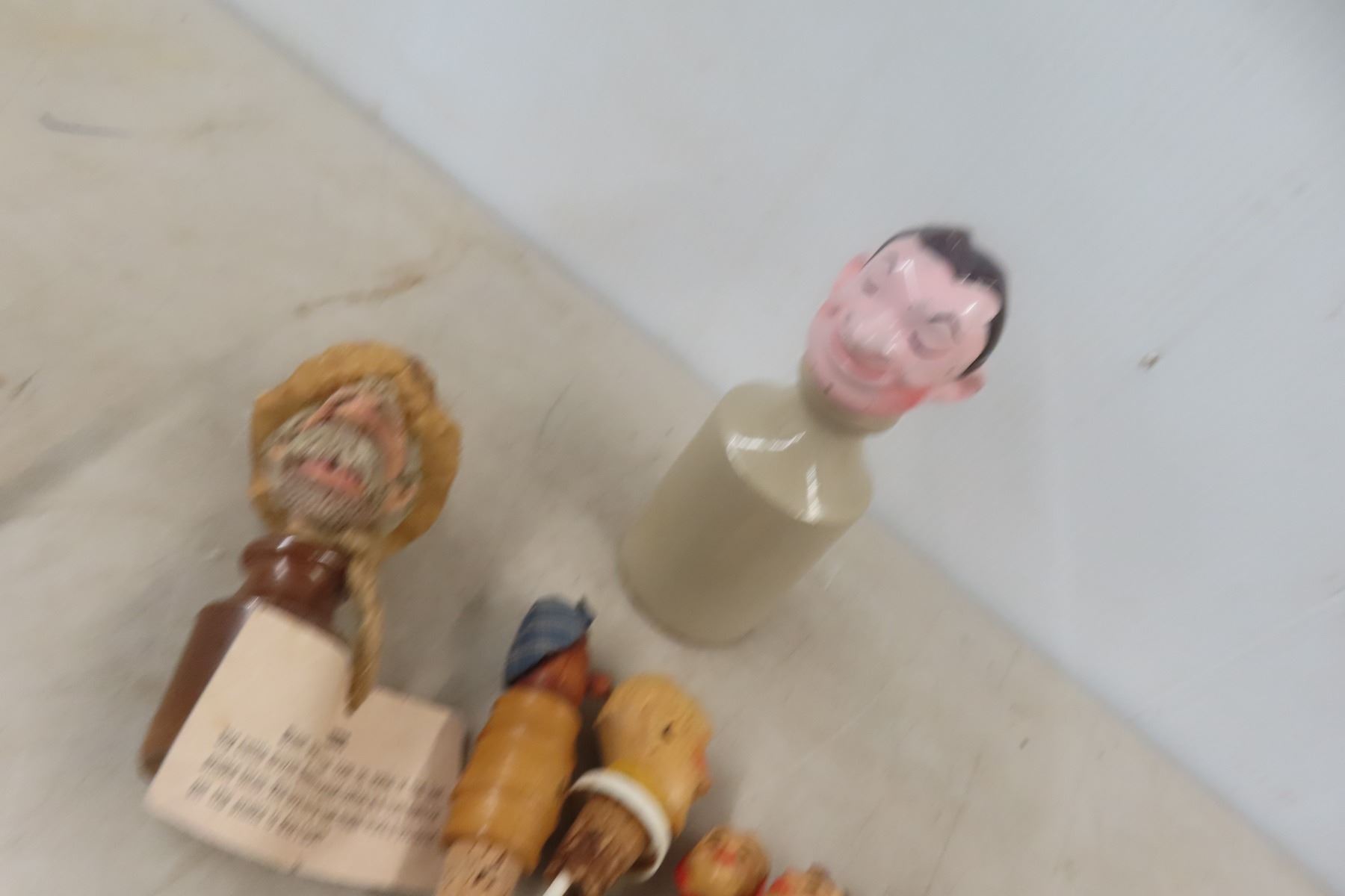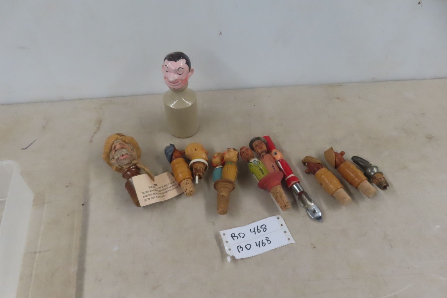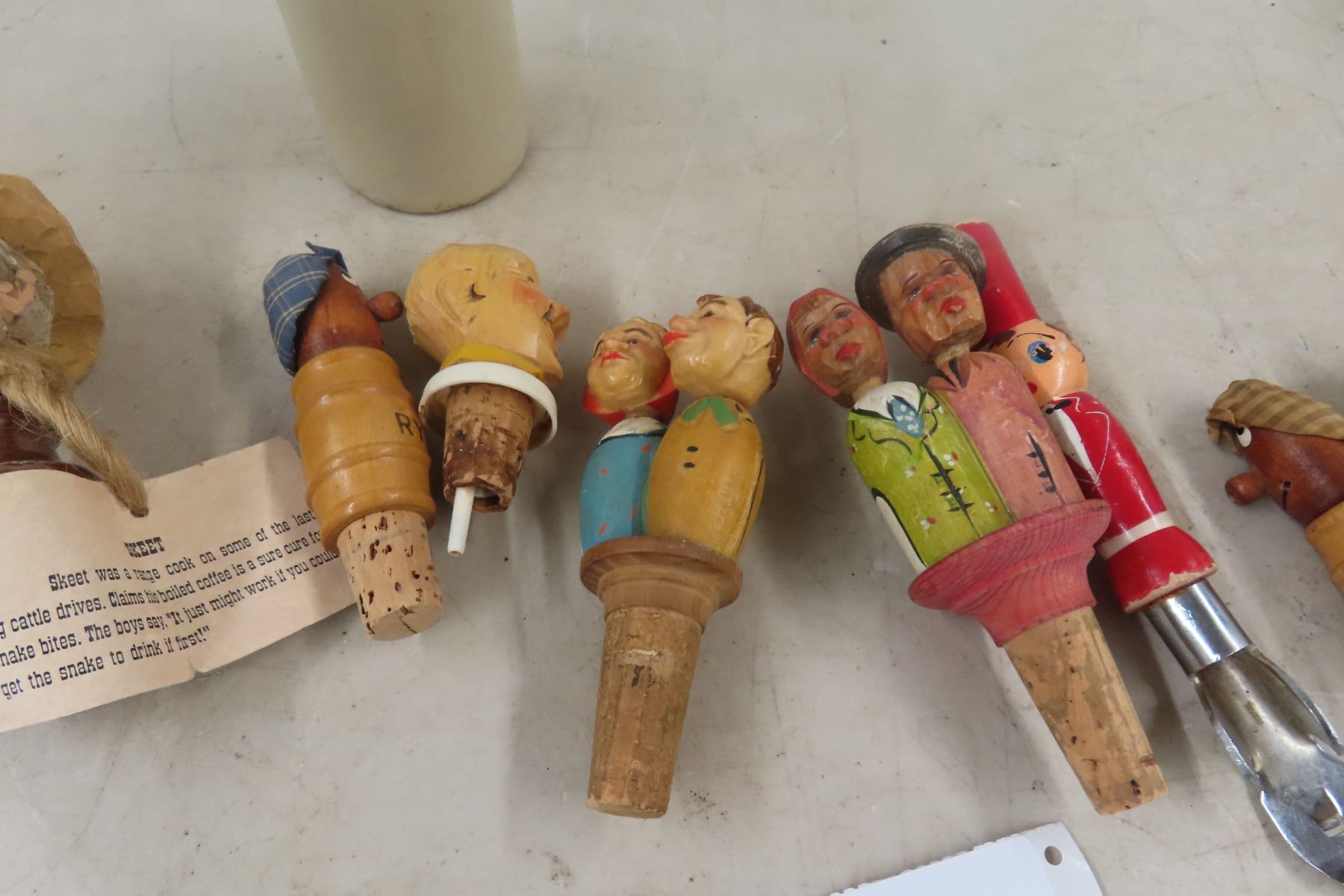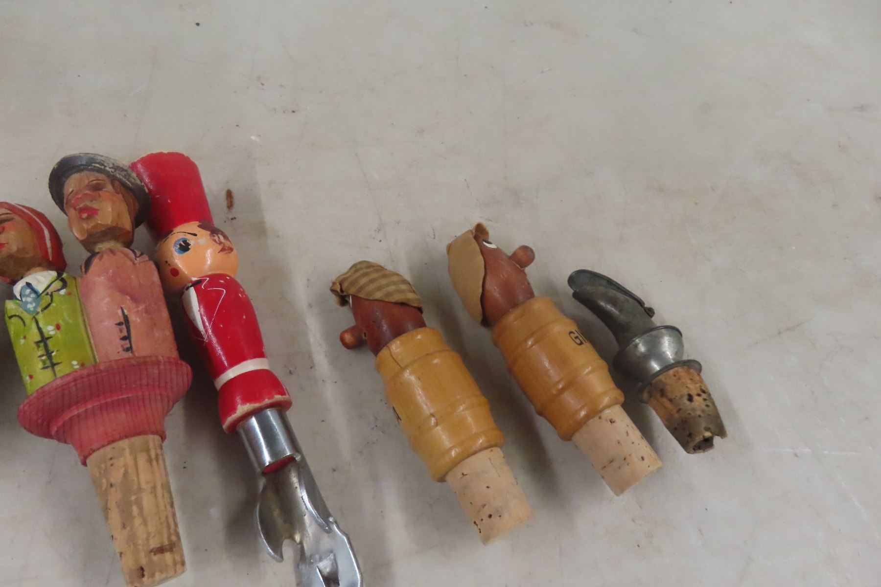 Vintage Anri Carved Folk Art Mechanical Bottle Stoppers Plus Other Corked Stoppers