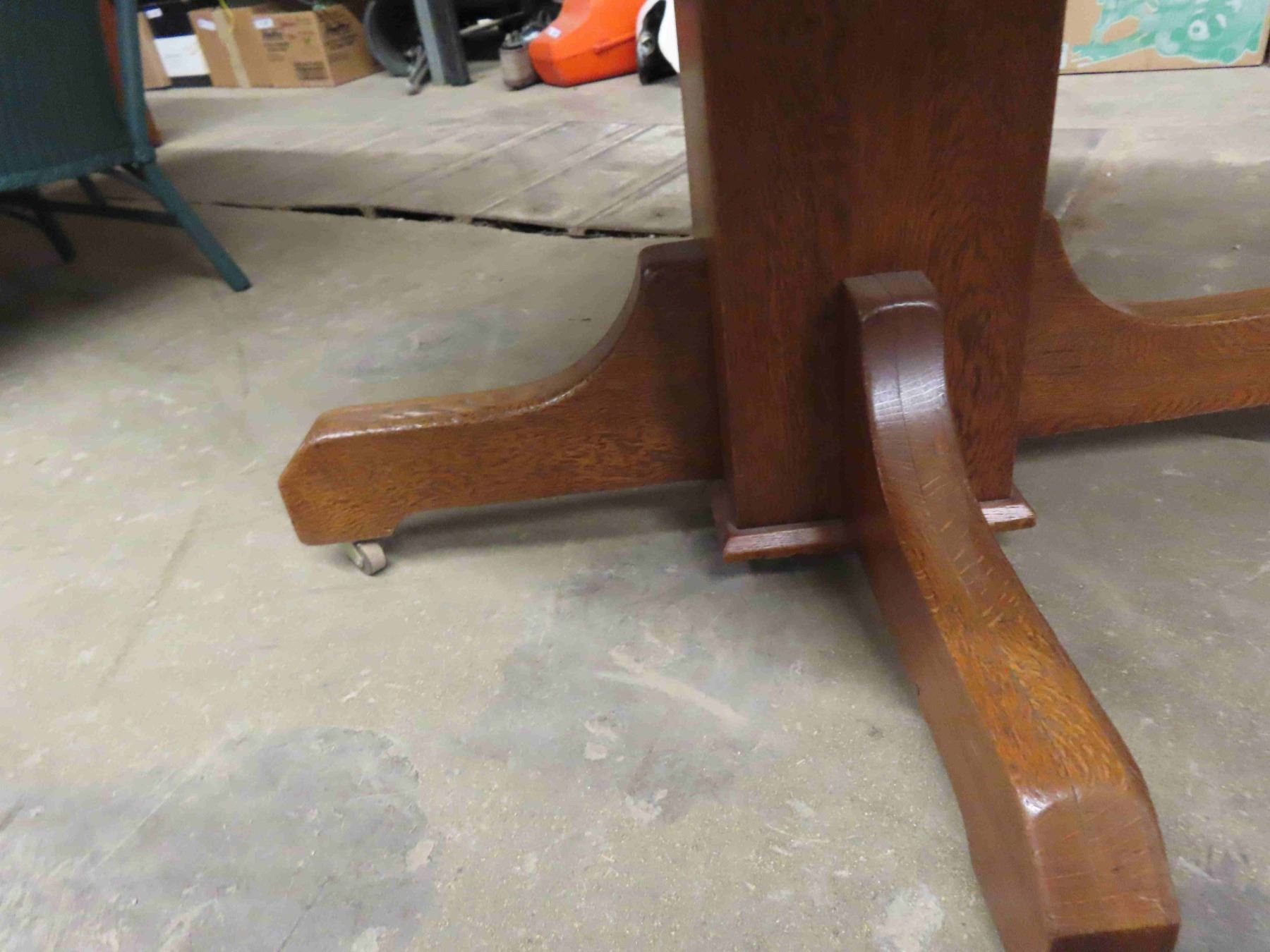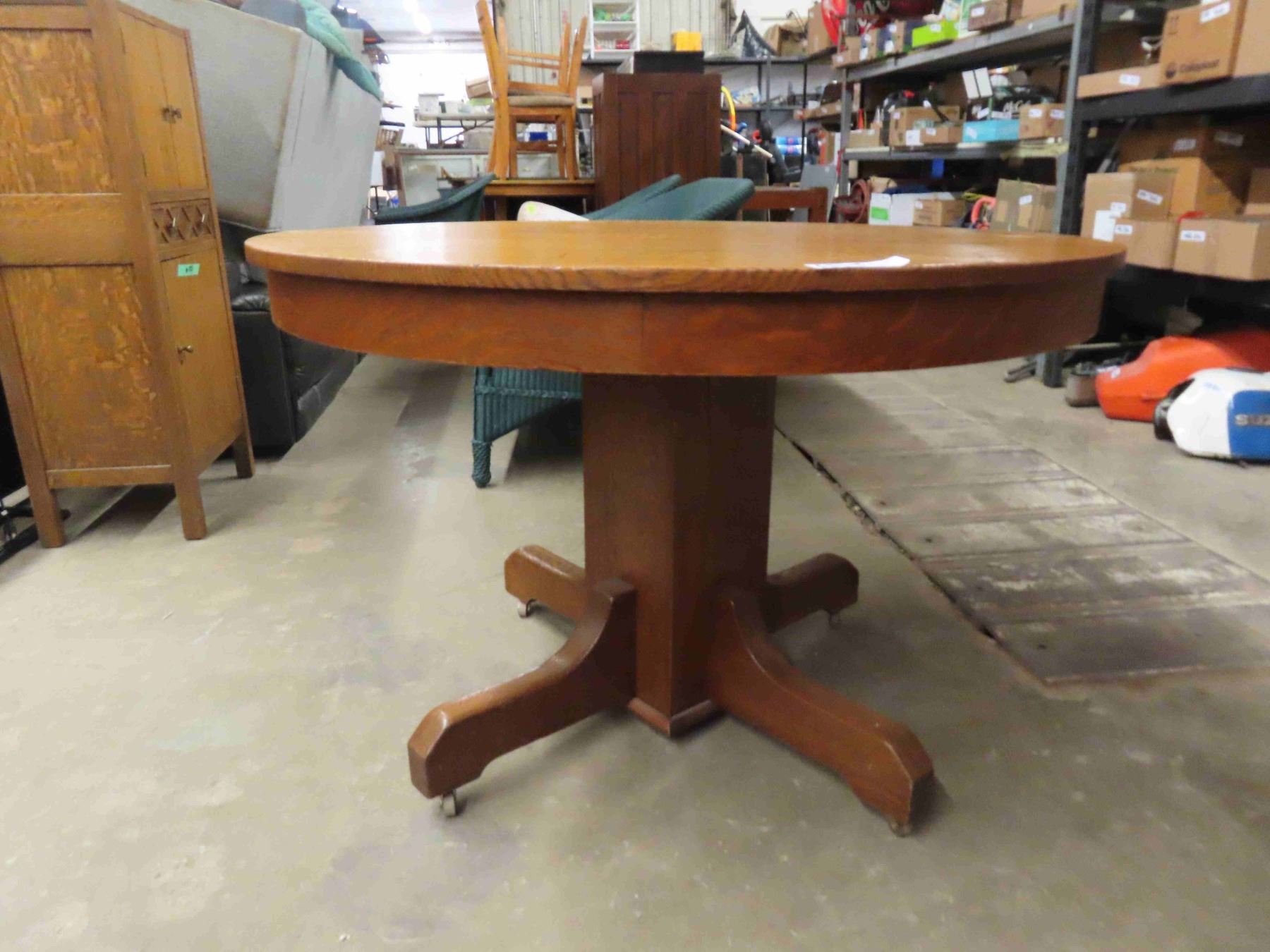 Vintage Antique Mission Oak round table 44” wide. In some areas it does show its age but still very nice! It does have 3 unfinished leaves.