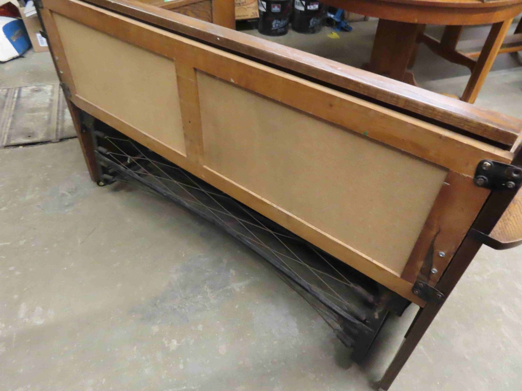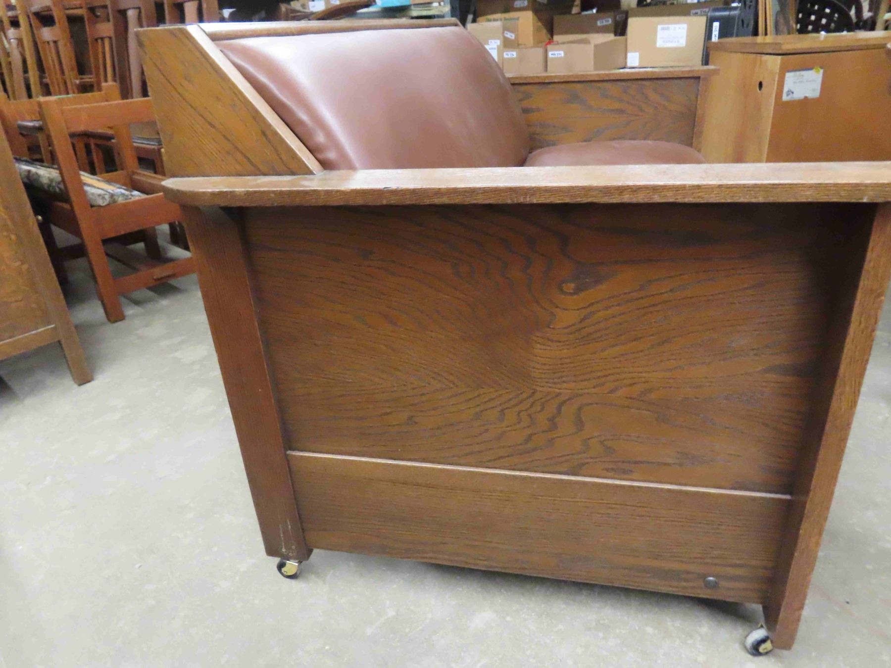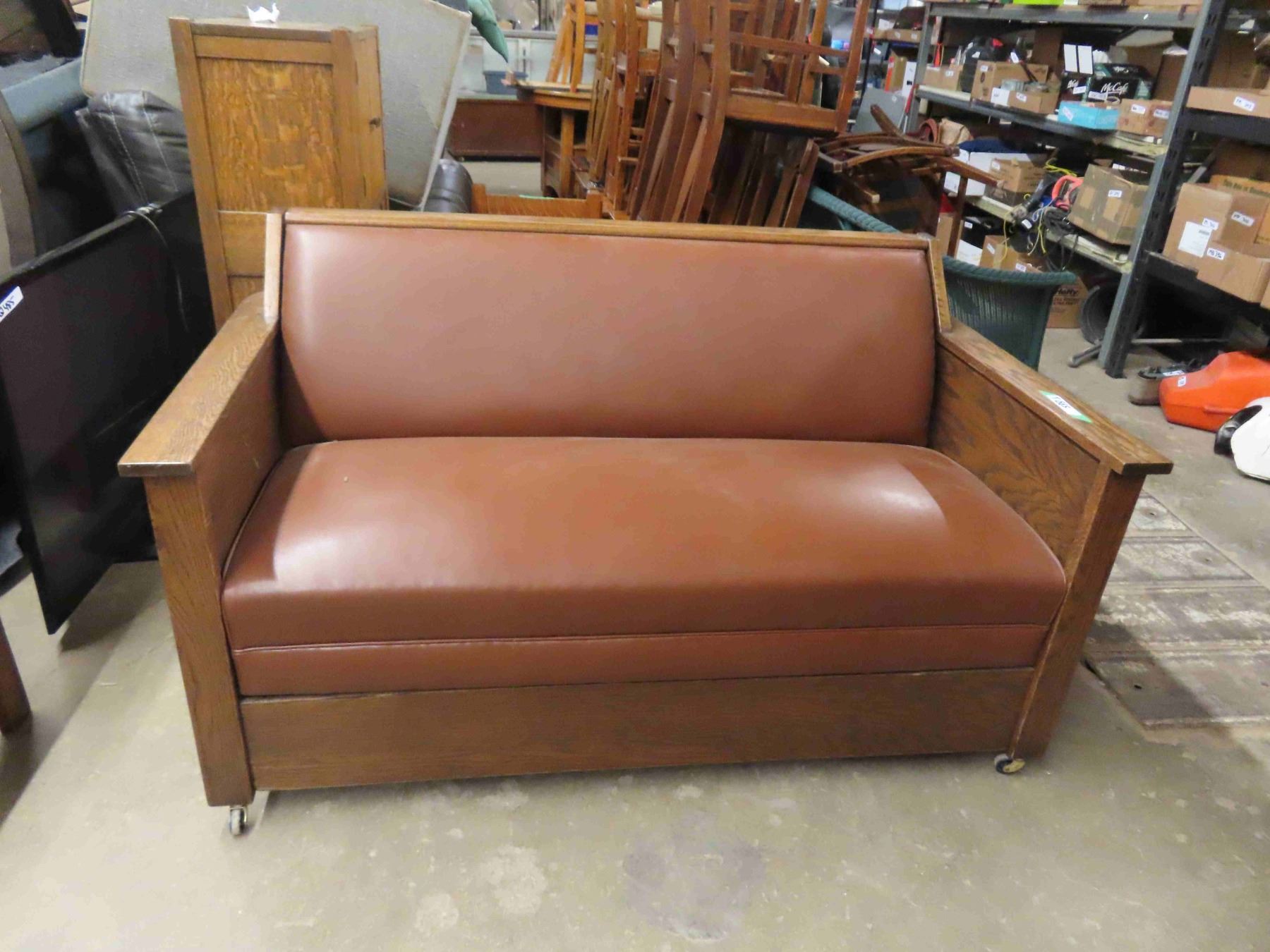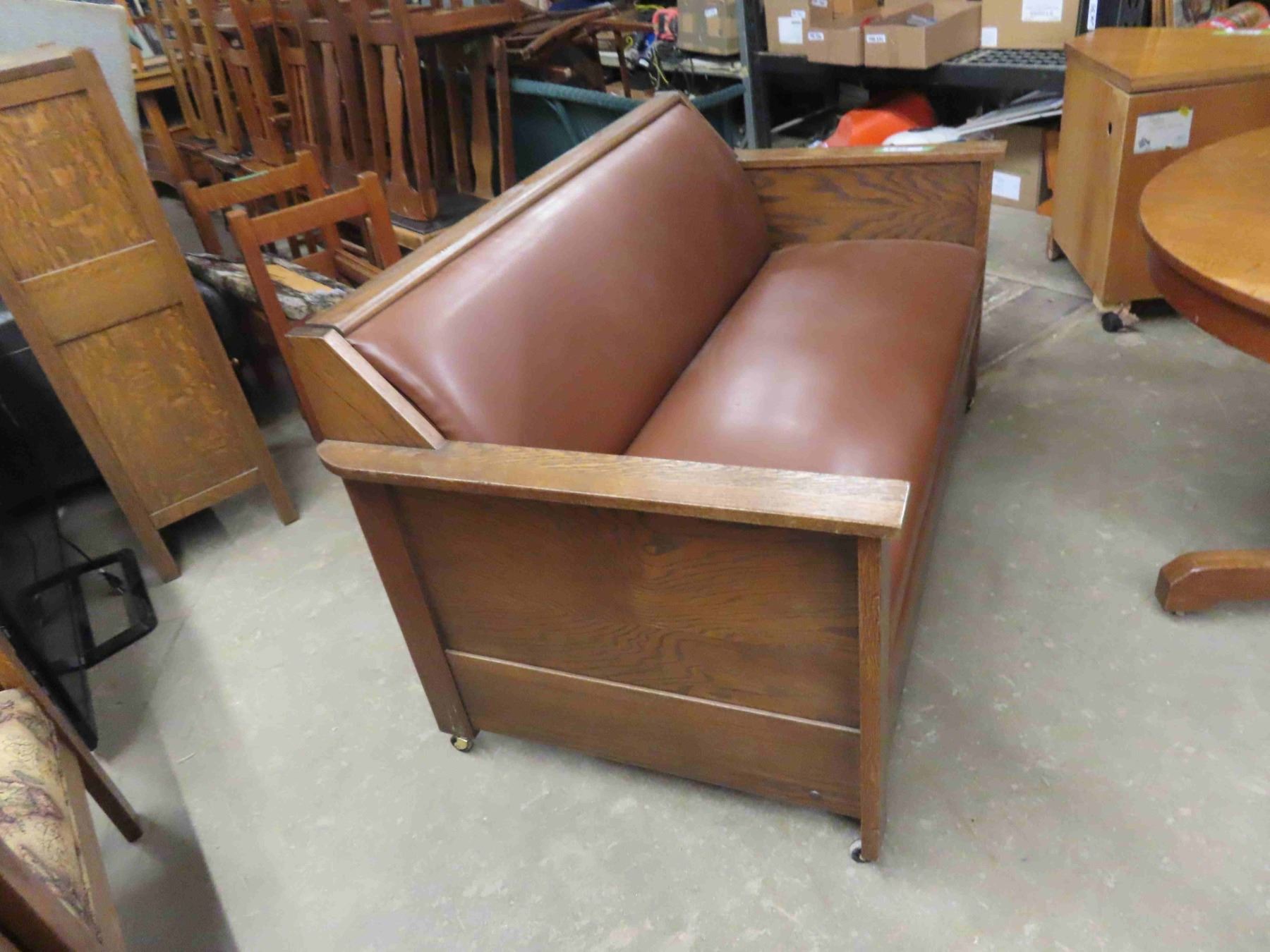 Vintage Antique Oak Settle. It pulls out to a bed- refinished and new leather like upholstery. It is also in a mission style. It is very functional and handy for guests.
