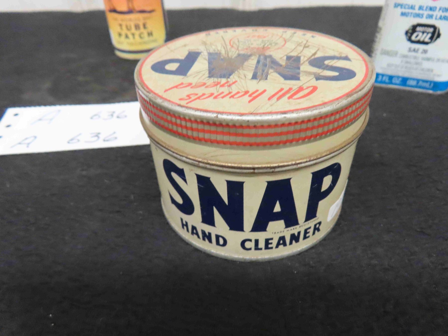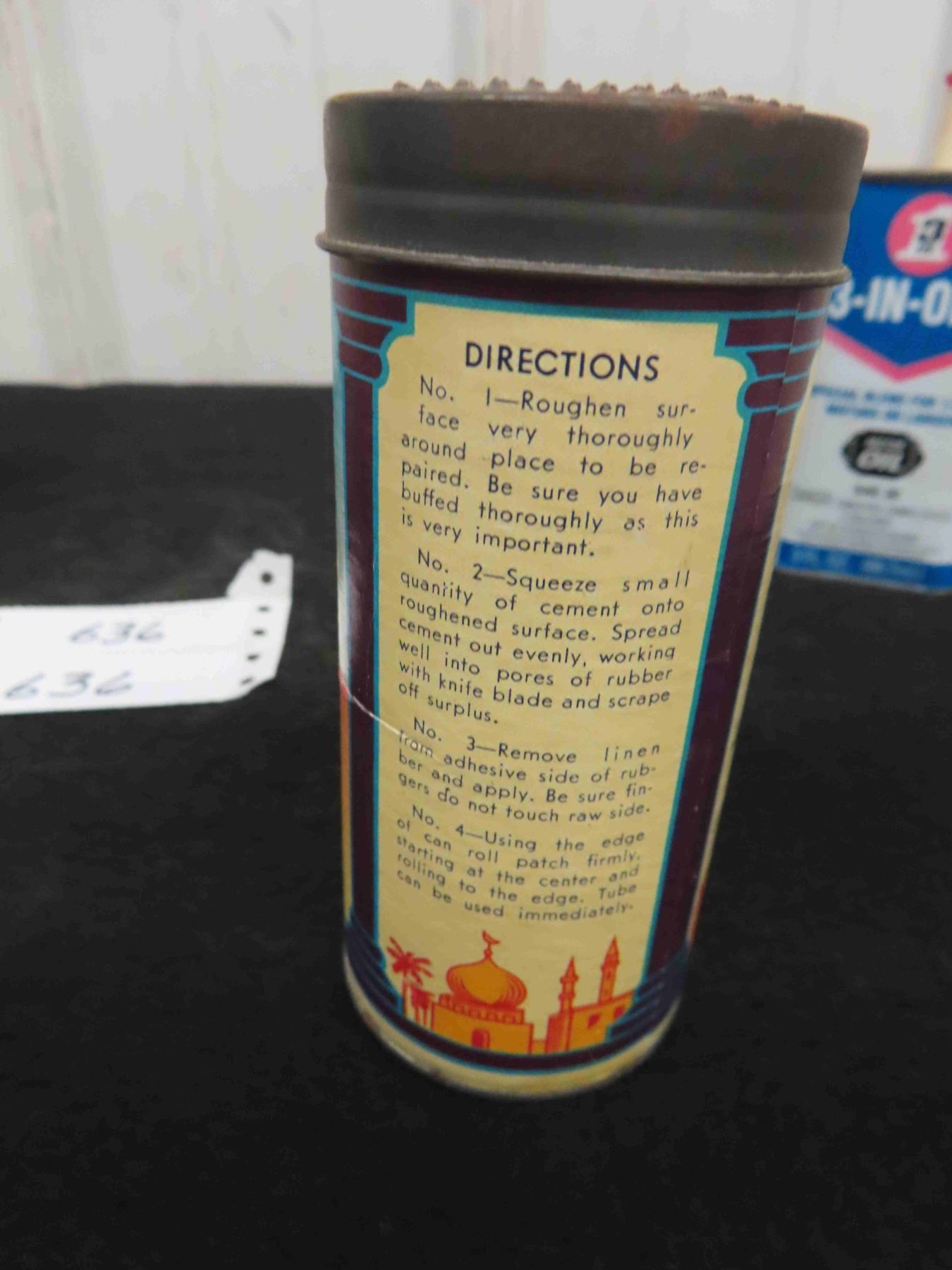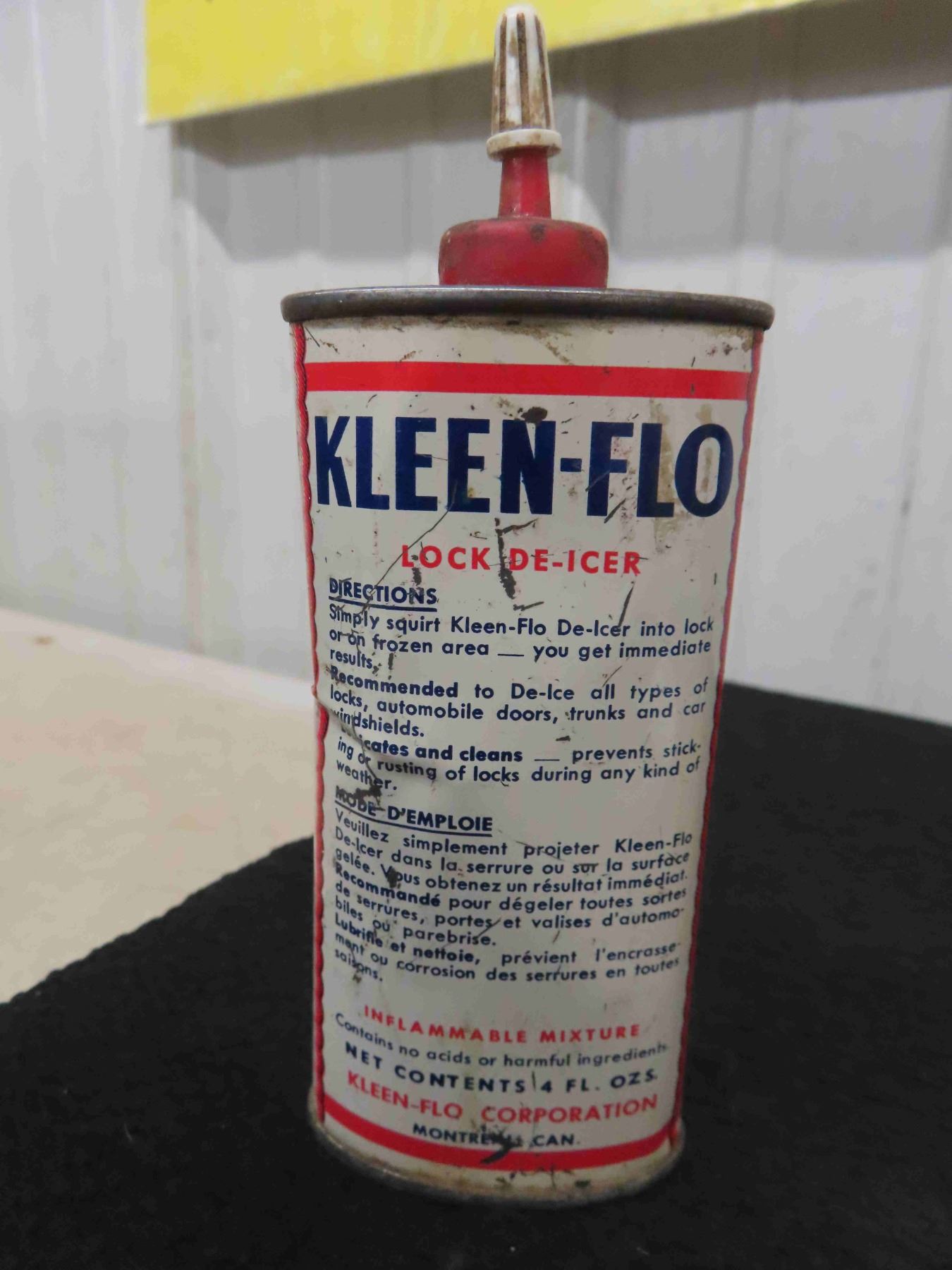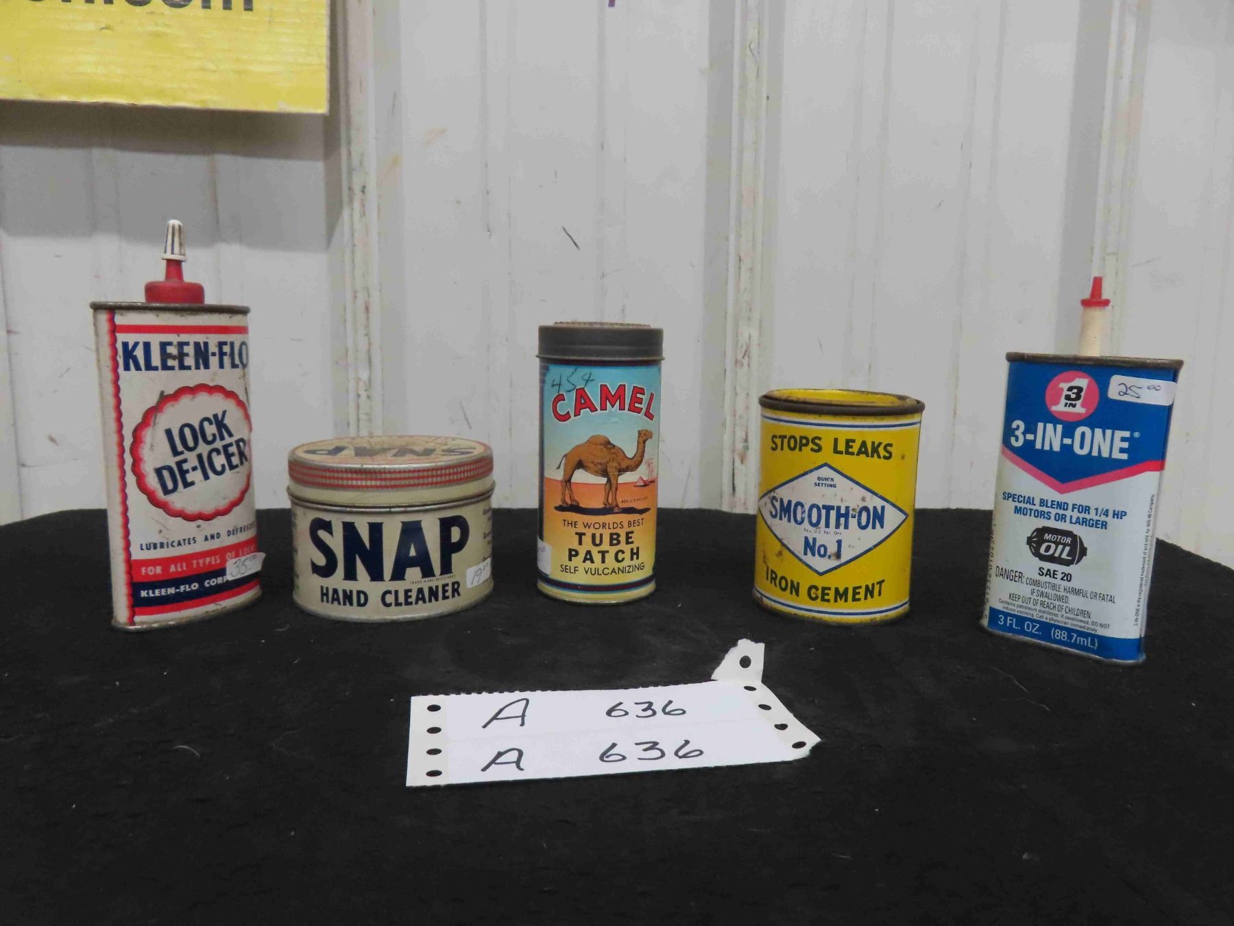 Vintage Auto and Household Tins : Kleenflo Lock Deicer, Snap Hand Cleaner, Camel Tube Patch, Plus