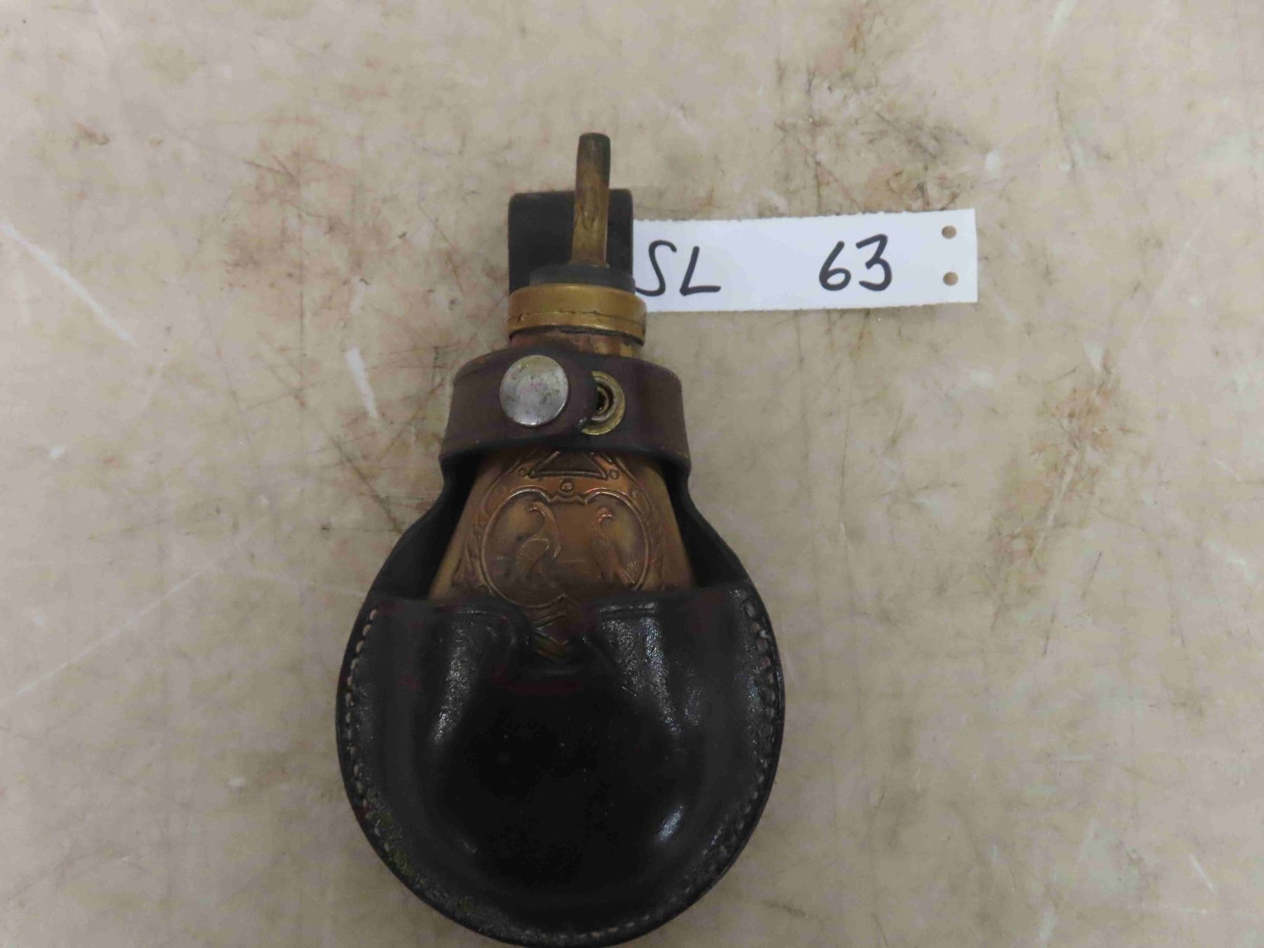 Vintage Black Powder Flask Brown Brass Embossed with Civil War Dog & 2 Pheasents Design in Leather Carrying Pouch