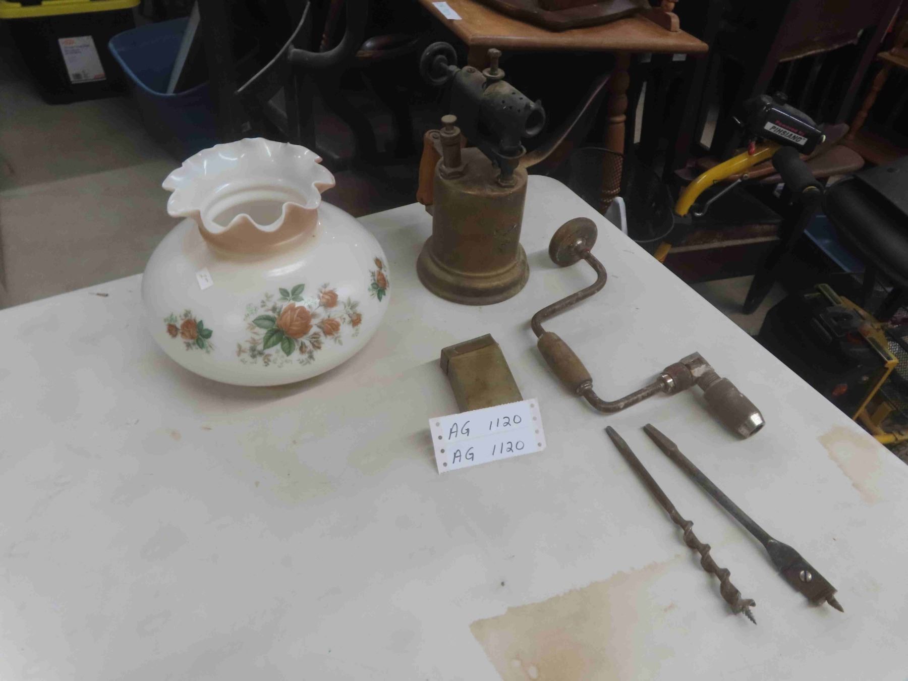 Vintage Blow Torch, Manual Hand Drill, Brass Box, Glass Lamp Shade