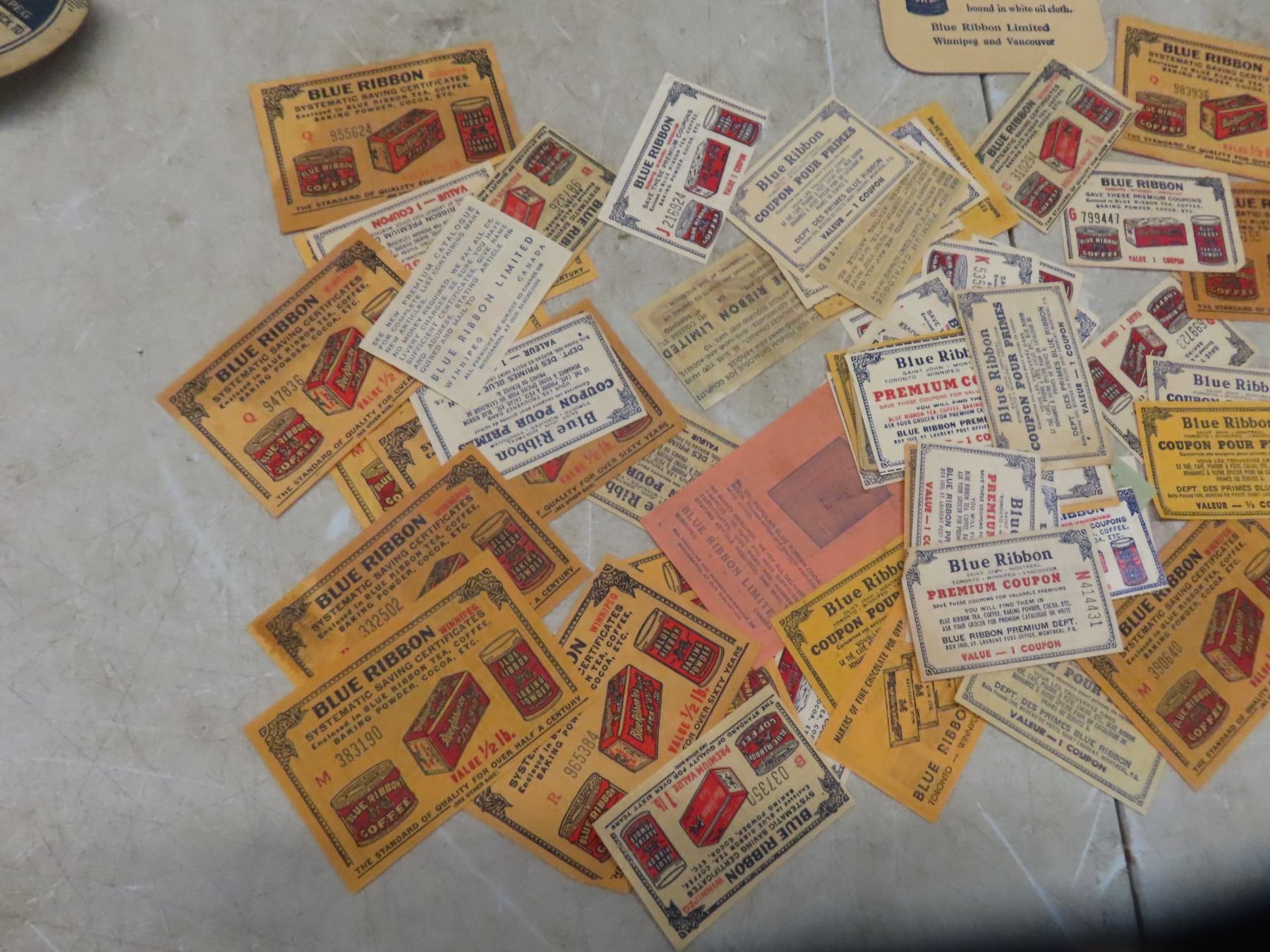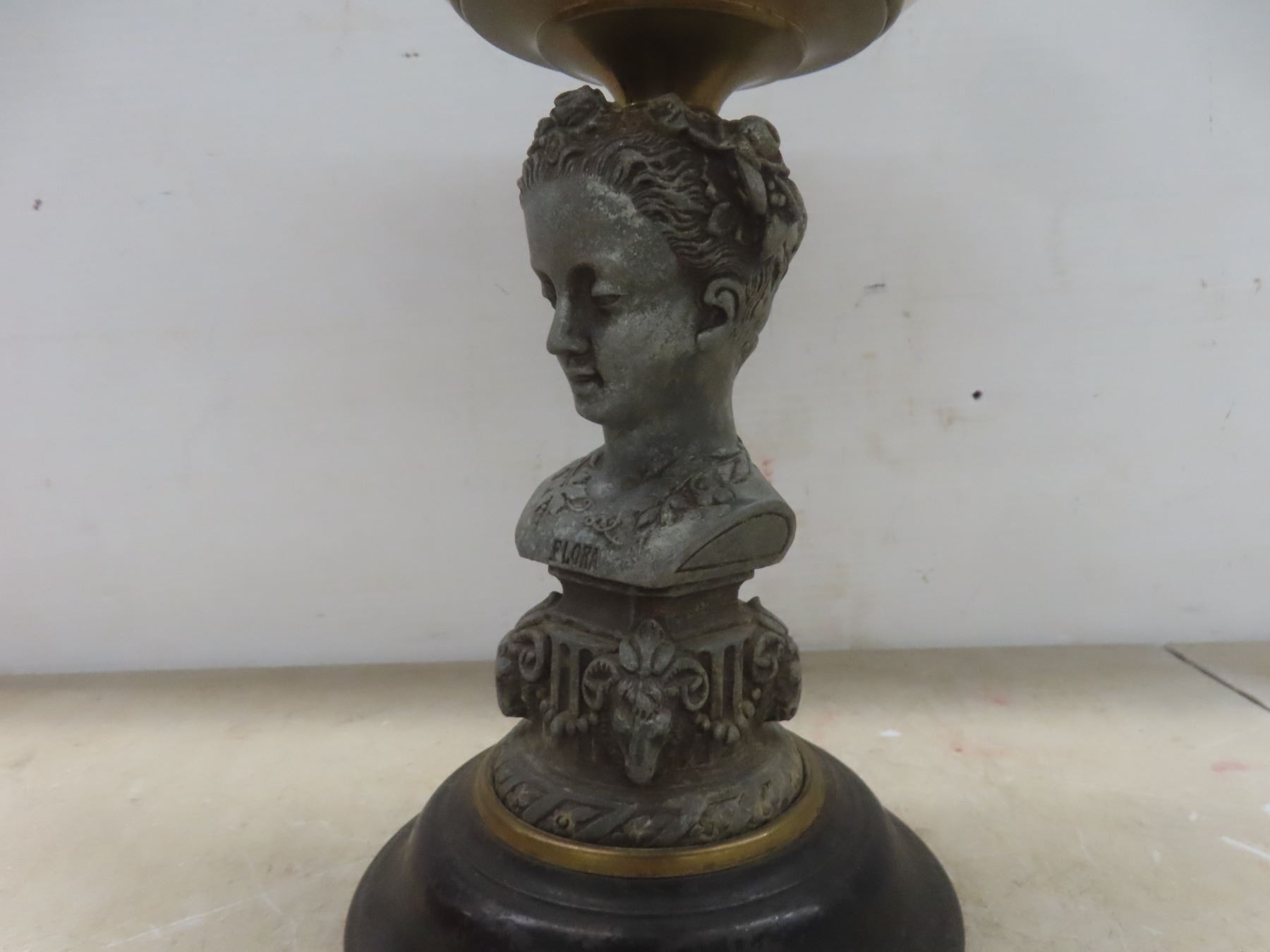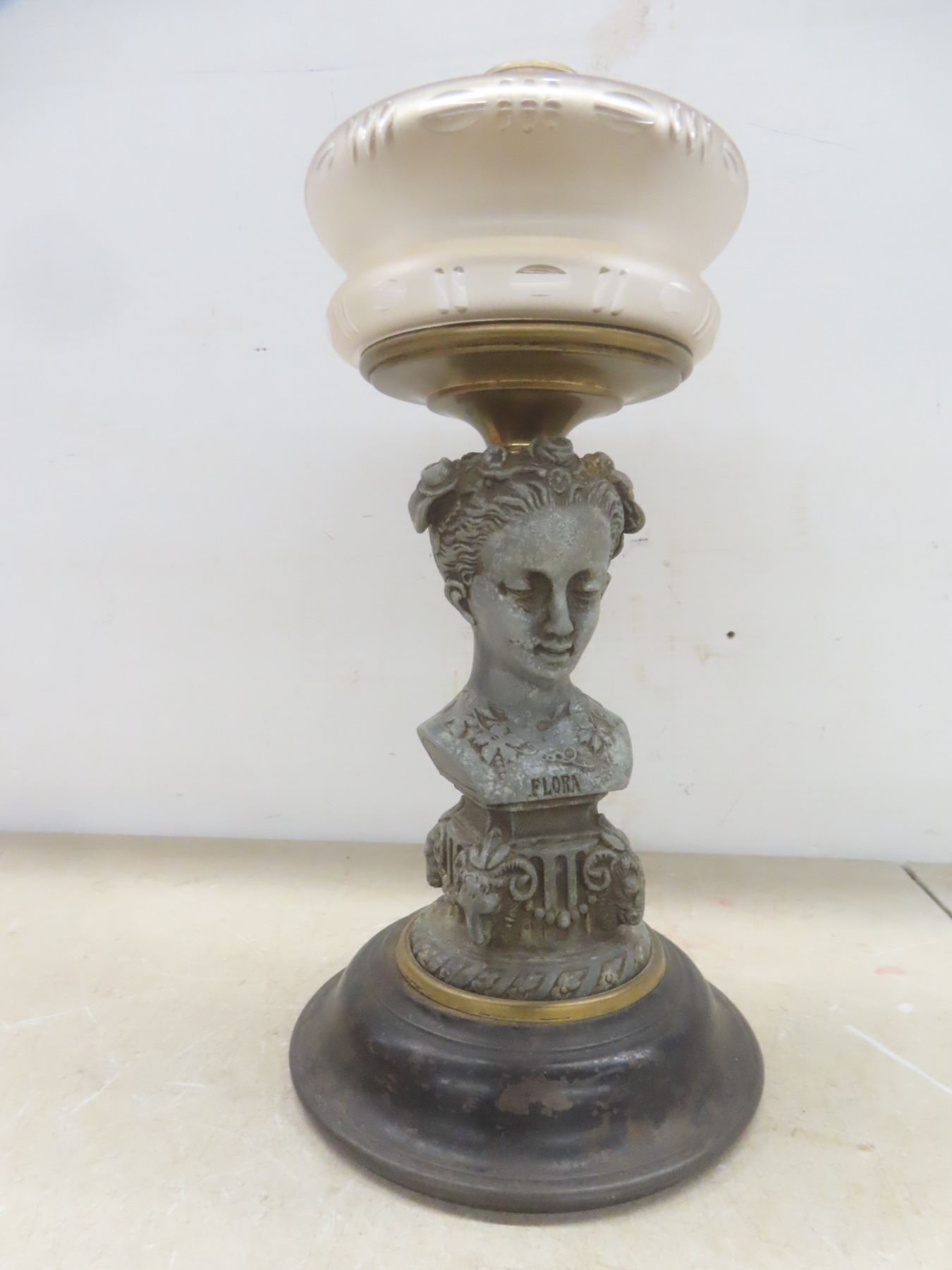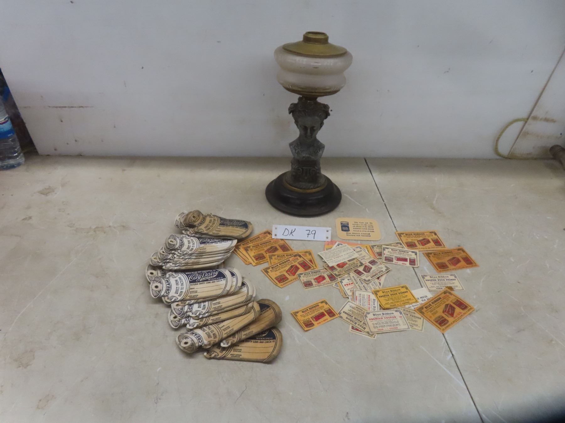 Vintage Blue ribbon Coupons, Milk Can Tags + Coal Oil Lamp Base, Metal Statue by Woman Flora McDonals 13" High - No Chimney