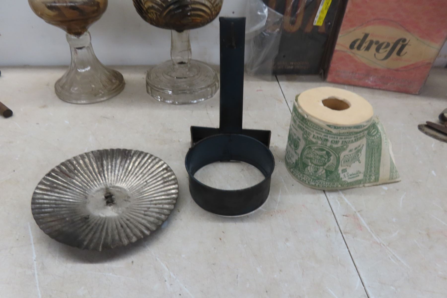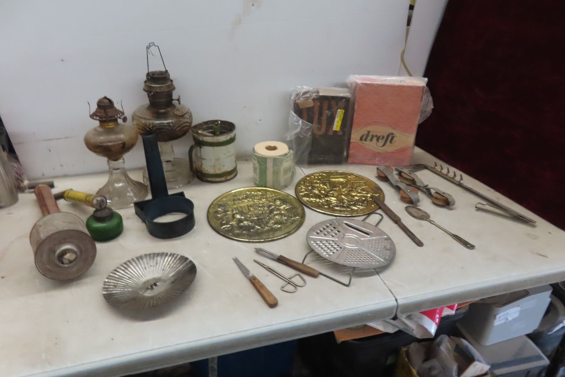 Vintage Bug Sprayers, Sifter, Washline Pulleys $100 Dollar Toilet Paper, Copper Plates, 2 Oil Lamps - No Chimneys