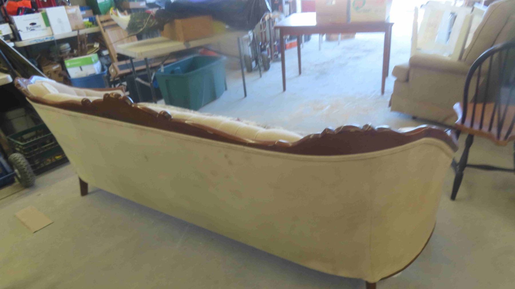 Vintage Button Back Couch with Carved Wood Working 96'' Wide - One Cushion Has Wear