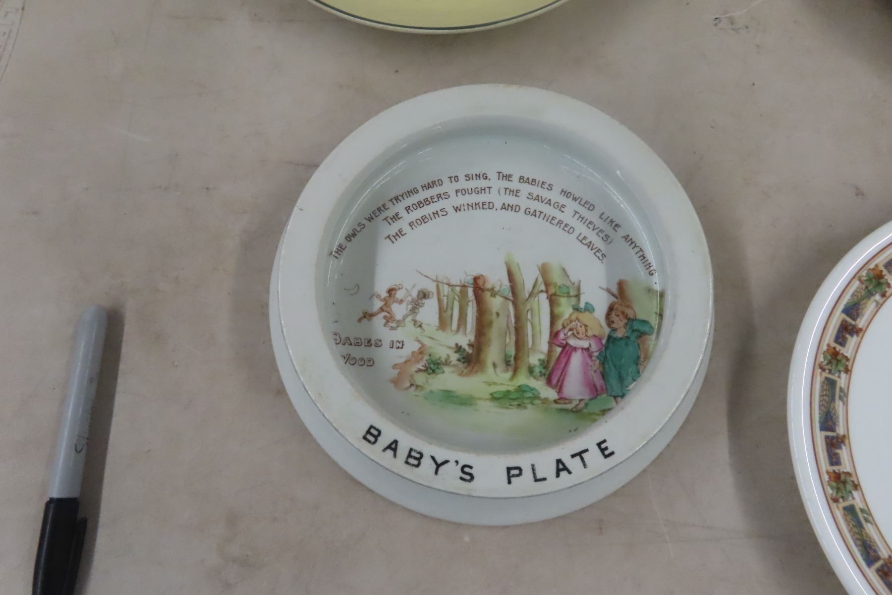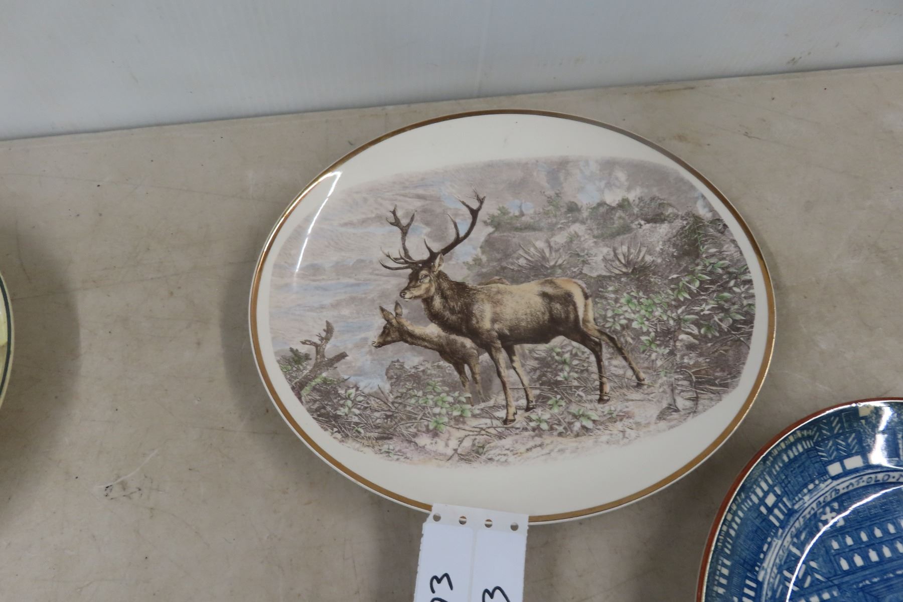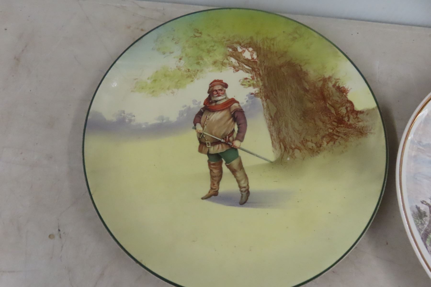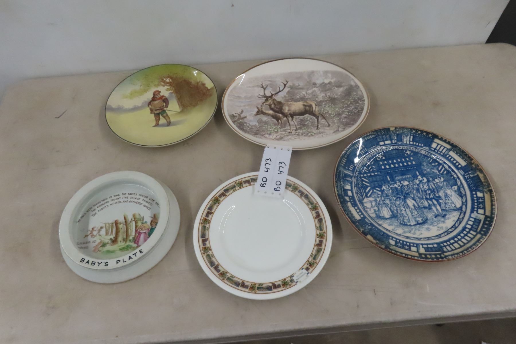 Vintage Cabin Décor Lot Widdicombe Fair Music Box Jug, Elk Plate, Doulton Swordsmen Plate, Nursx Rhyme Plate Etc.