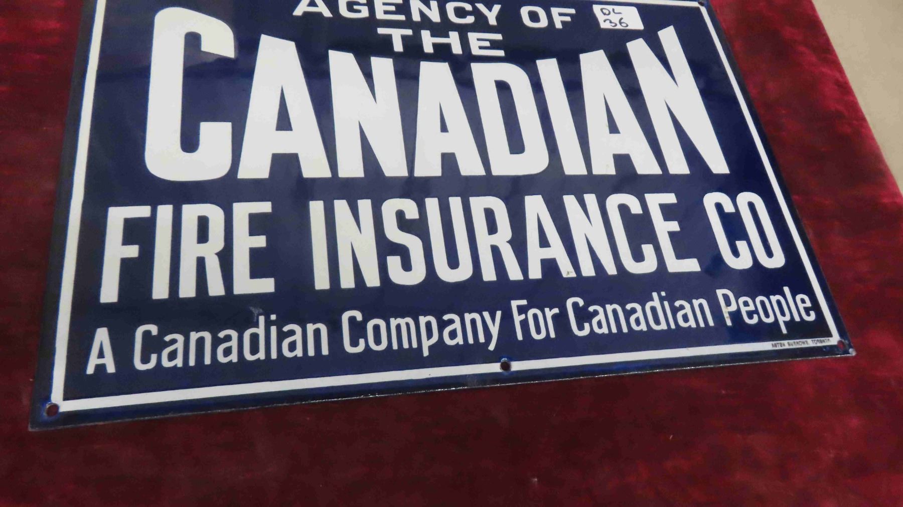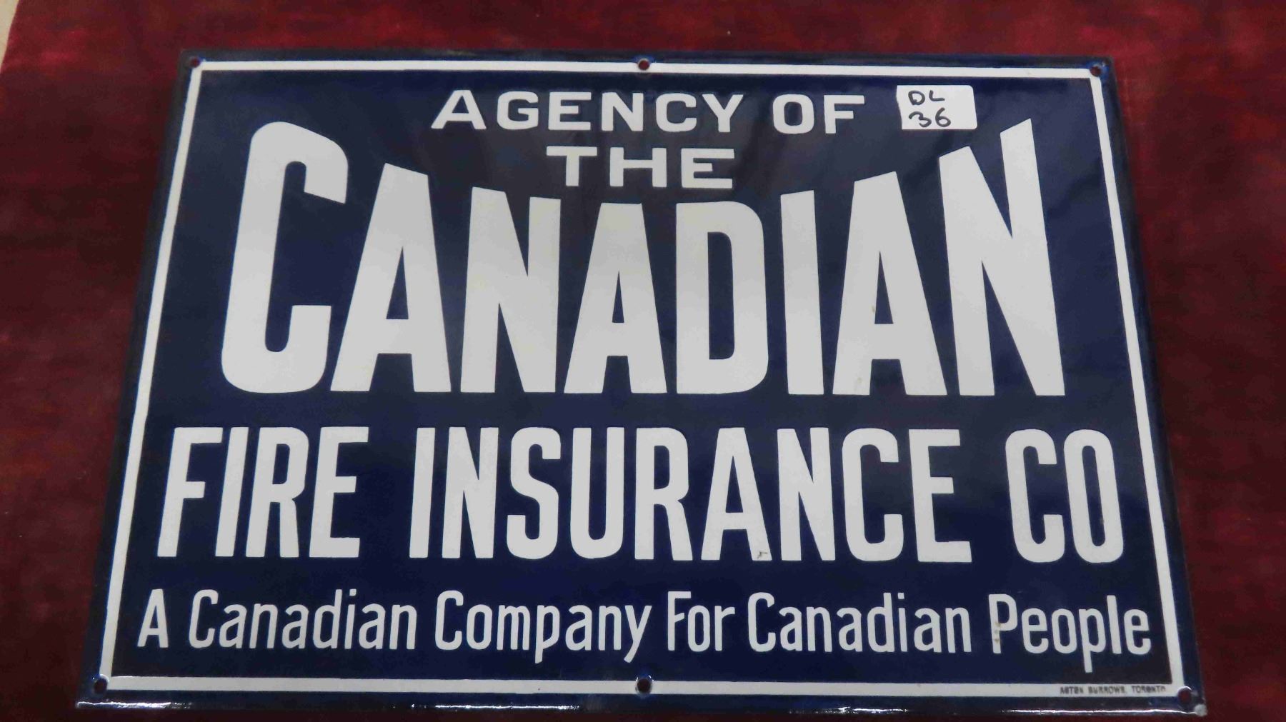 Vintage Canadian Fire Insurance Co. Porcelain Sign 12'' x 18'' Excellent Condition