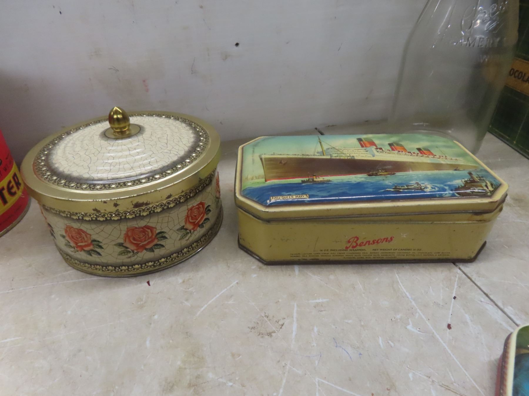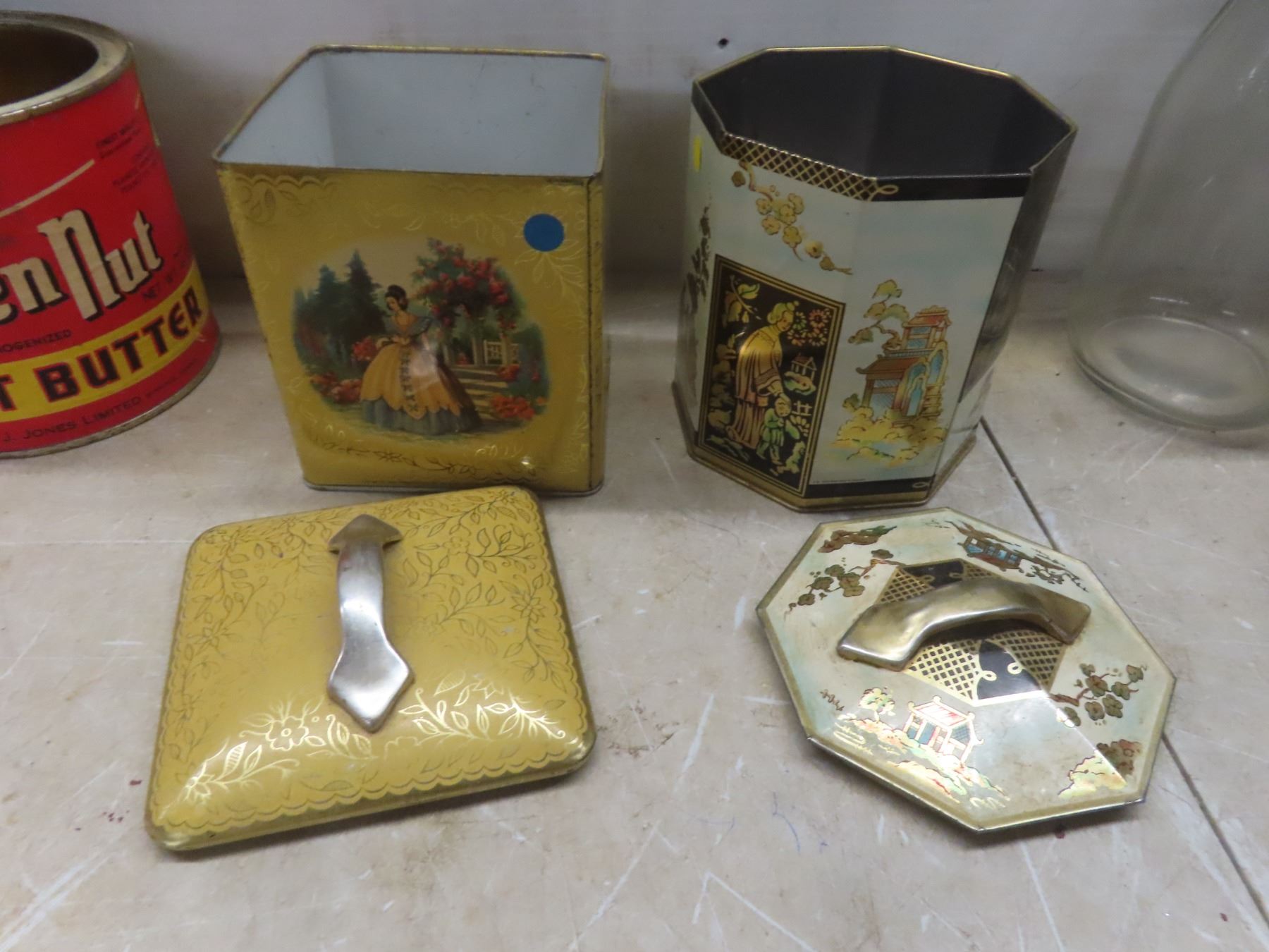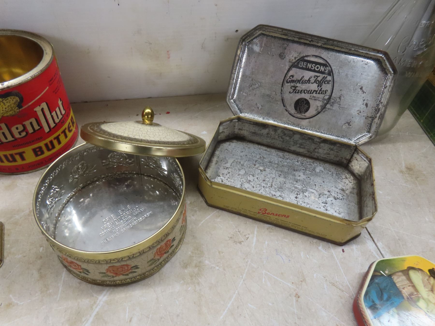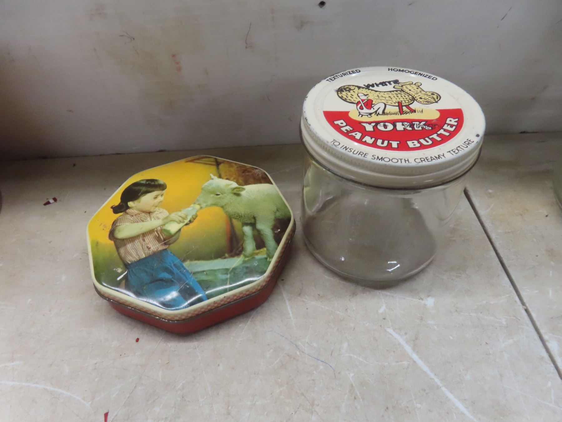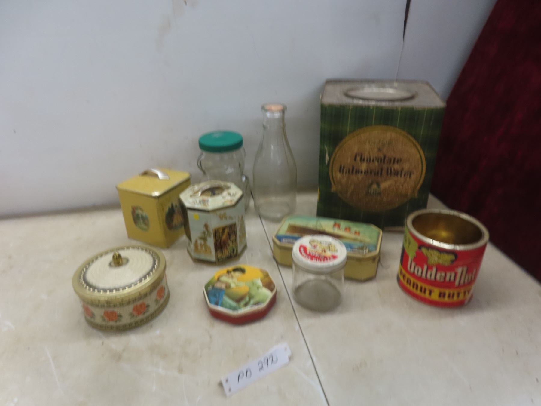 Vintage Candy And Biscuit Tins; Peanut Butter Glass Jar; And Milk Bottle.