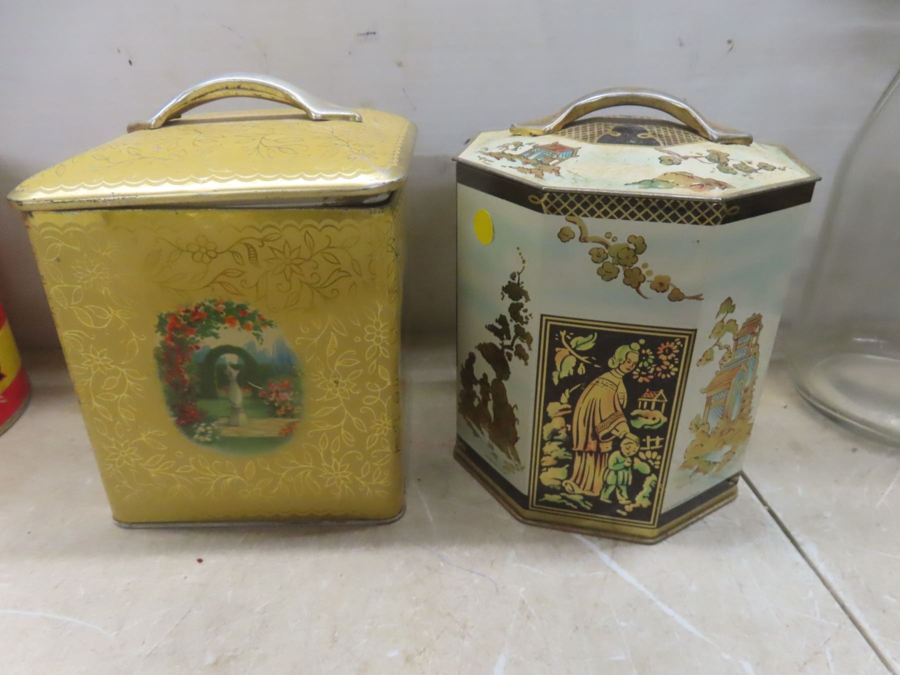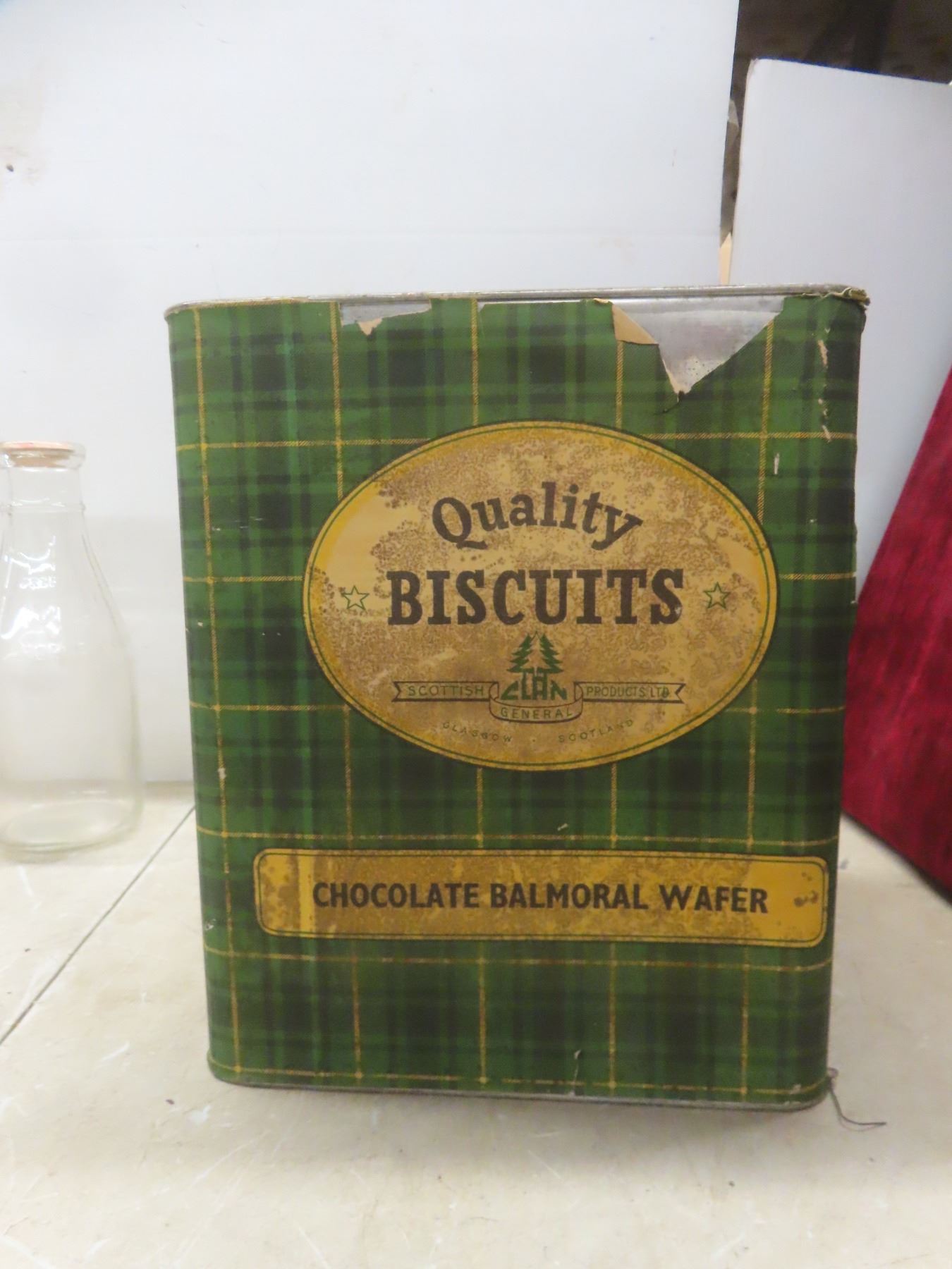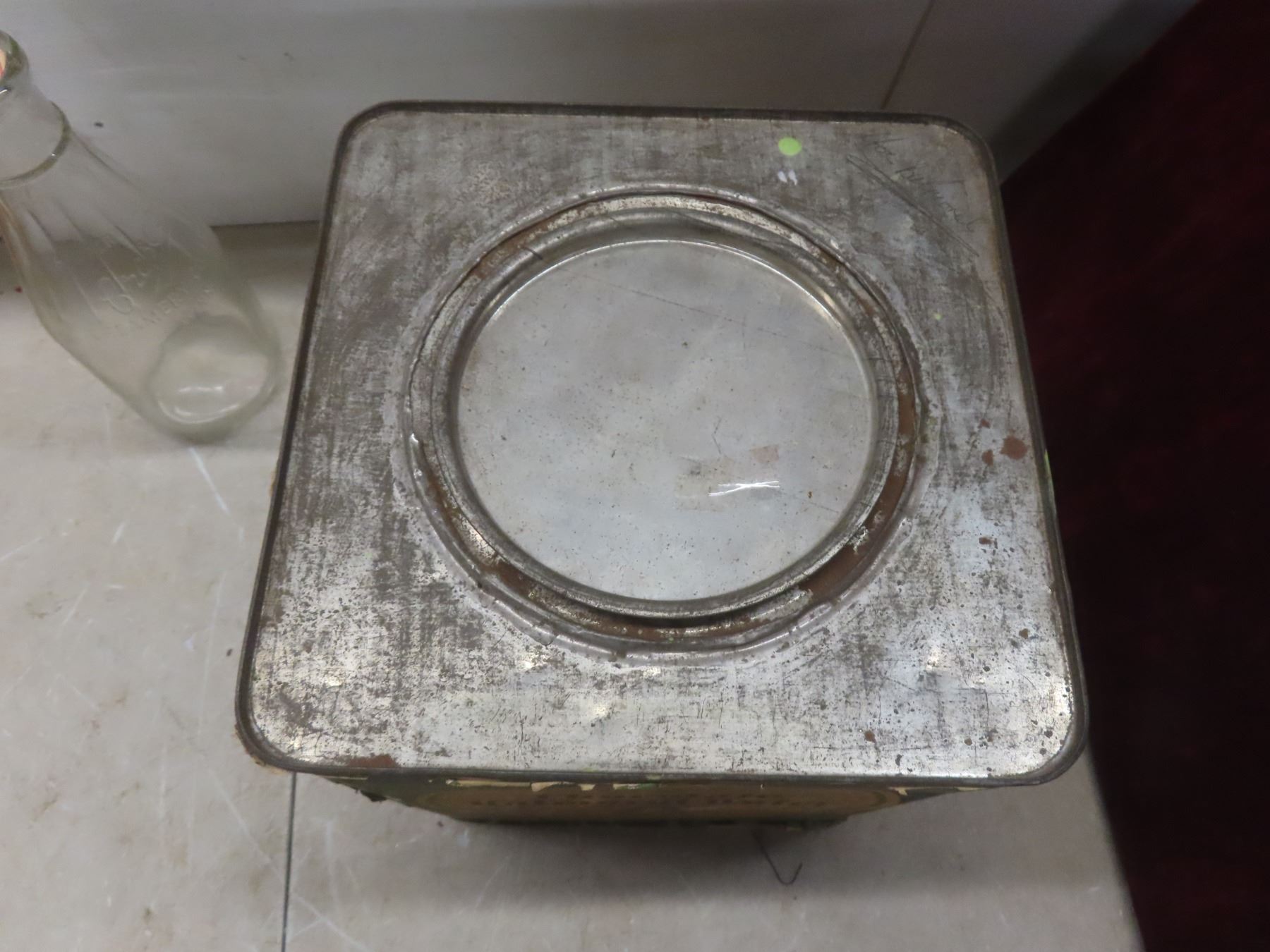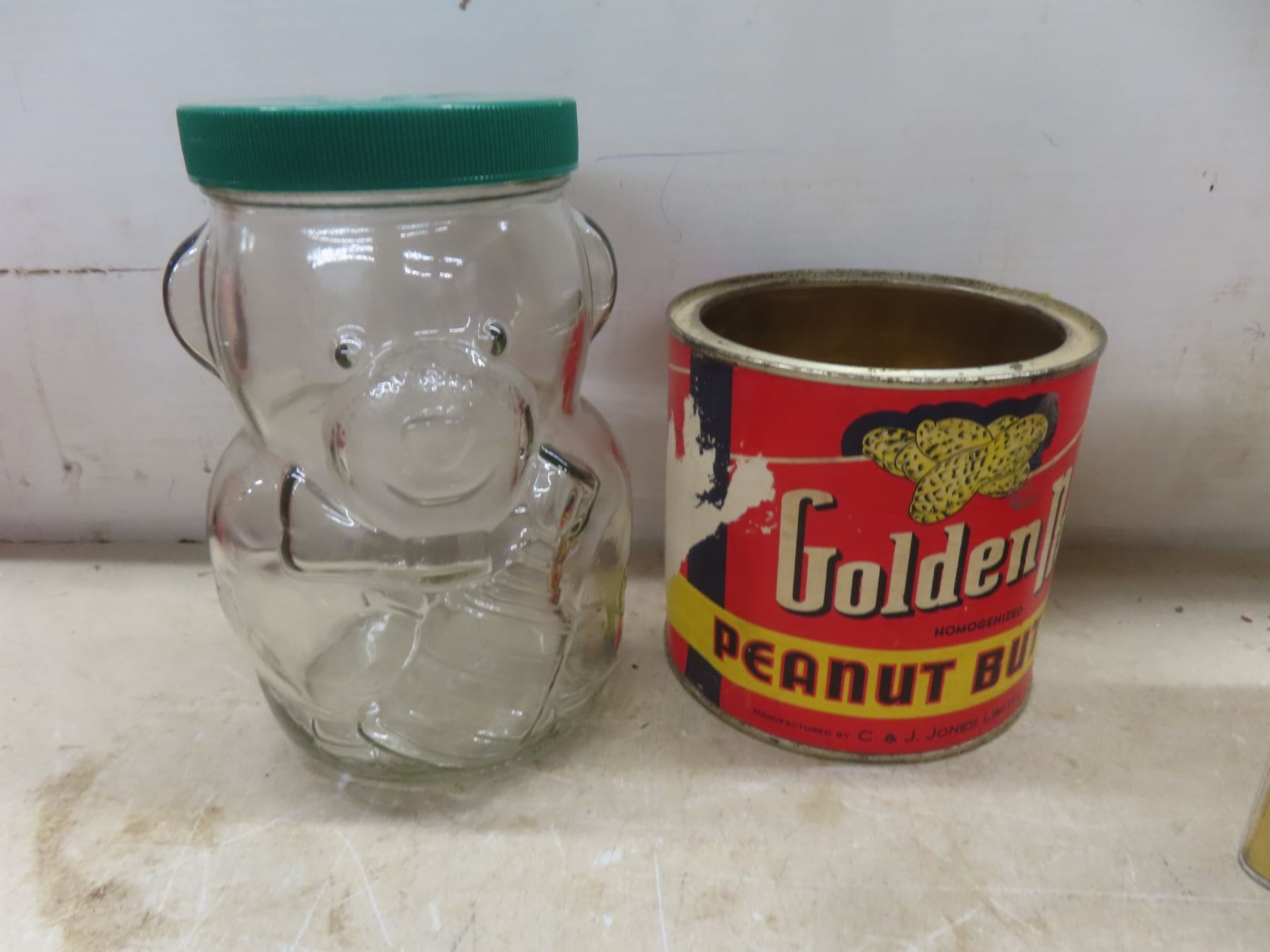 Vintage Candy And Biscuit Tins; Peanut Butter Glass Jar; And Milk Bottle.