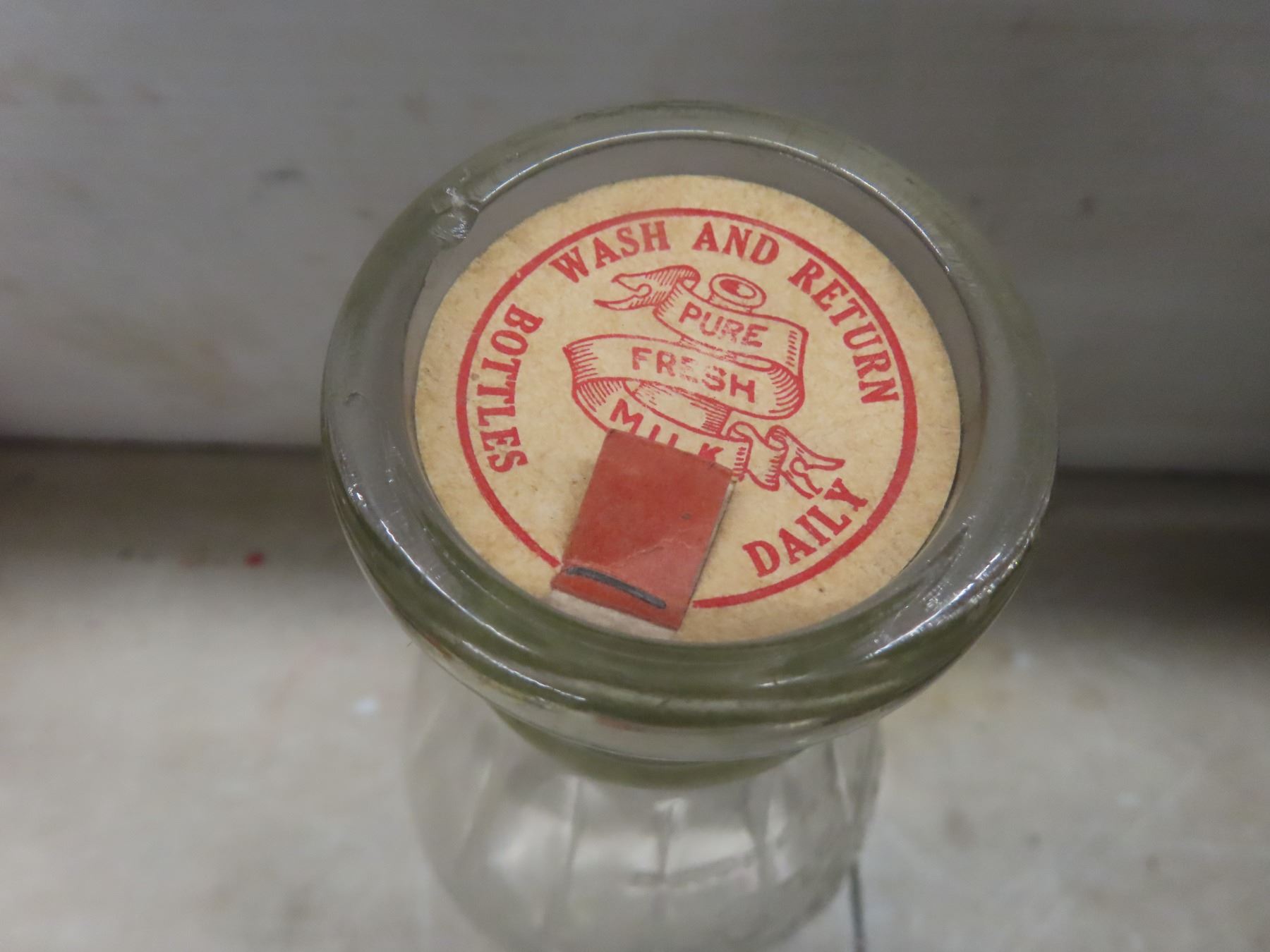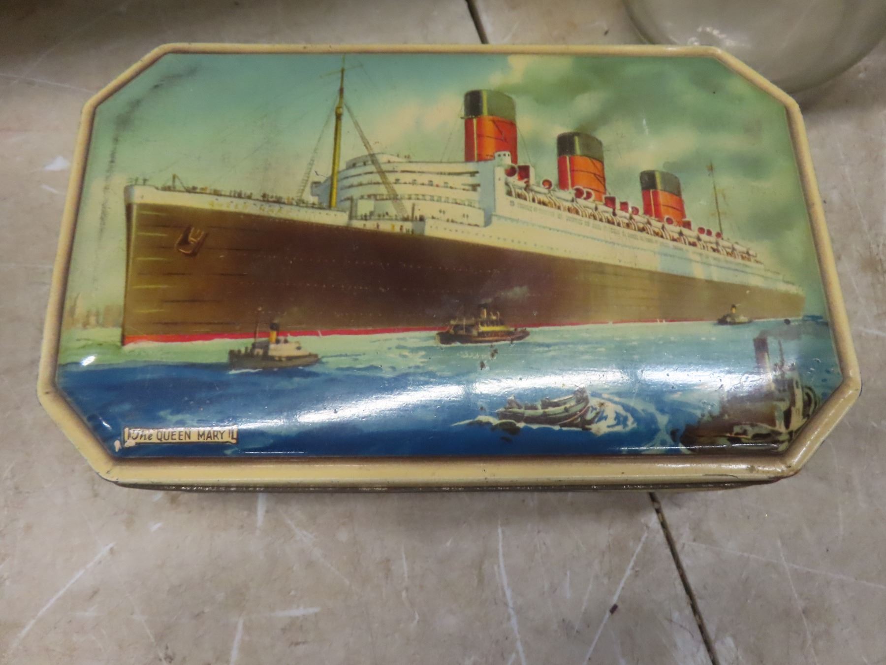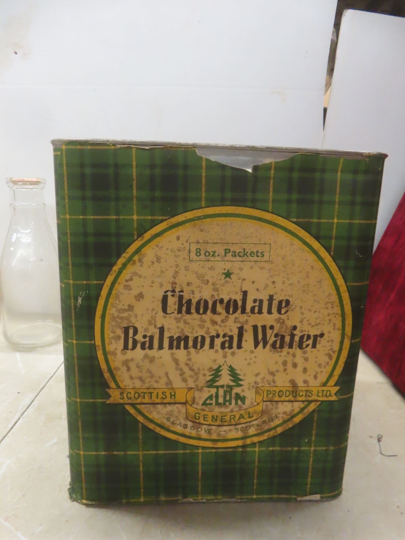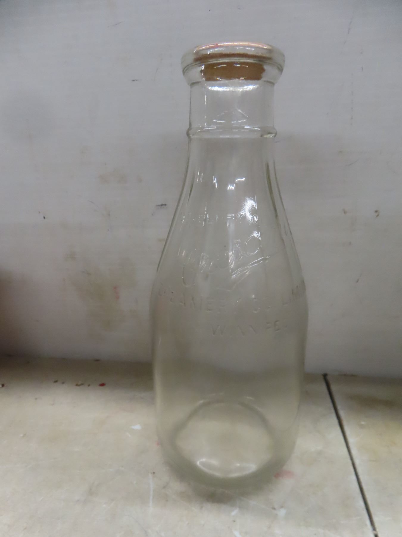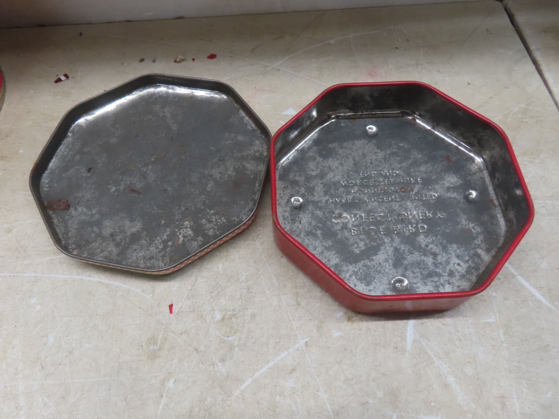 Vintage Candy And Biscuit Tins; Peanut Butter Glass Jar; And Milk Bottle.