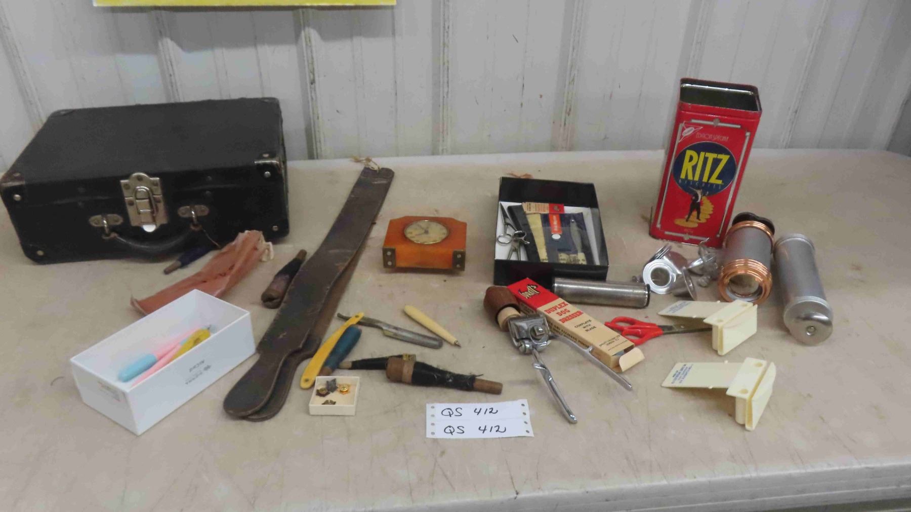 Vintage Carry Case, Cookie Press with Attachments, Vintage Wind-Up Alarm Clock, Barber Tools & More