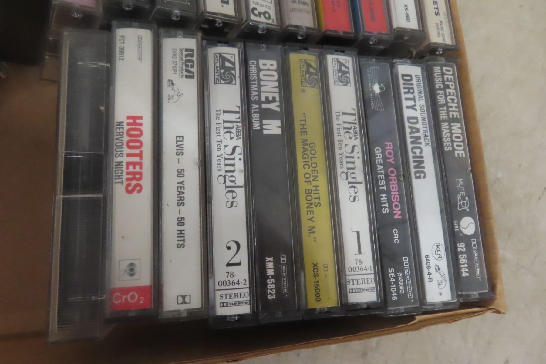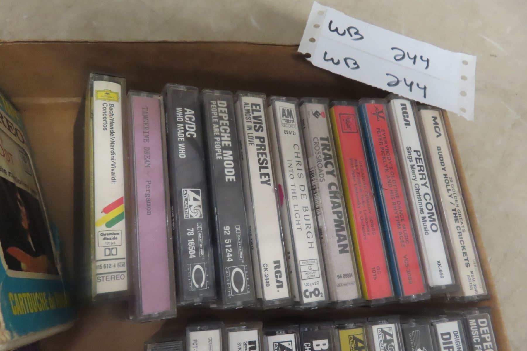 Vintage Cassette Tape Lot with Sealed Titanic VHS and Artists Including AC/DC, Hooters, Elvis, Roy Orbison, and Buddy Holly