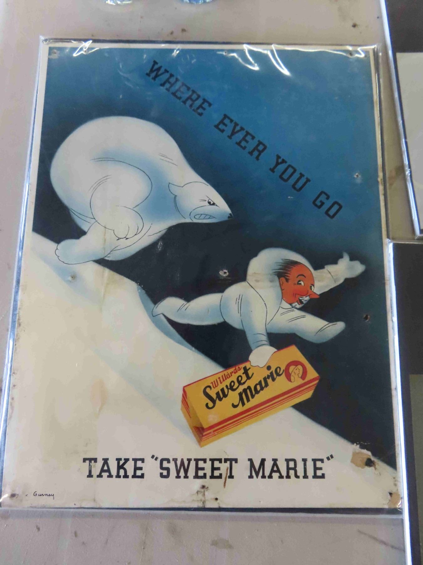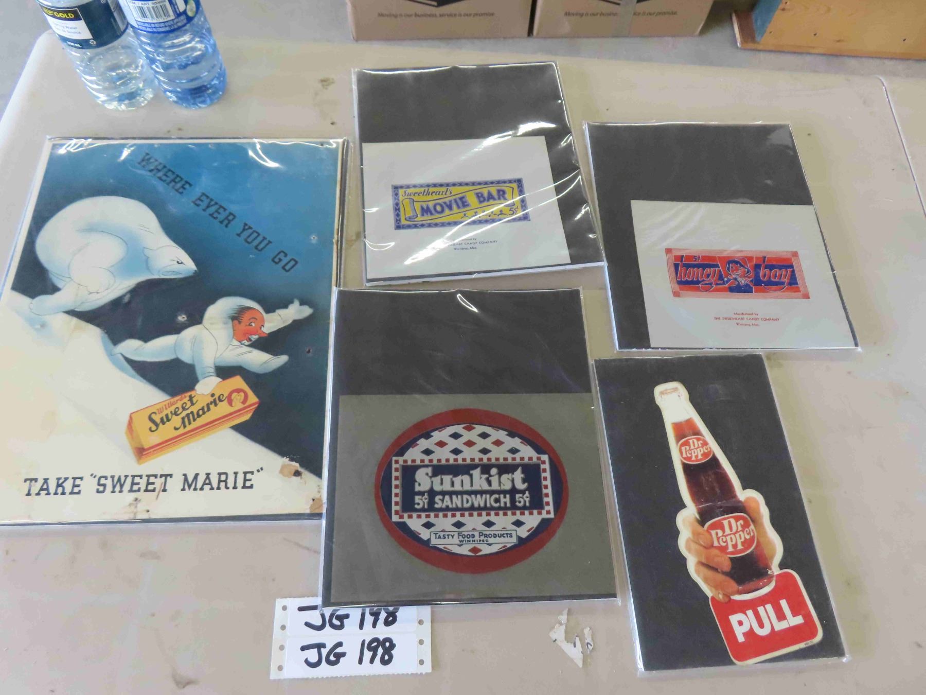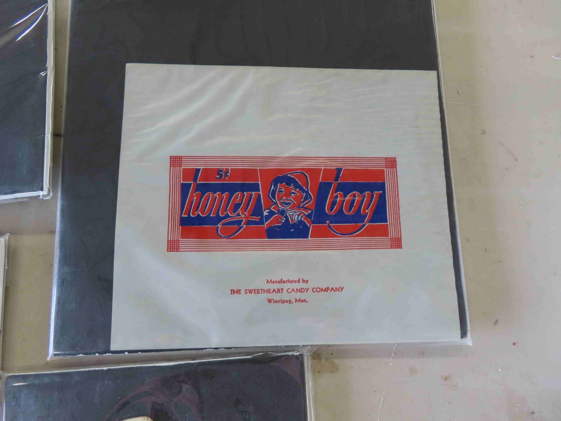 Vintage Chocolate Bar Advertising from Winnipeg; Sweet Marie Cardboard Sign, Sweetheart's Movie Bar 5c Wrapper, Sunkist Sandwich 5c Wrapper, Honey Boy Wrapper, Dr. Pepper Door Sticker