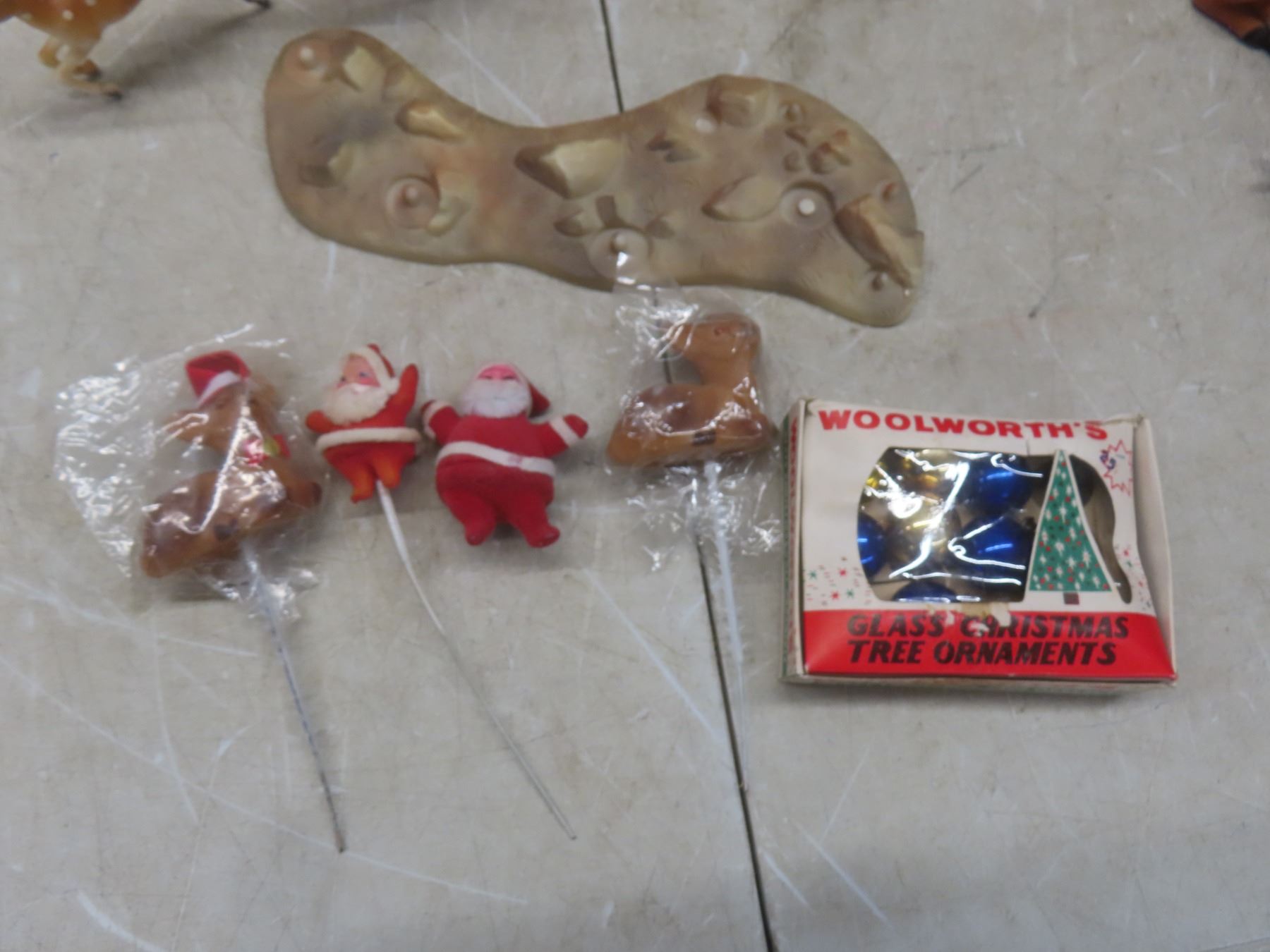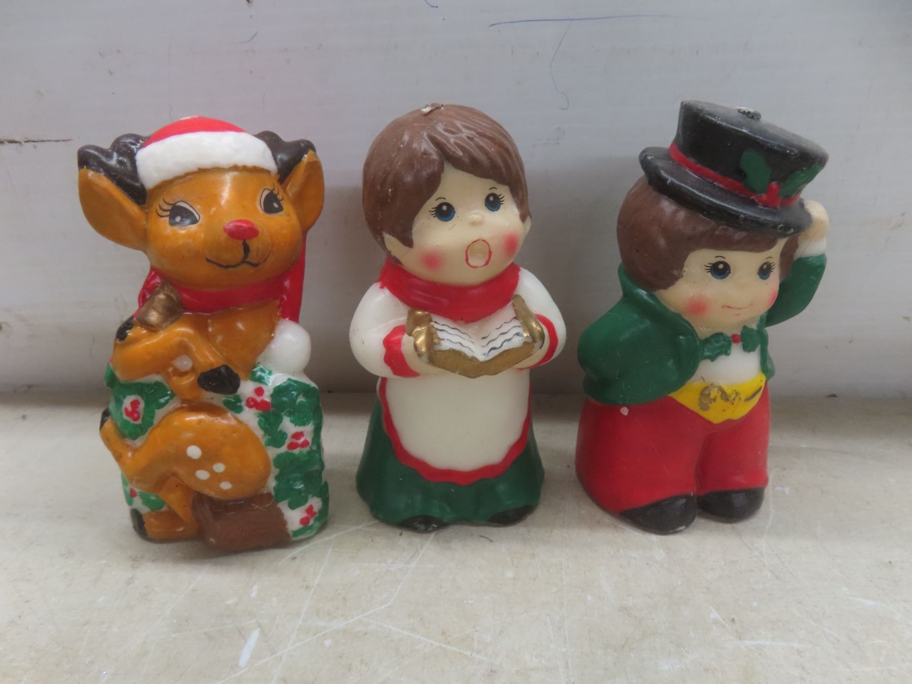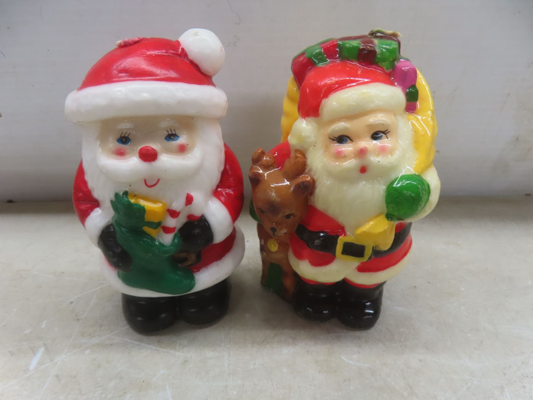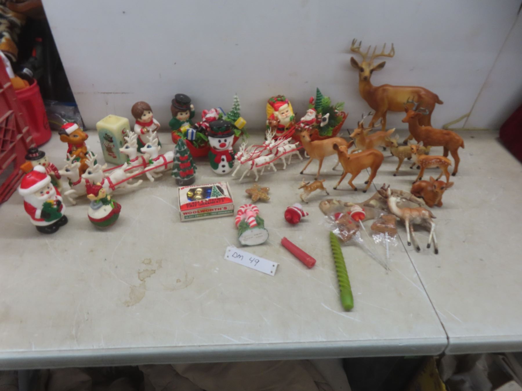 Vintage Christmas Décor Lot Including Santa and Reindeer Figures, Deer Family, and Unused Christmas Candles