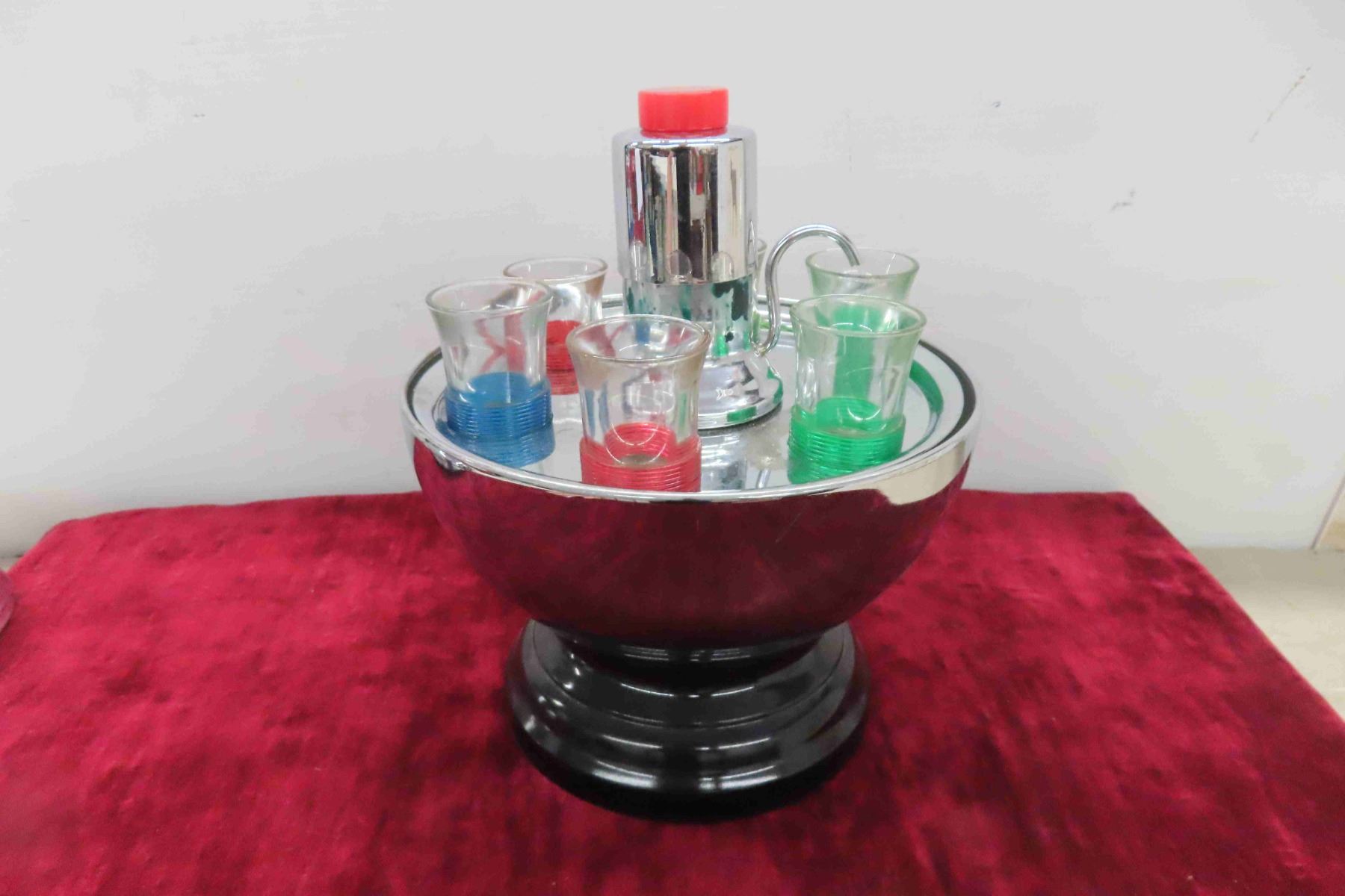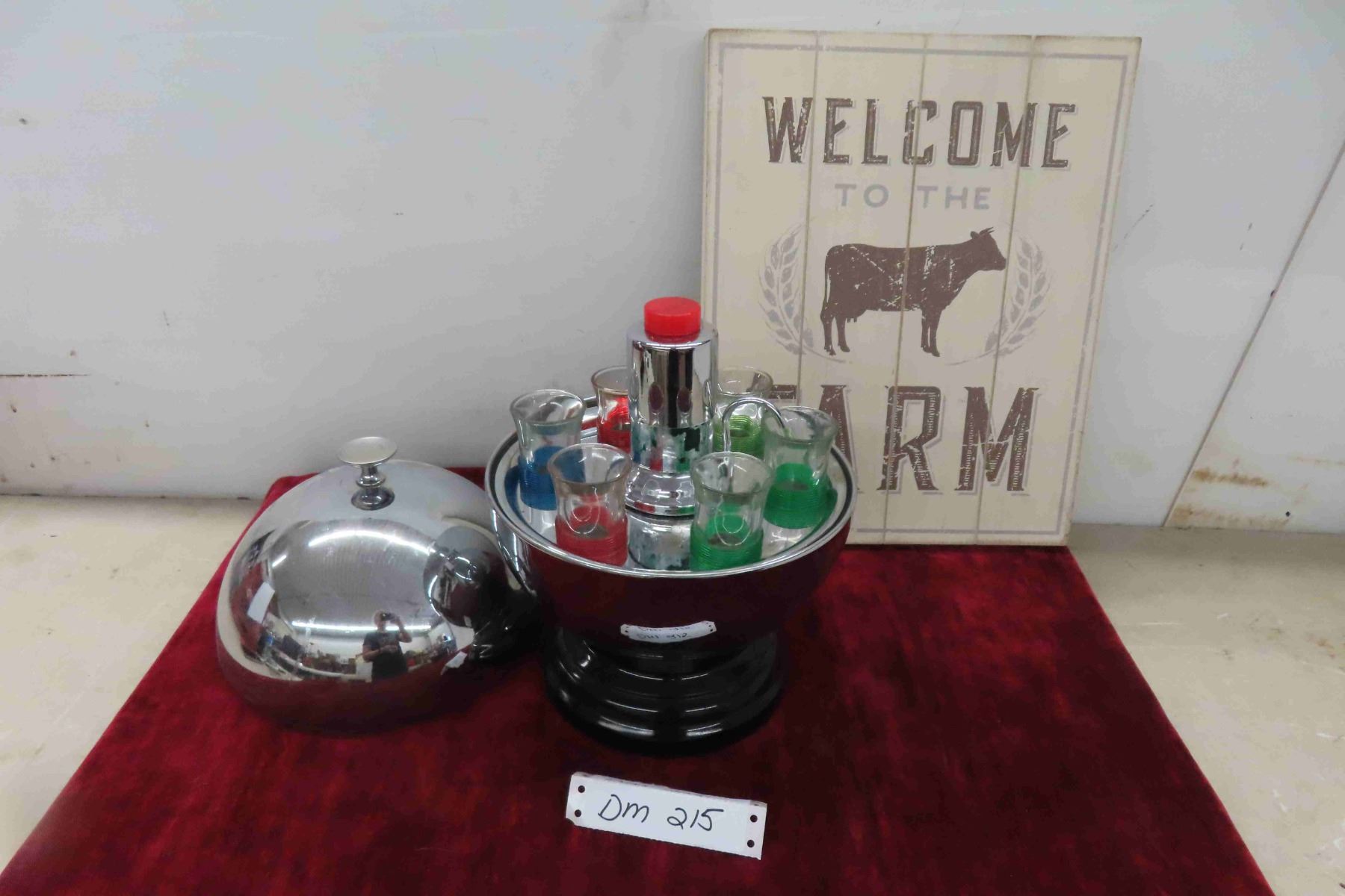 Vintage Chrome Liquor Pump with Shot Glasses, Wood Welcome Sign 15x12