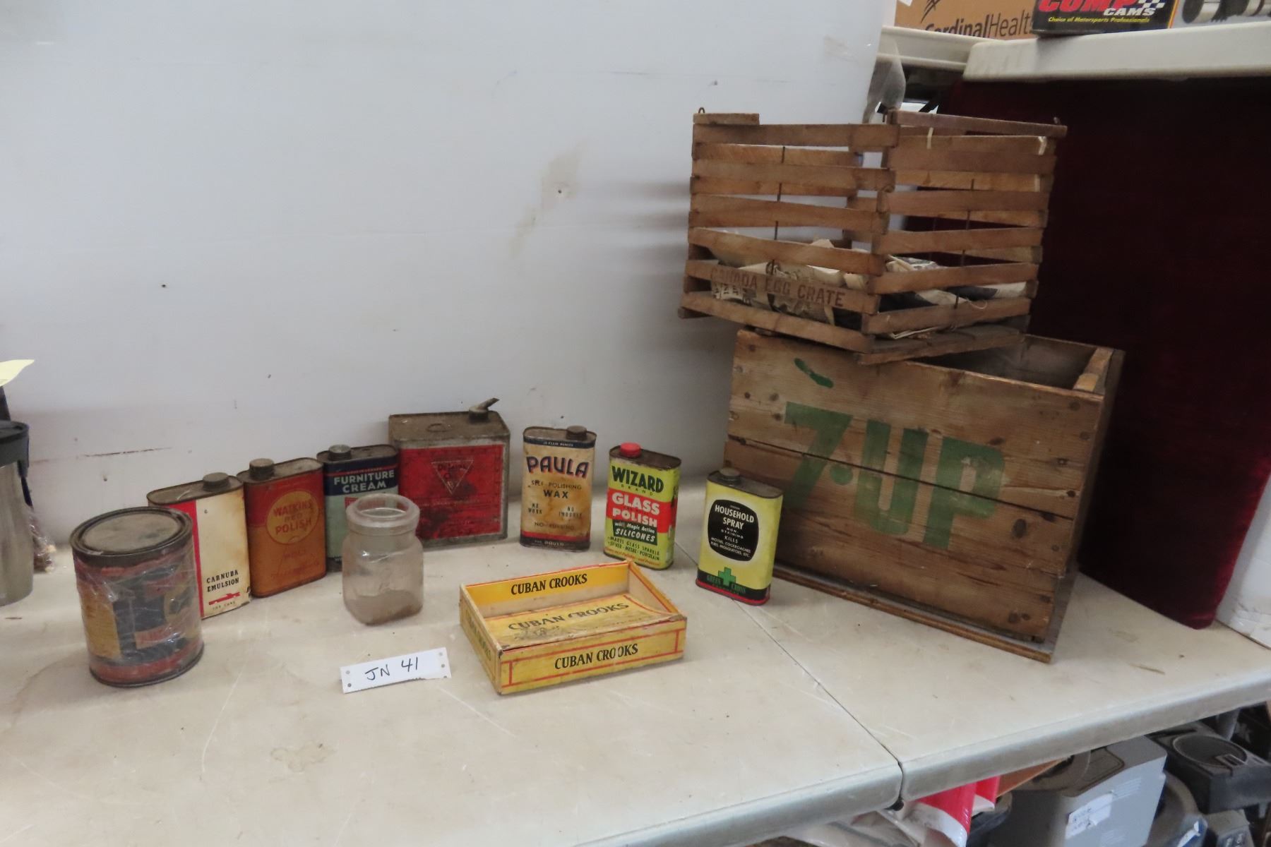 Vintage Cleaning Product Tins, 7up Wood Crate 12x17x12 and Egg Crate