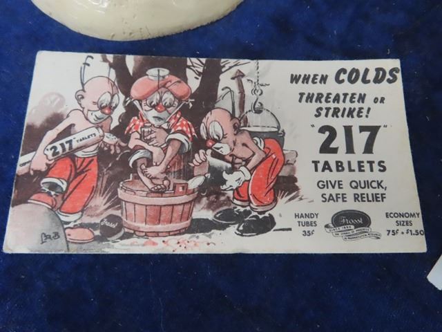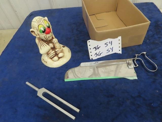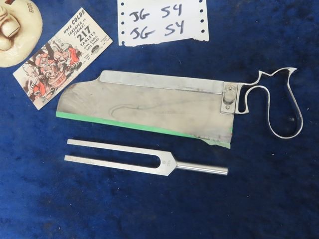 Vintage Composite Dingbat Figure with Medical Advertising Frosst & Exdol, Surgical Bone Saw, Doctor's Hearing Tuning Fork & Vintage Blotter