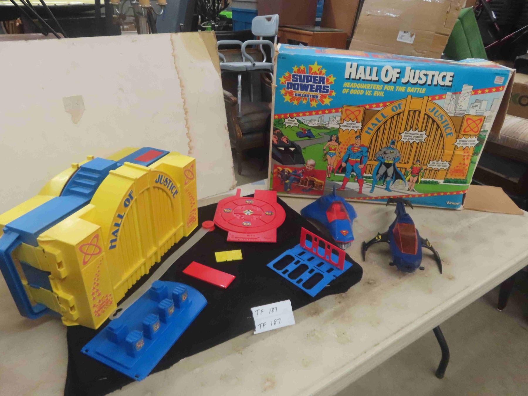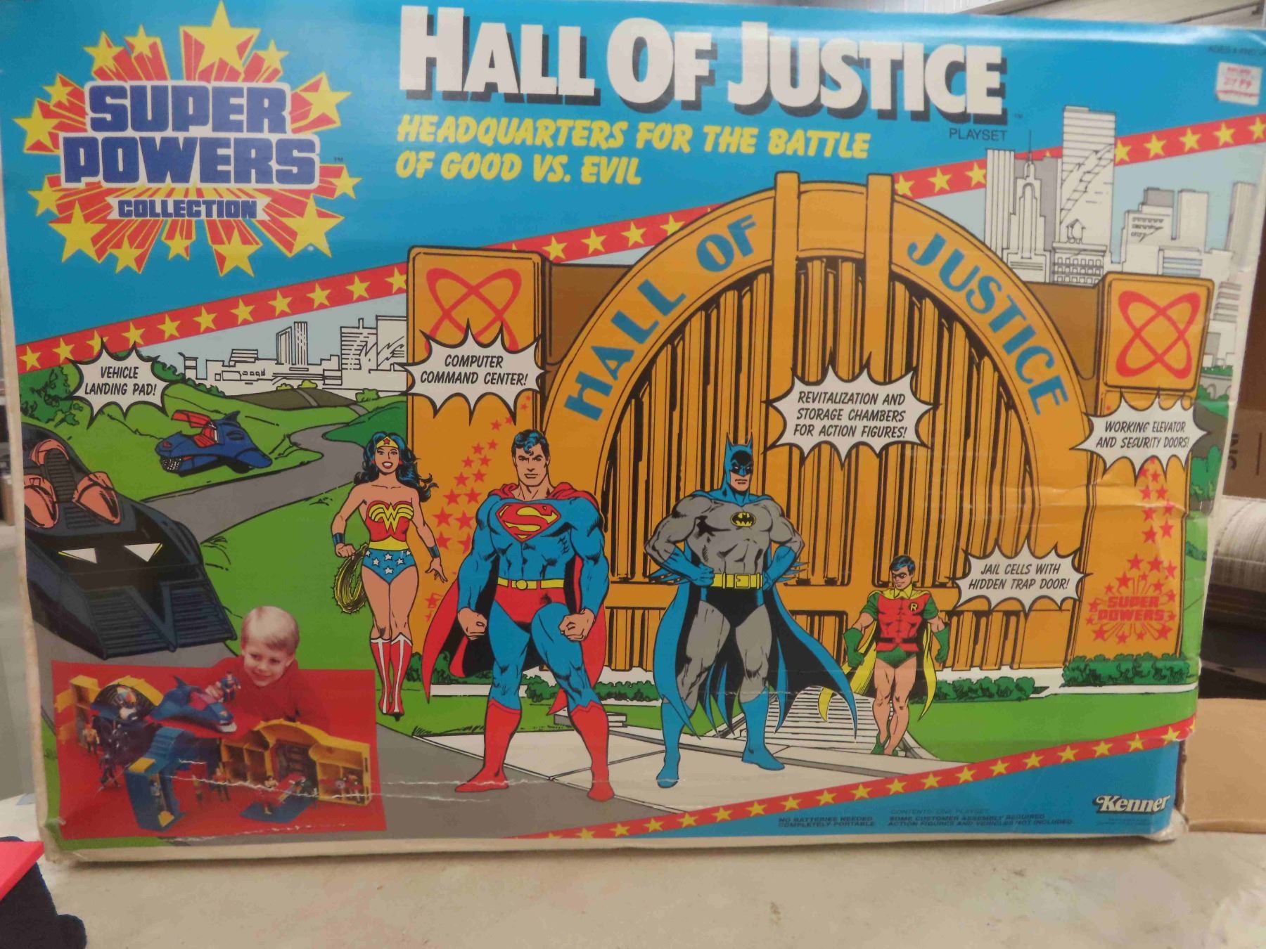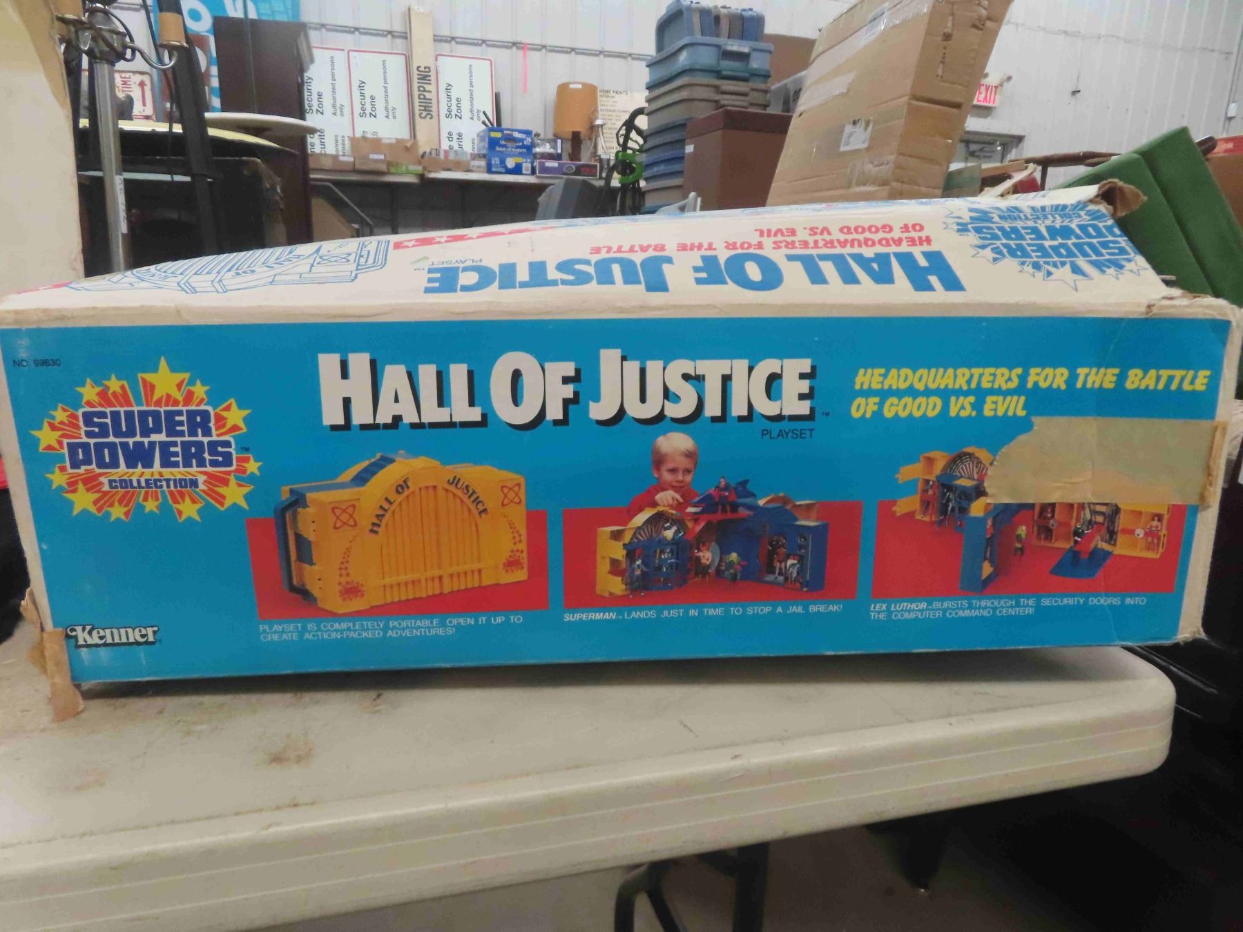 Vintage DC Super Powers Collection Hall of Justice - has most Decals, Vehicle Pad, Trap Doors, Elevators - Great Condition, Also Has Original Box, The Batcopter & Super Jet