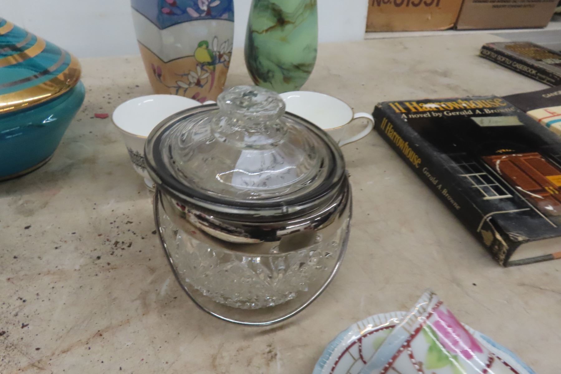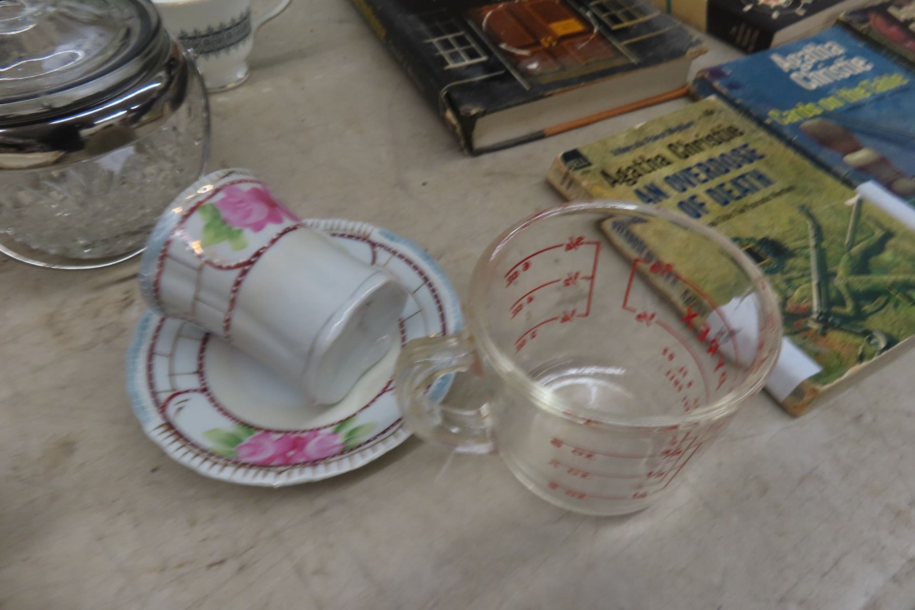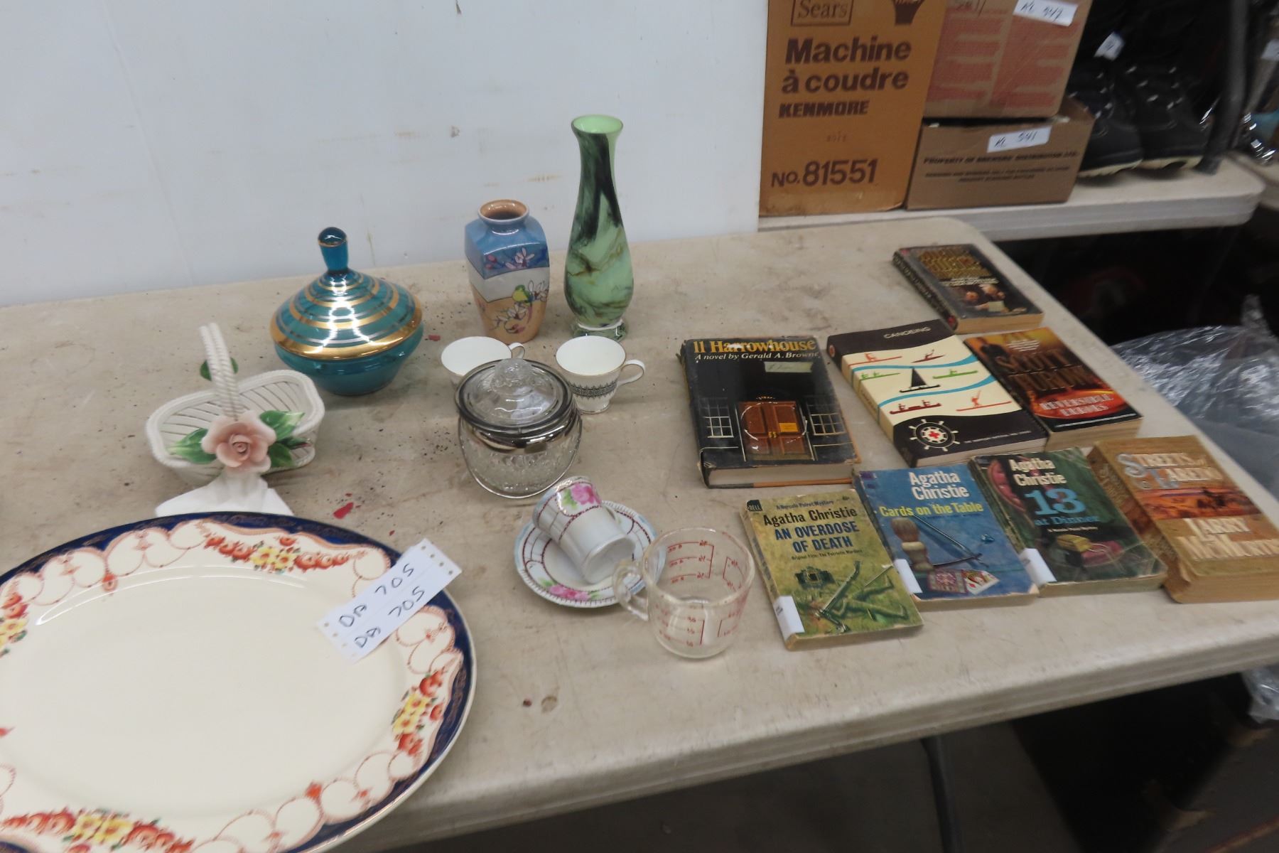 Vintage Diamond I Indiana Glass, Art Glass Vase, Candy Dish, China Cream/Sugar, Platter, Pyrex Measuring Cup, Books