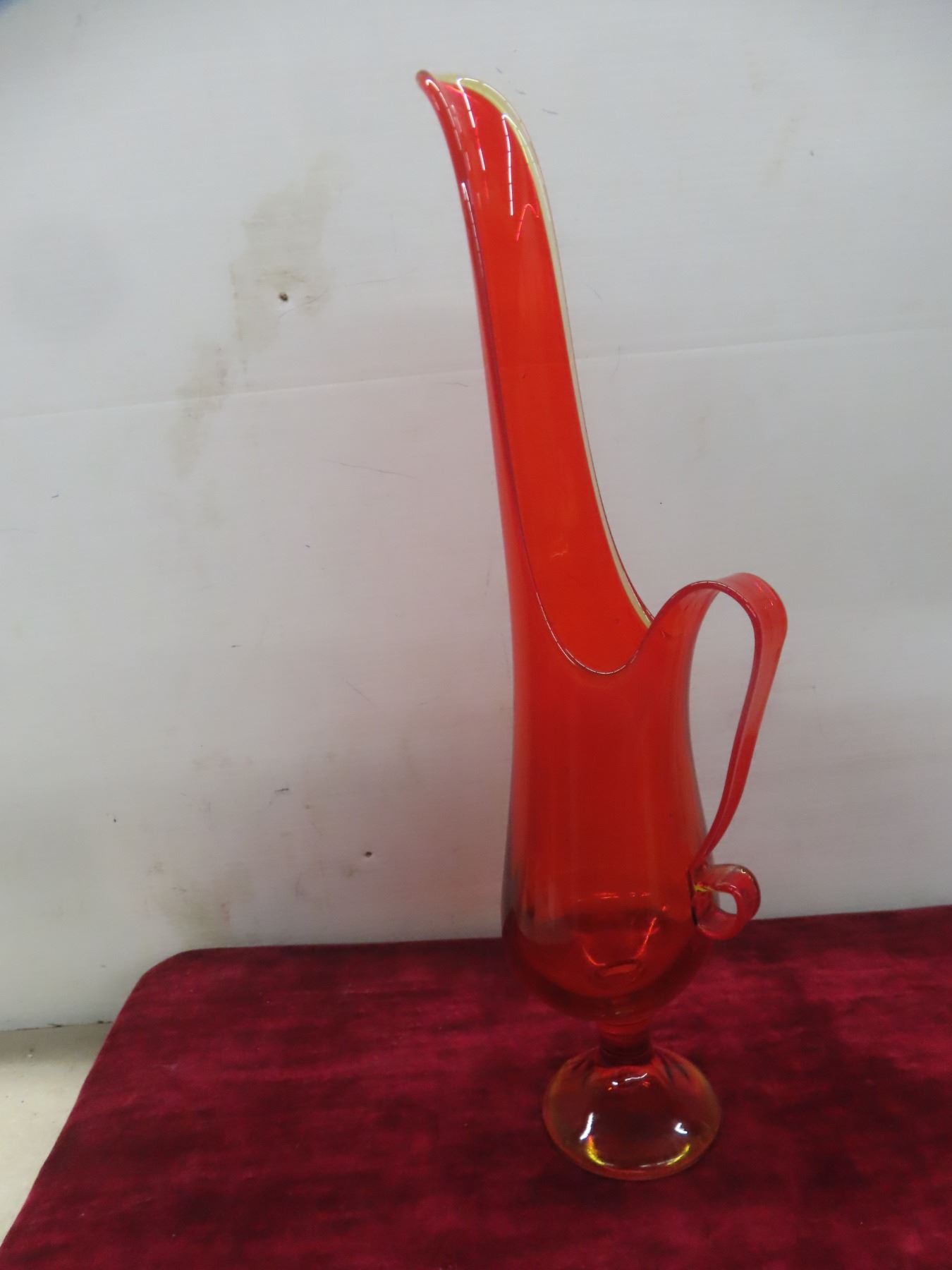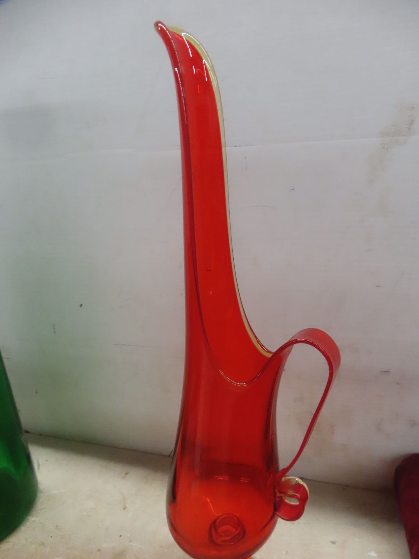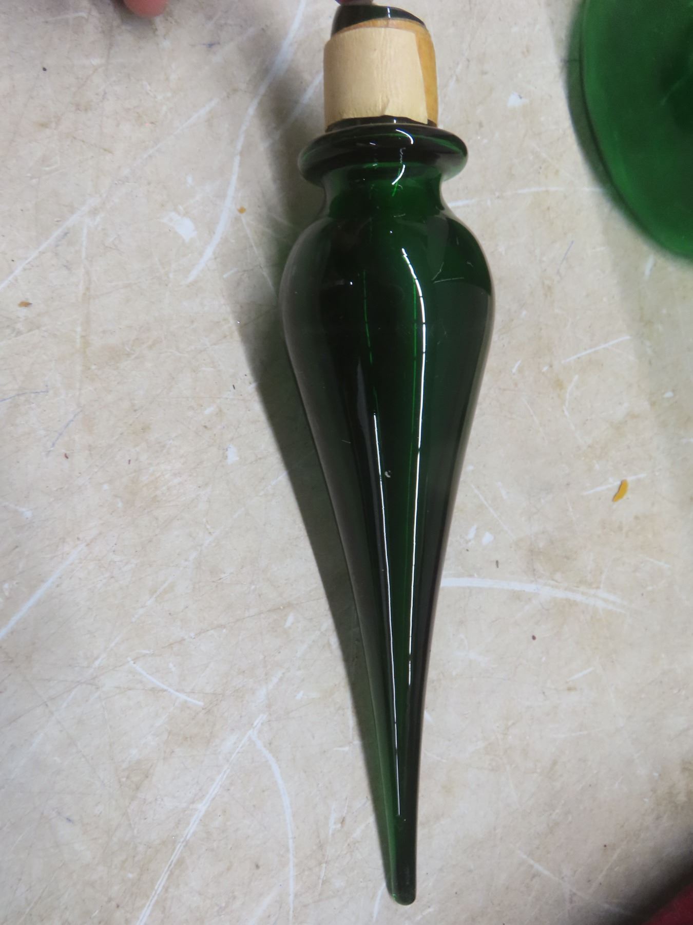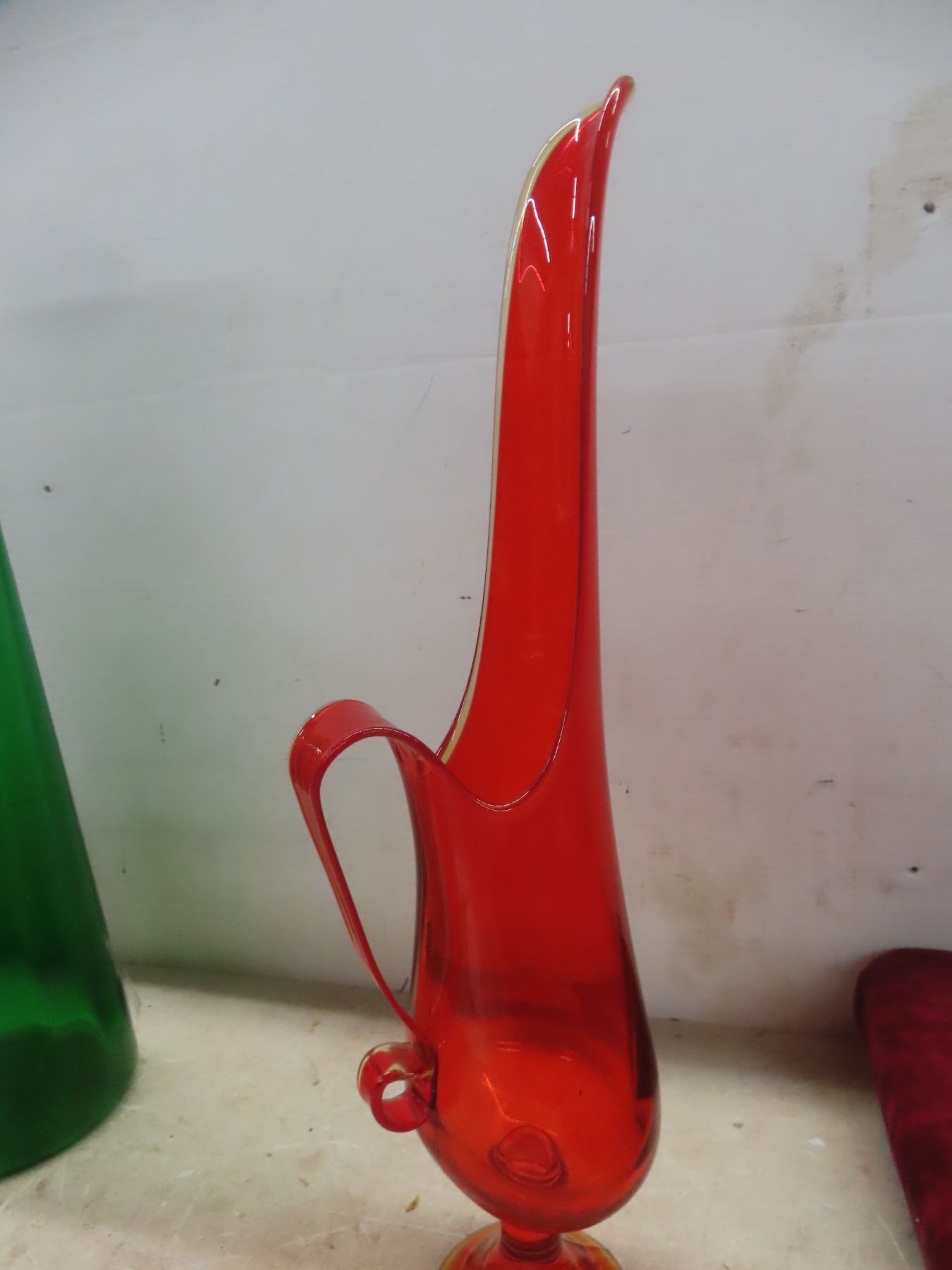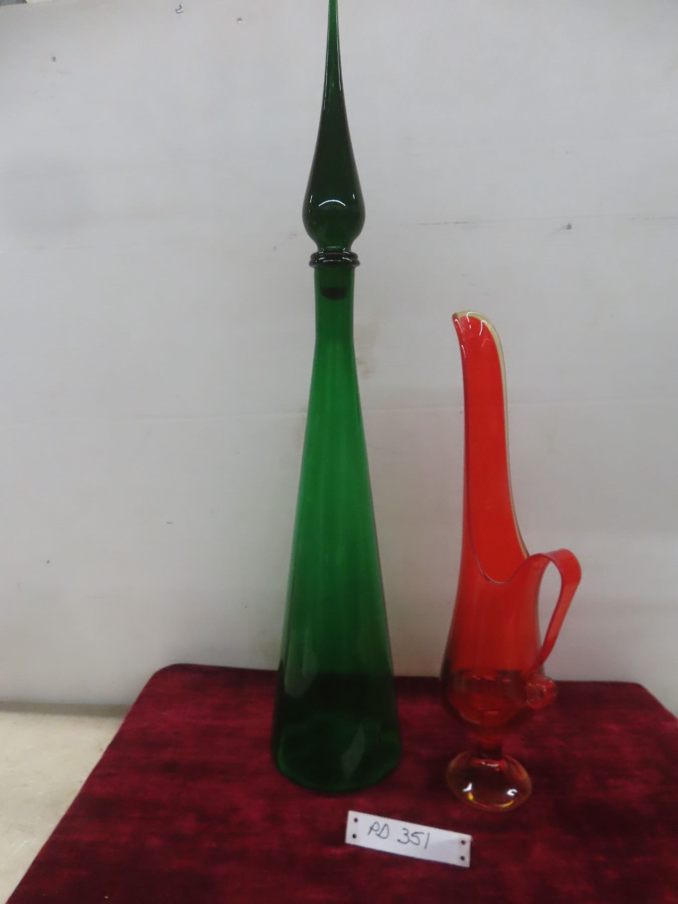 Vintage Emerald-Green Genie-Bottle Decanter And Amberina Stretch Art-Glass Pitcher.