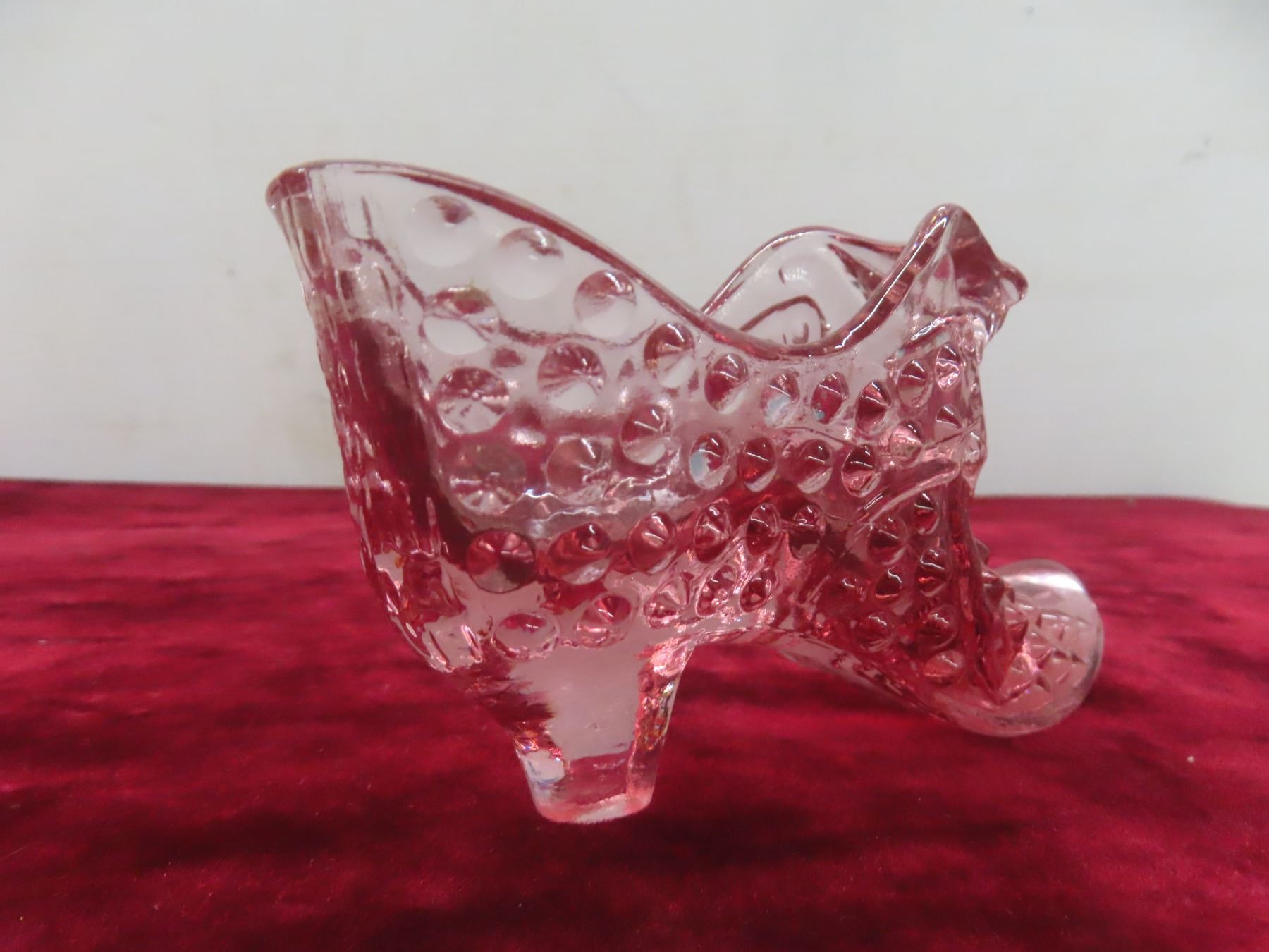 Vintage Fenton Cobalt Blue Daisy and Button Shoe Boot + Pink Rose Art Glass Hobnail Cat Head Slipper Shoe