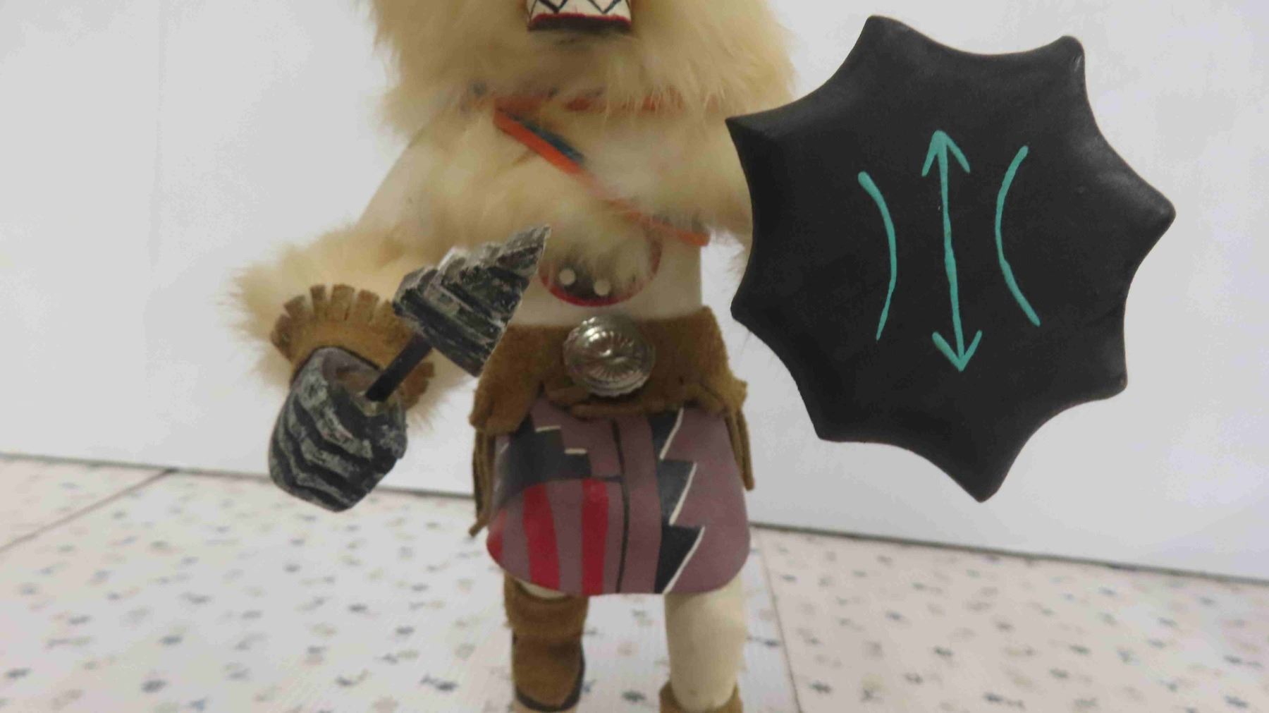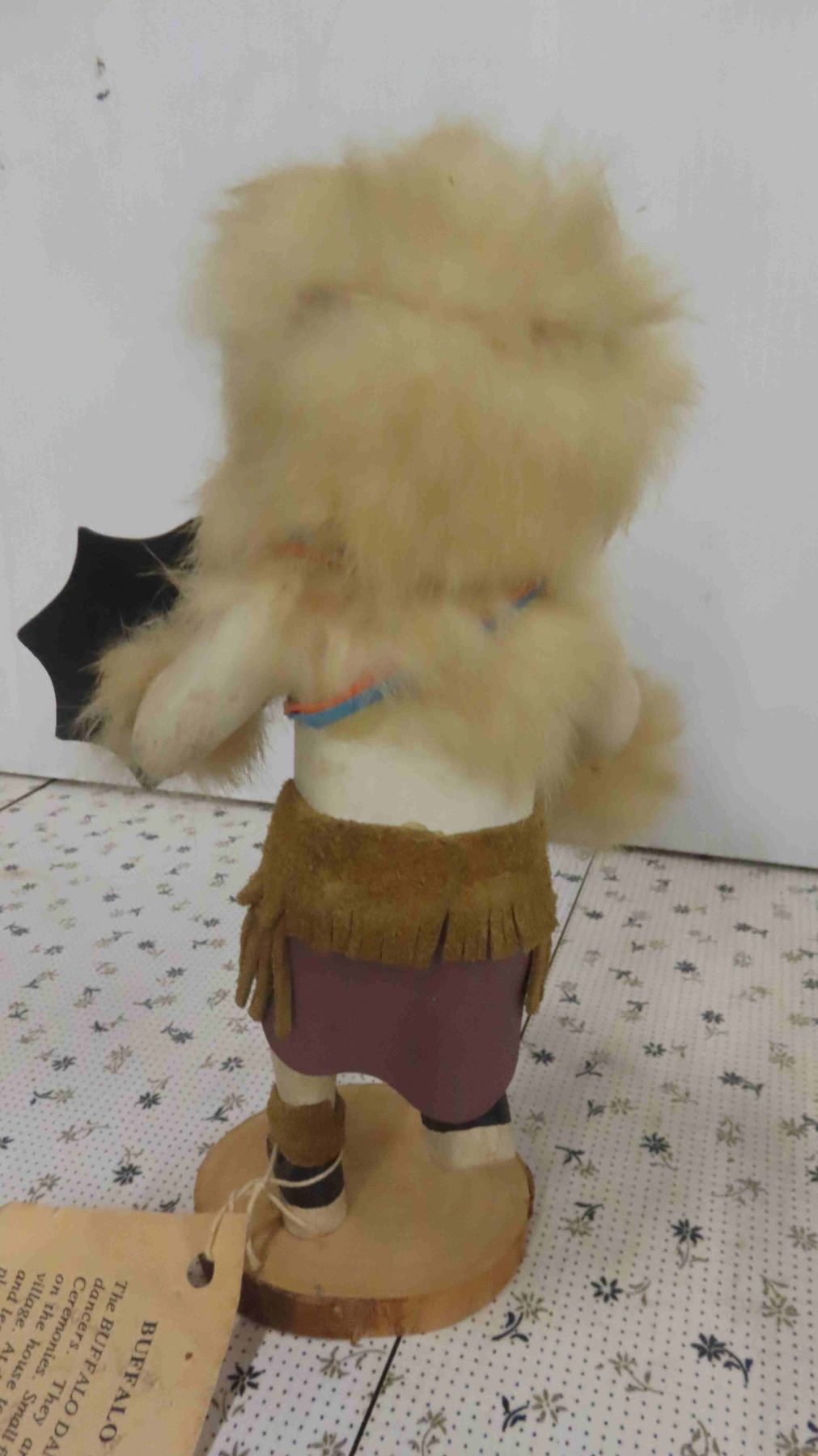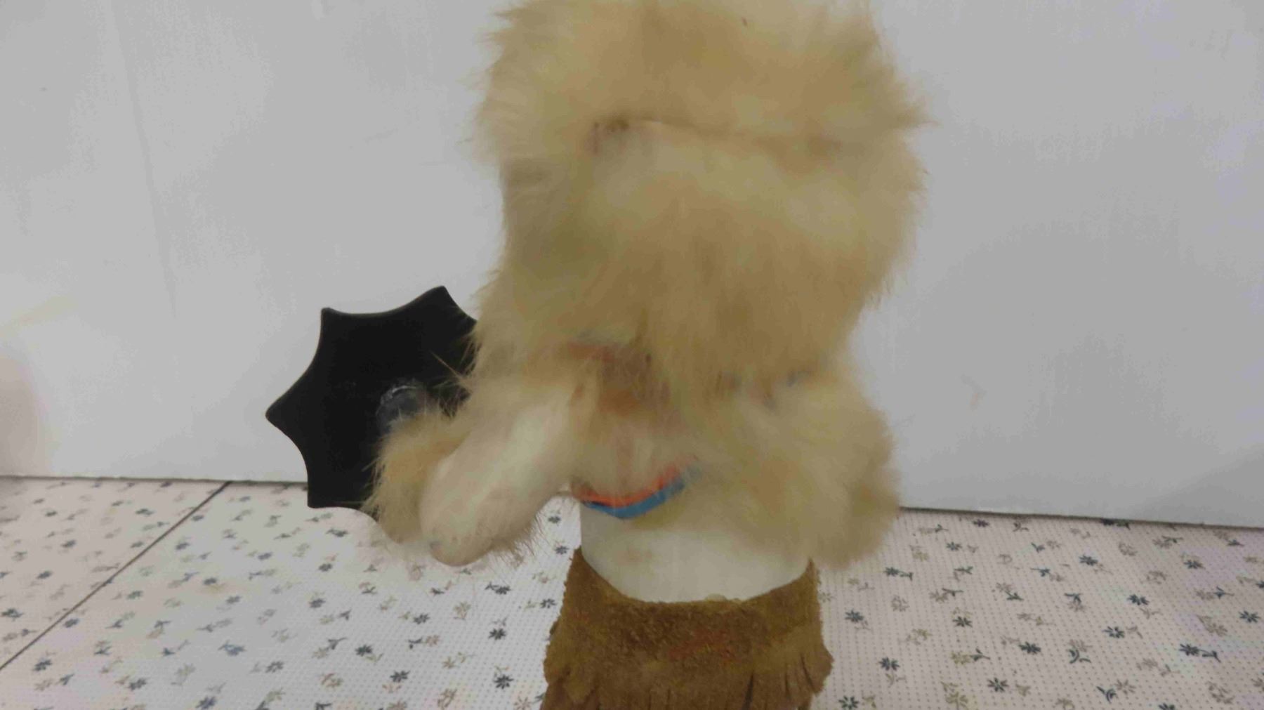 Vintage First Nations Carved Wood Buffalo Dancer Figure 9'' Tall with Weapons - Fur, Leather & Wood Construction, Has Original Tag