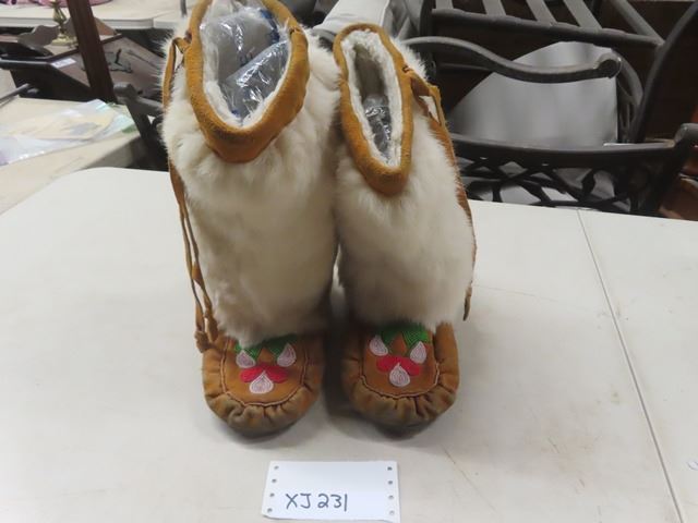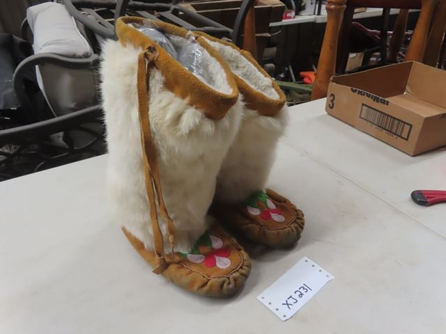 Vintage First Nations Leather Beaded Moccasins/ Mukluks - Real Fur , Professional Rubber Soles 14" Tall - Men's Sz 9 or Ladies 11 - Like New Condition