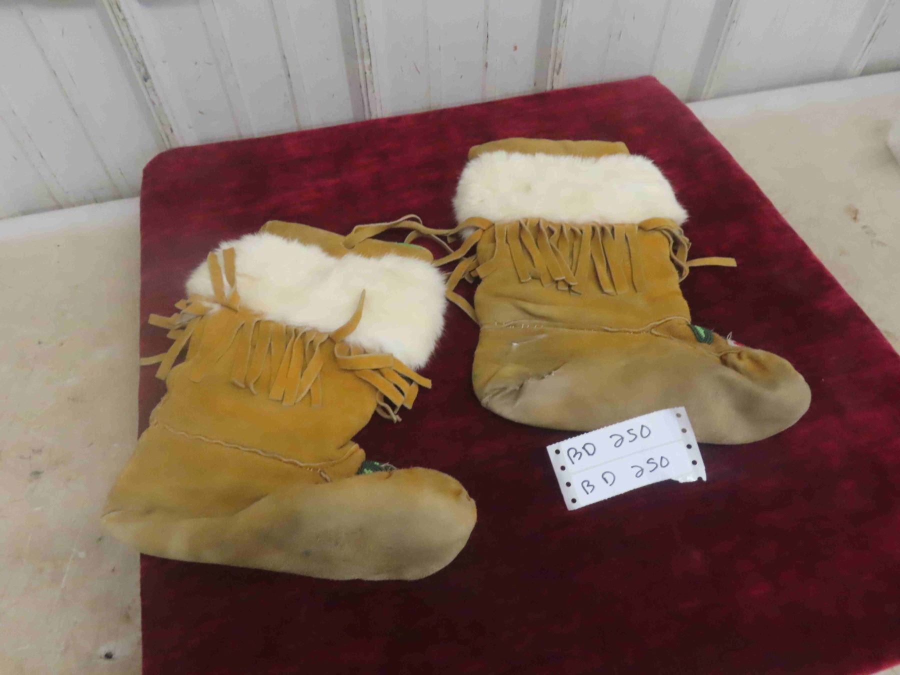 Vintage First Nations Metis Floral Beaded Bucksaw and Rabbit Fur Fringed Mukluks