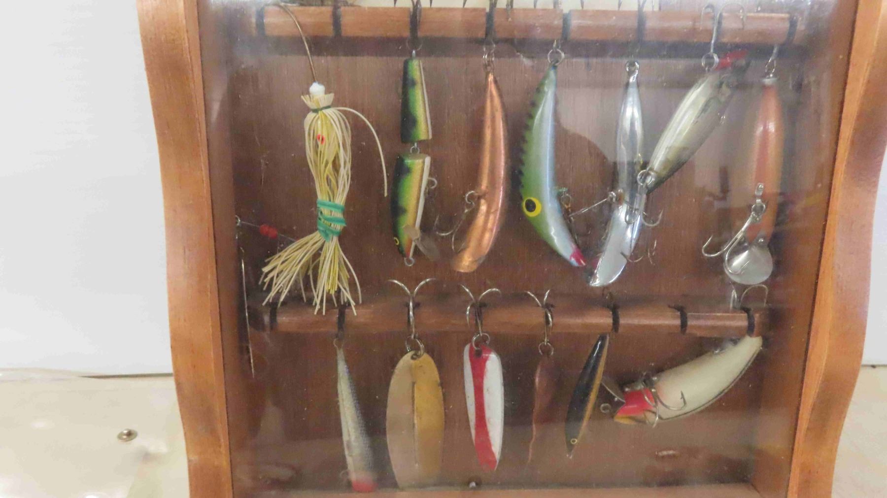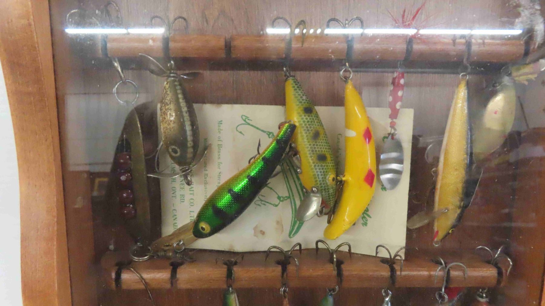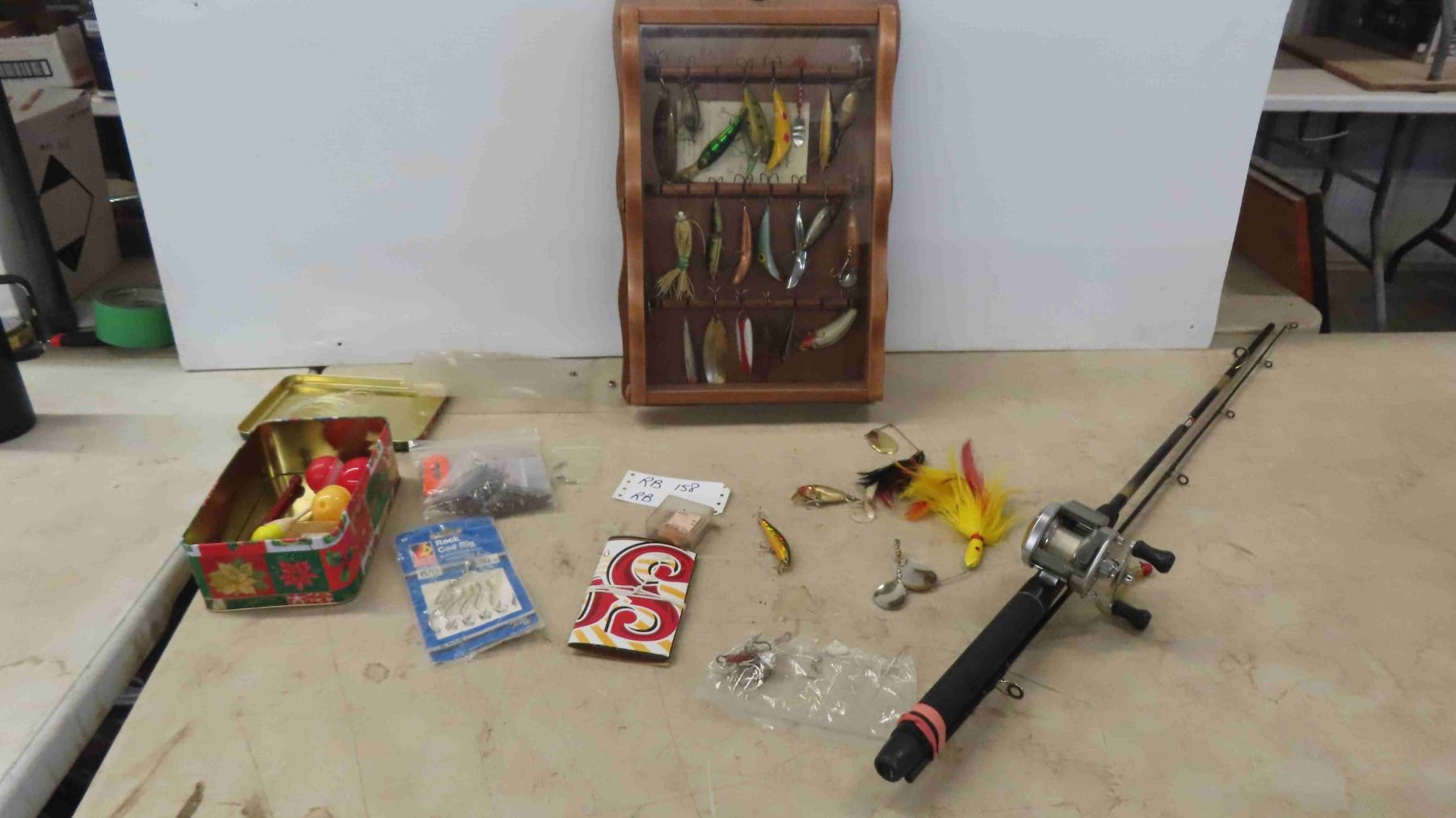 Vintage Fishing Gear ; Wooden Case with Lures, Rook Quantium Reel, Bobbers,
