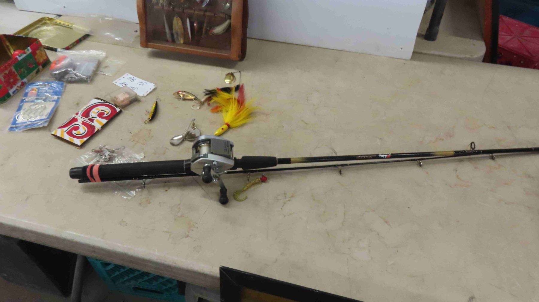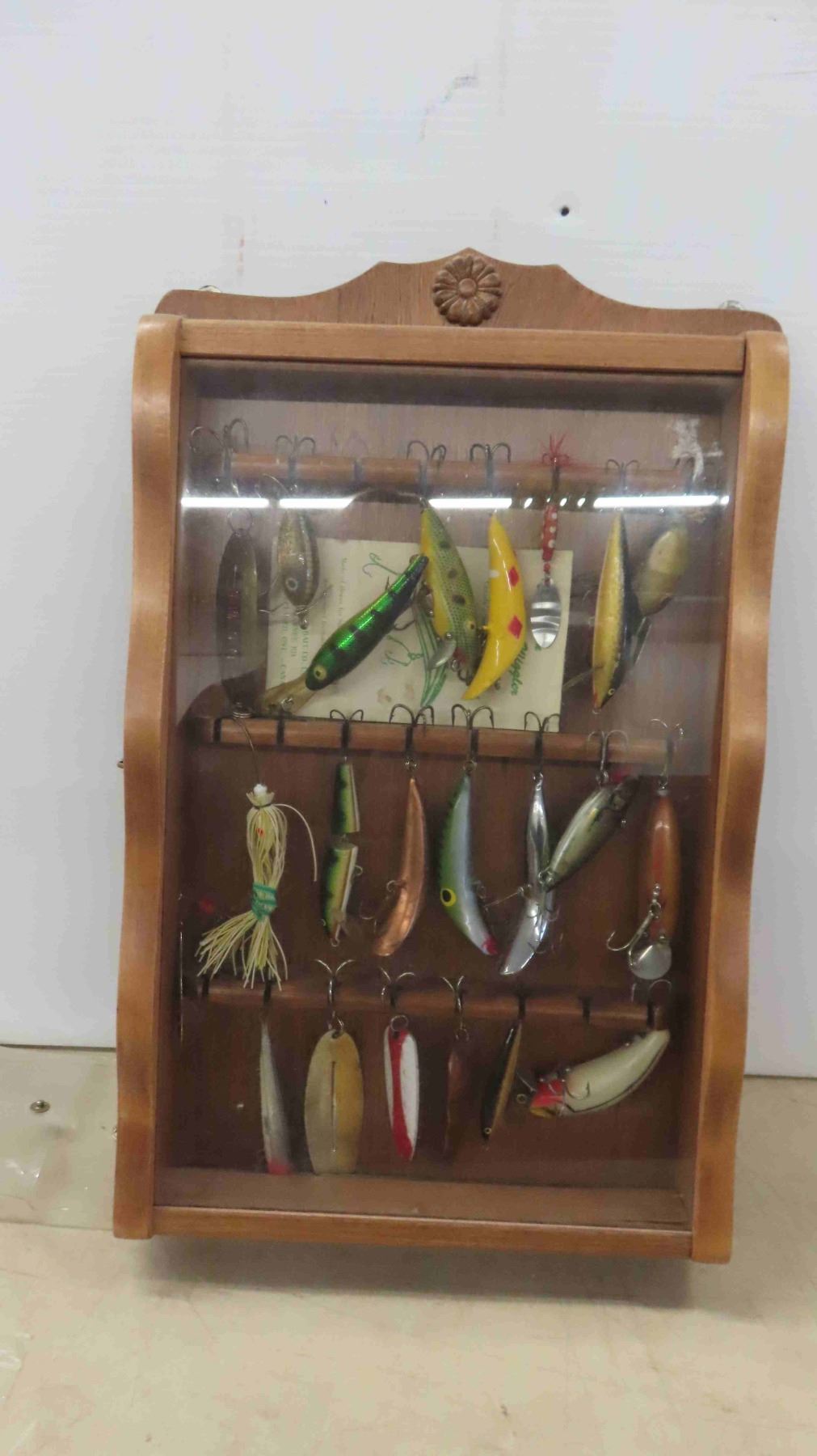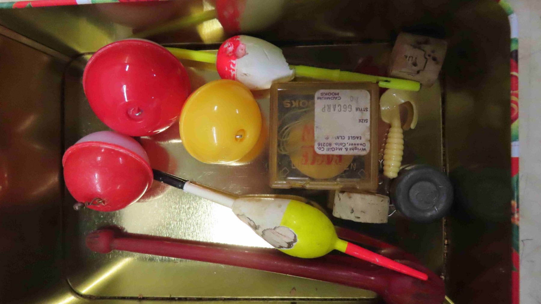Vintage Fishing Gear ; Wooden Case with Lures, Rook Quantium Reel, Bobbers,