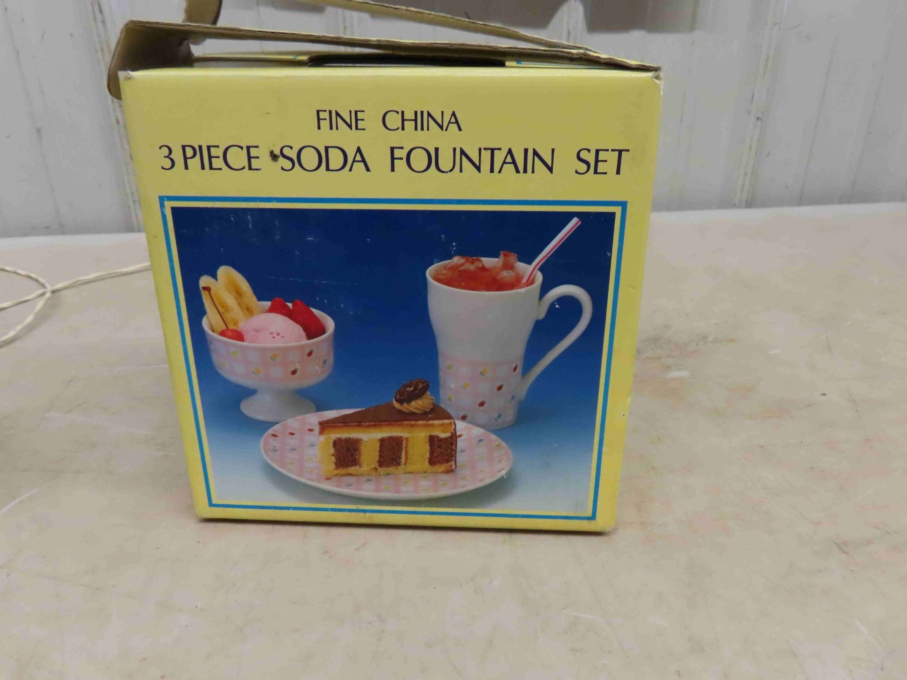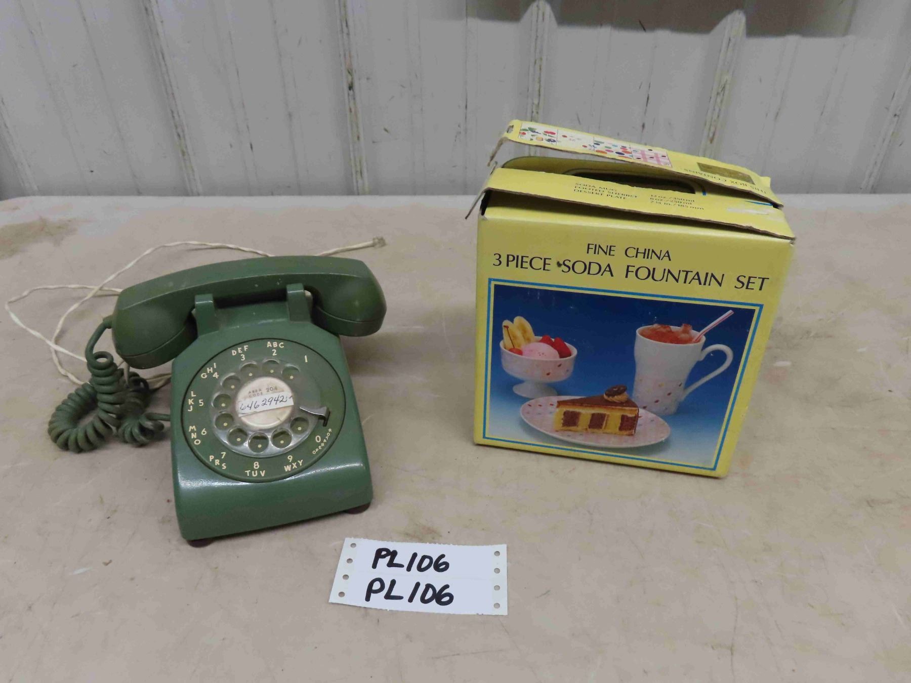 Vintage Green Rotary Dial Table Phone, Fine China 3pc Soda Fountain Set in Box
