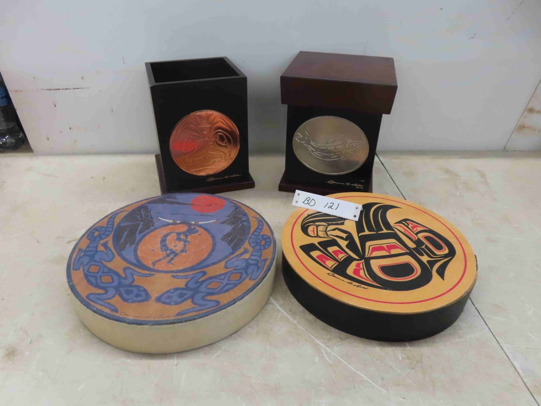Vintage Haida First Nations Boxes by Clarence Mills, Plus Indigenous Drum by Him