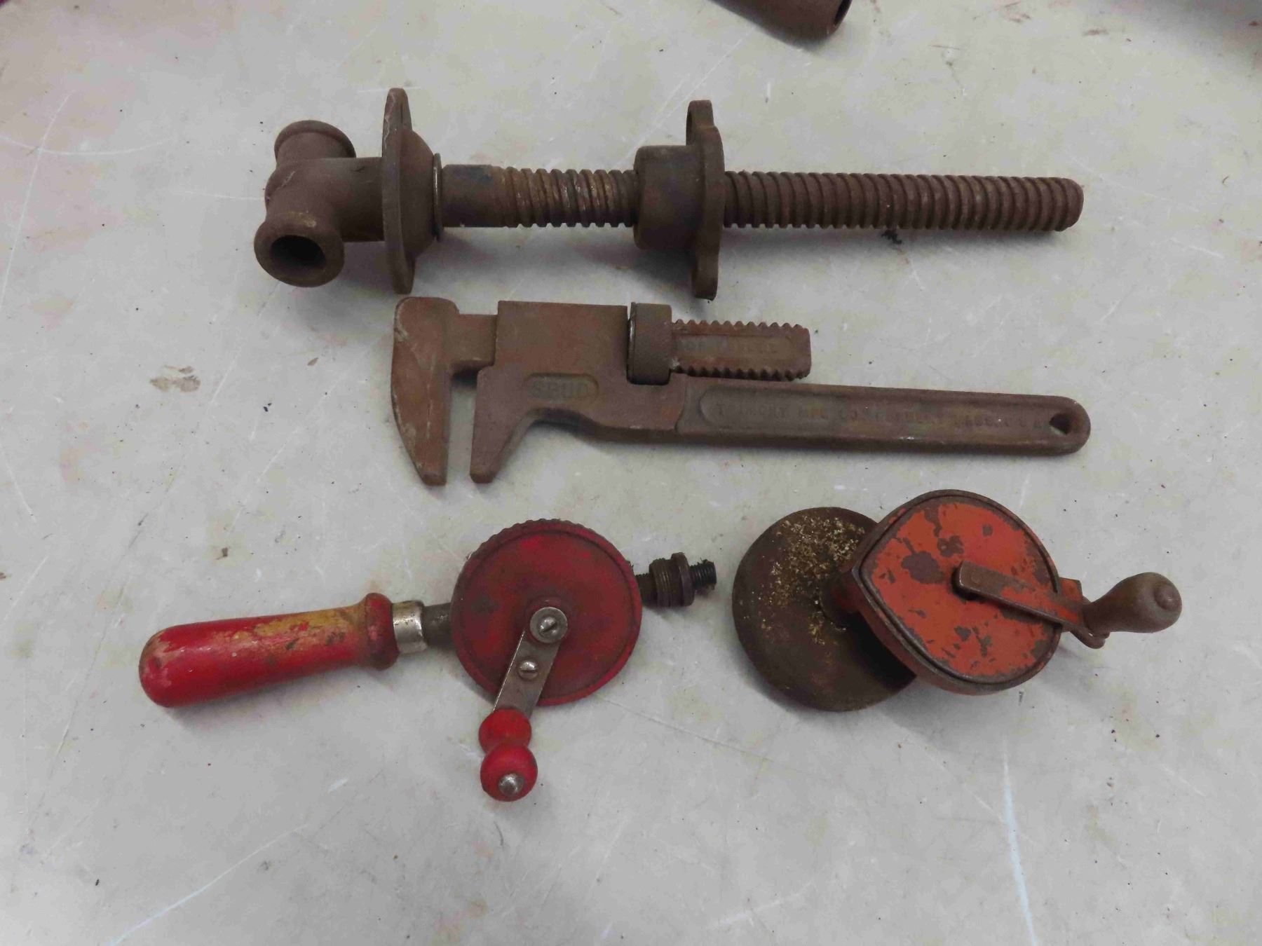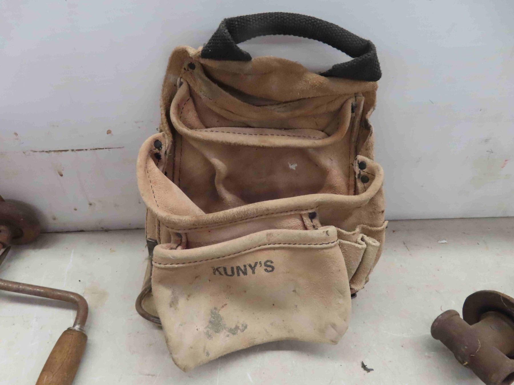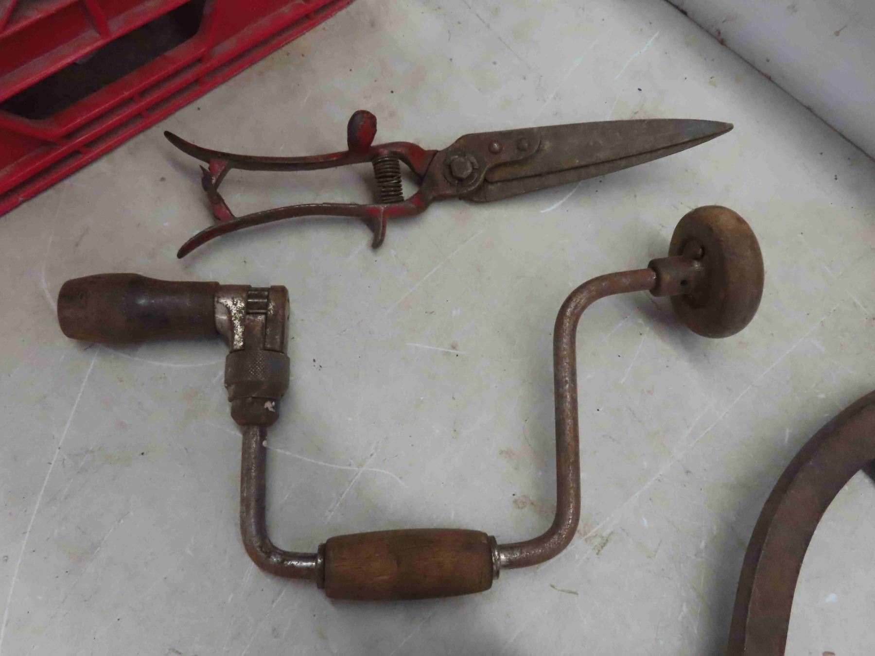 Vintage Hand Tools: Drills, Ice Tongs, Clippers and Tool Pouch, Power Drill