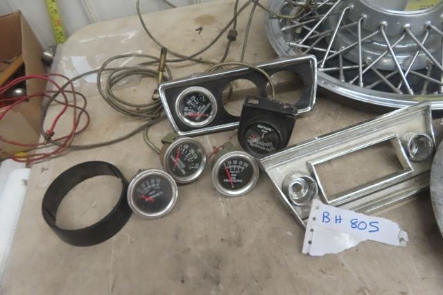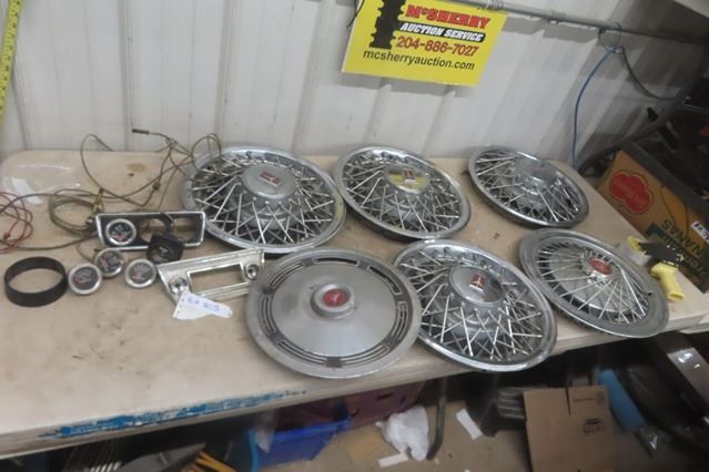 Vintage Hubcaps, Auto Gauges, Oil, Amp Meter plus more