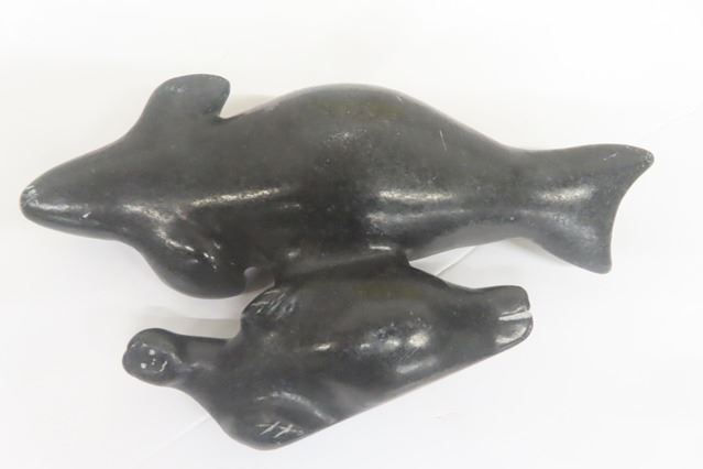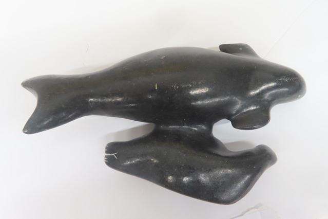 Vintage Indigenous Soapstone Depicting Merman Spirit Carrying Whale on its Back- Signed + Dated 9" Long