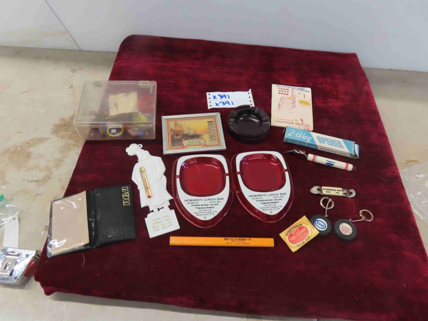 Vintage Items with Advertisement: Pencil, Ashtrays, Opener, Key Chain, Thermometers, Plus