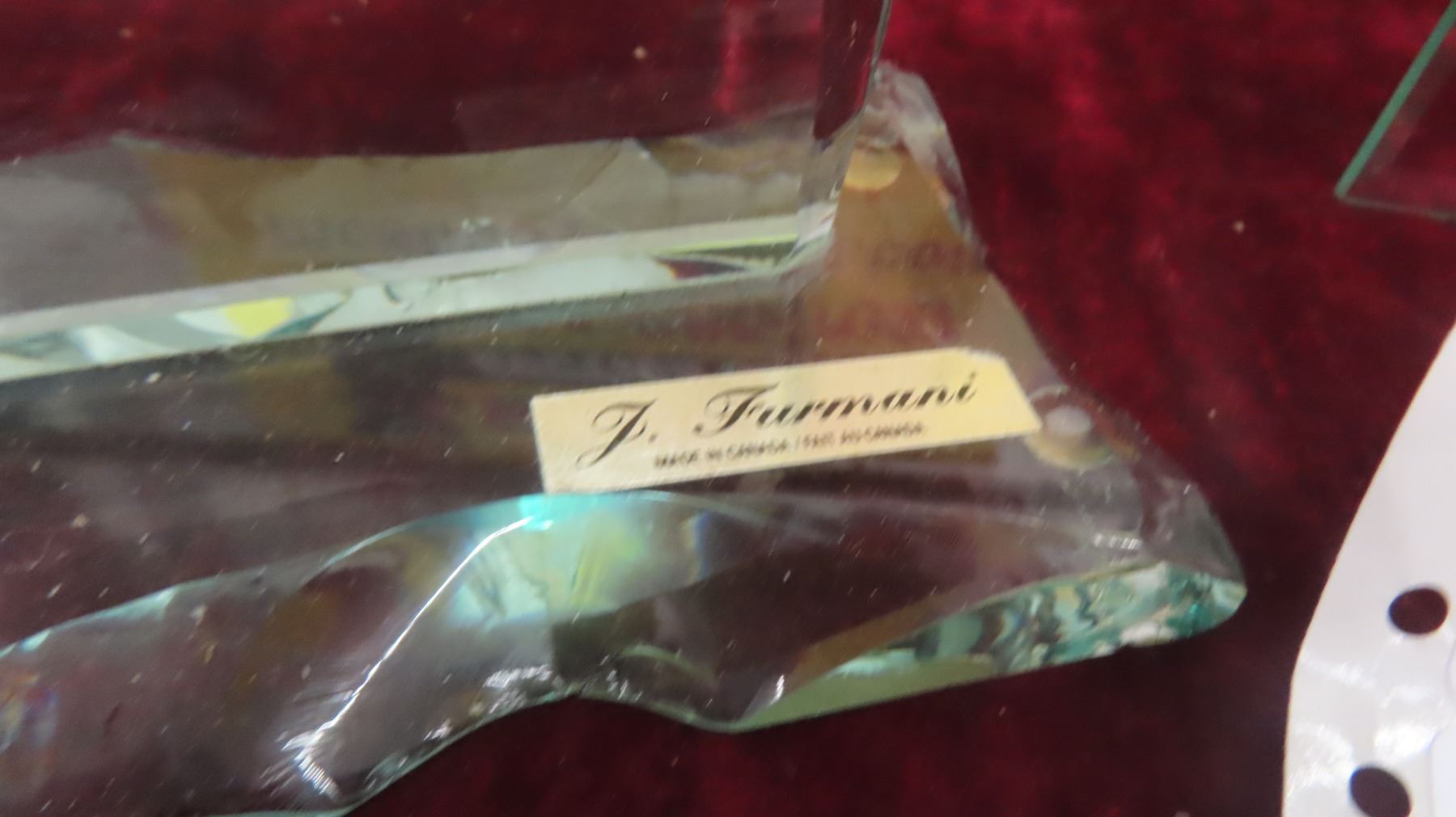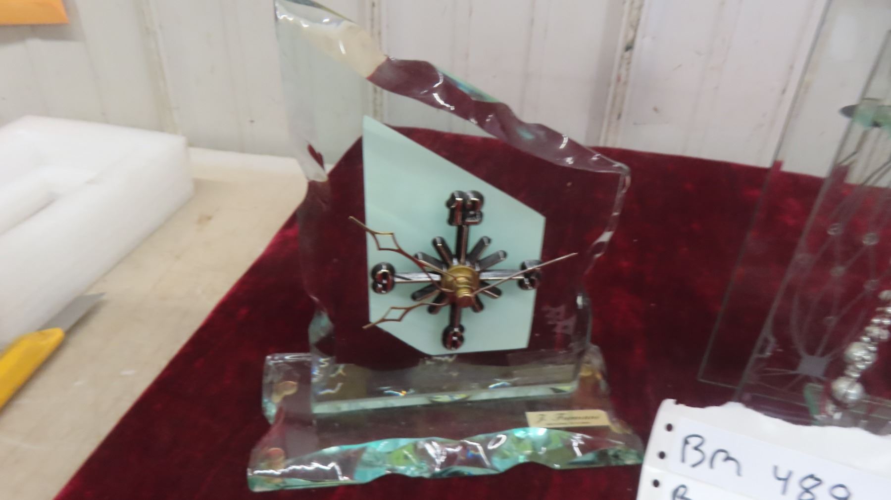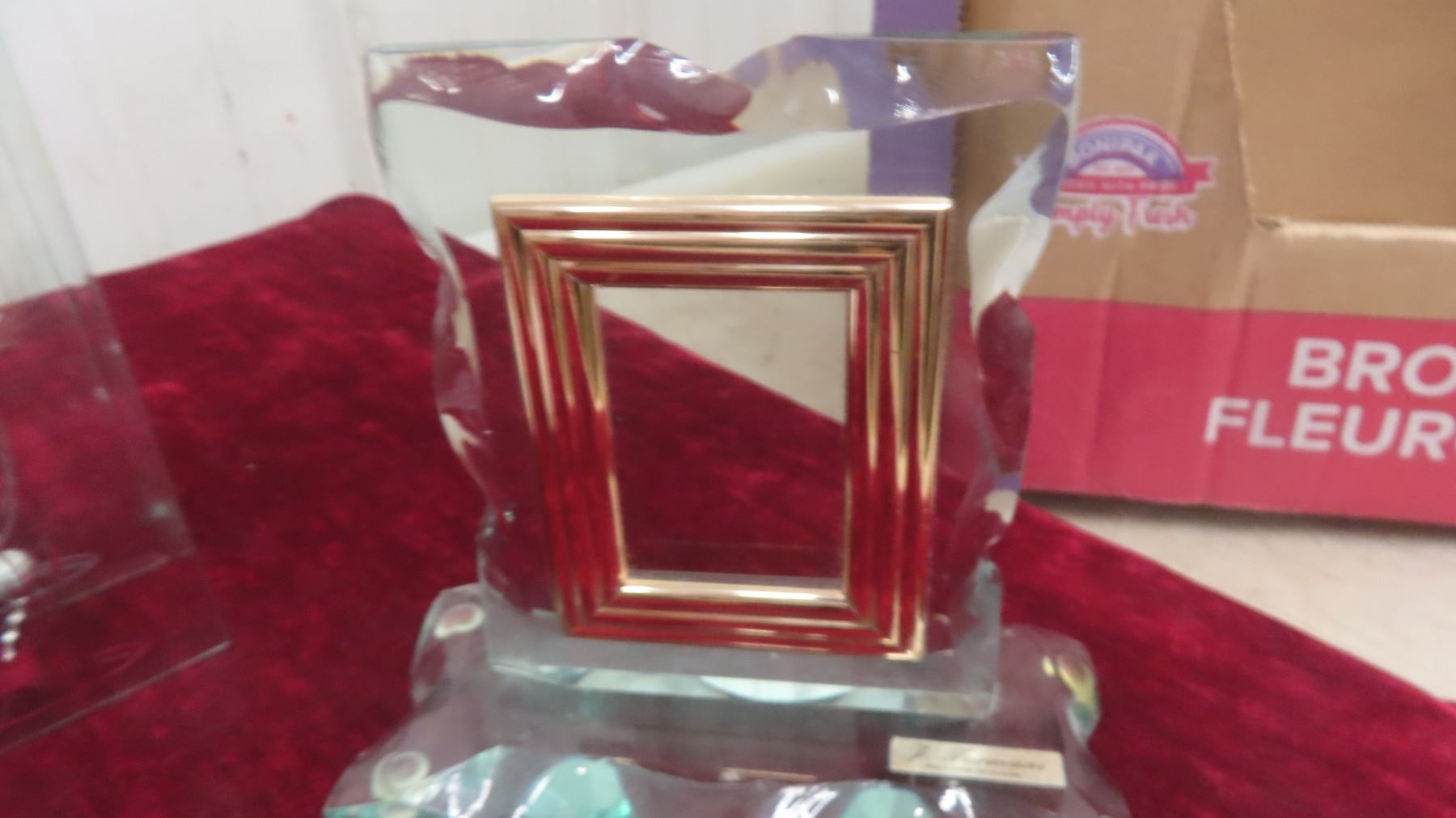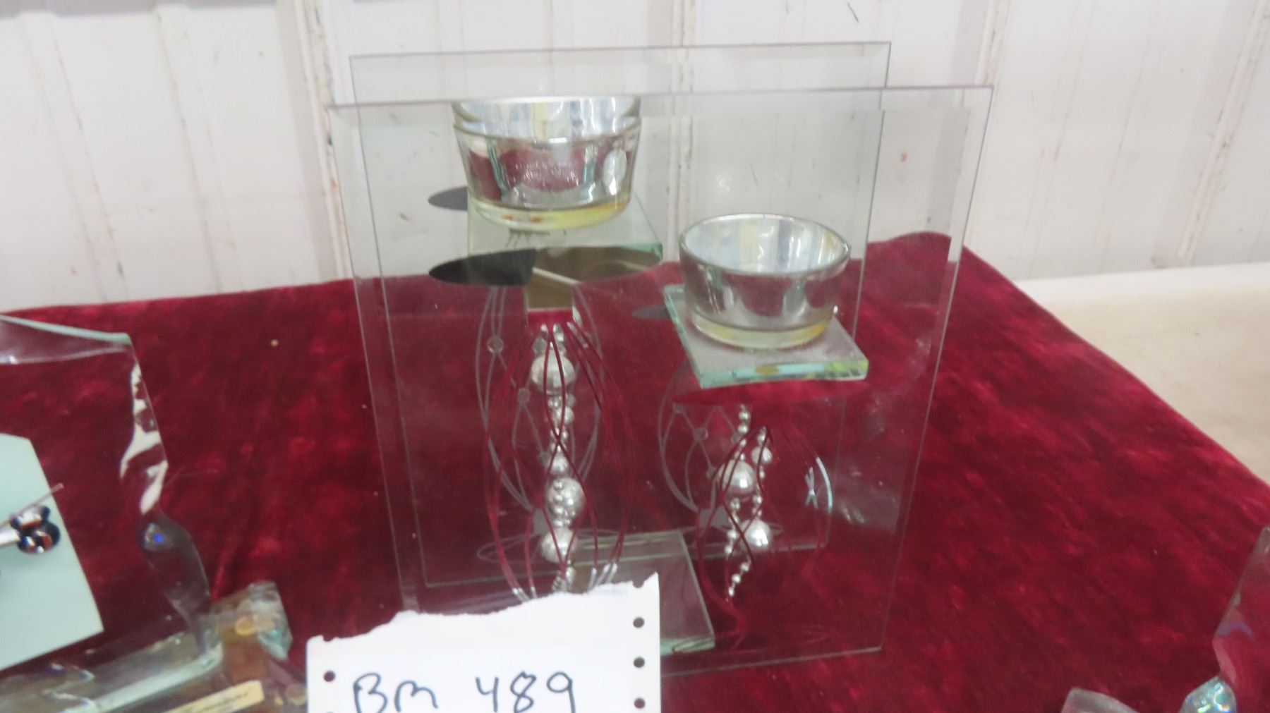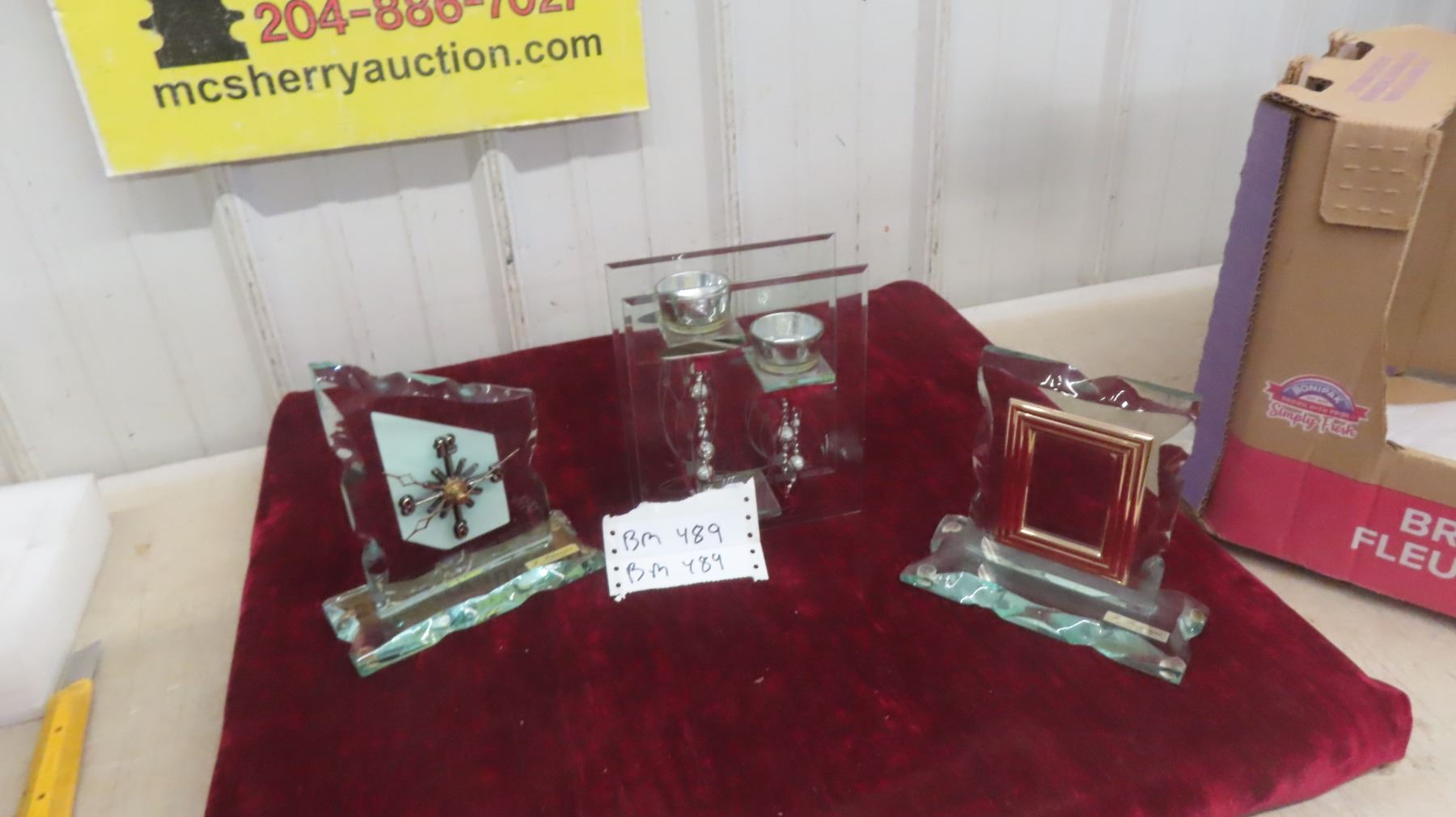 Vintage J. Furmani Tinted Cut Glass Crystal Clock, Photo Frame 7'' x 7'' , Designer Glass Silver Etching Hanging Beads Tea Light Candle Holder 8'' x 7''