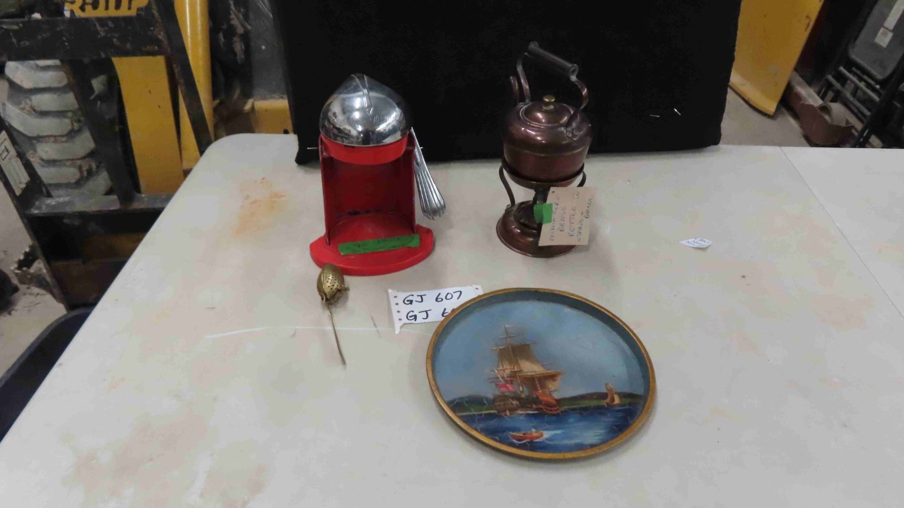 Vintage Juice Squeezer, Miniature Brass Kettle with Stand + Burner, plus more