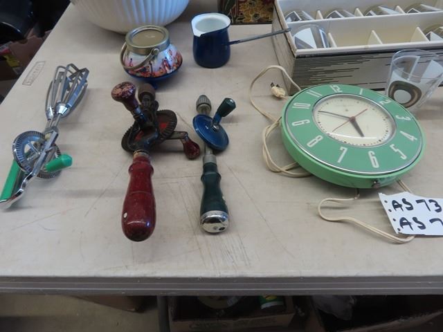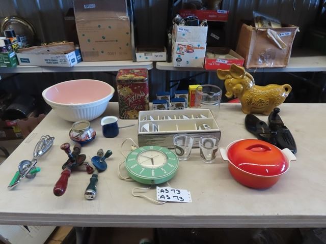 Vintage Kitchen Items, Tetley Tea Tin, Spice Tins, Beaters, Clock Glasses & Cast Pot Plus More!