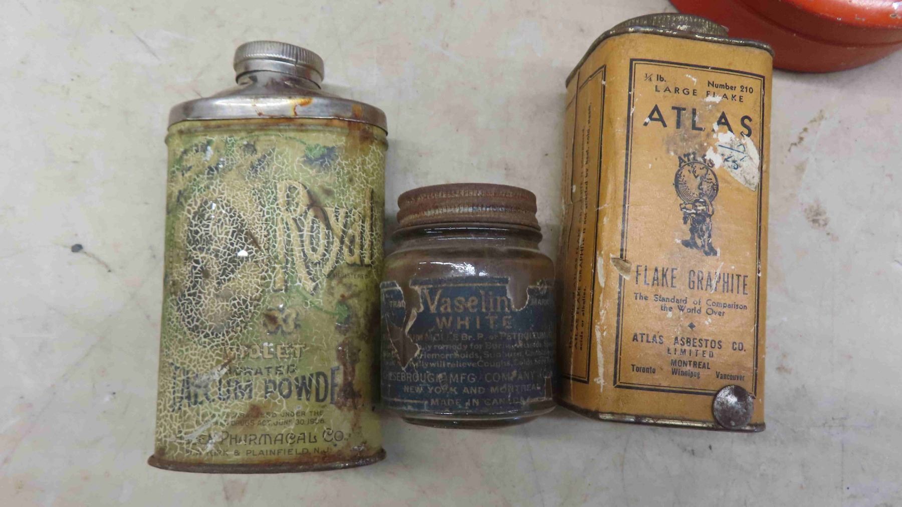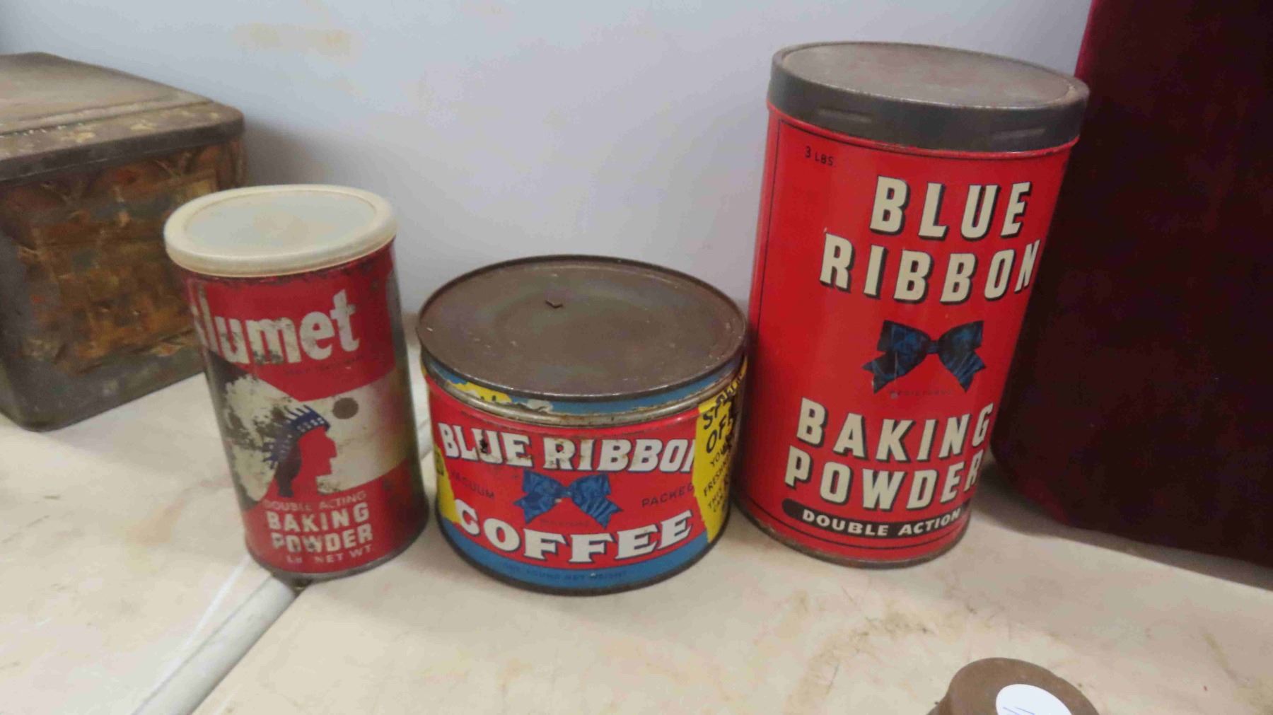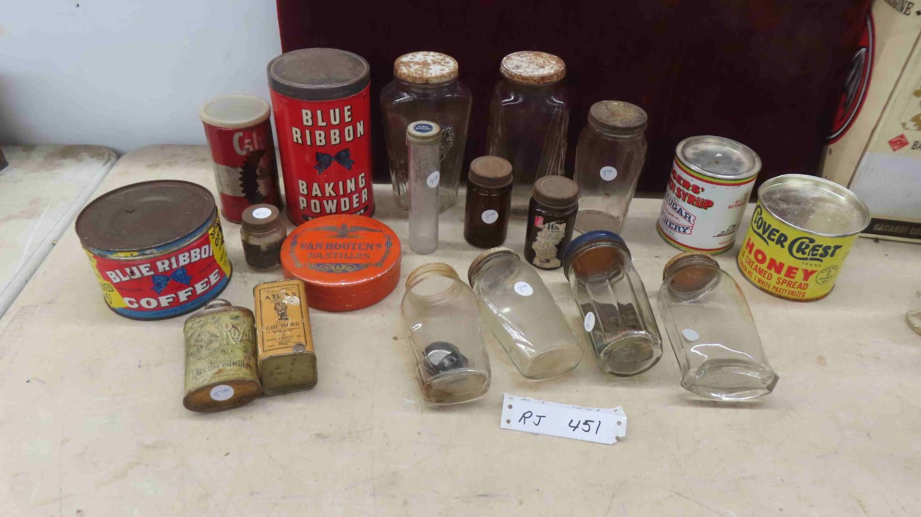 Vintage Kitchen + Medicinal Bottles and Tins : Baking Powder , Blue Ribbon, Coffee , Honey , Vasoliine & Others