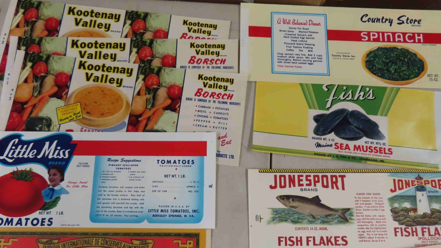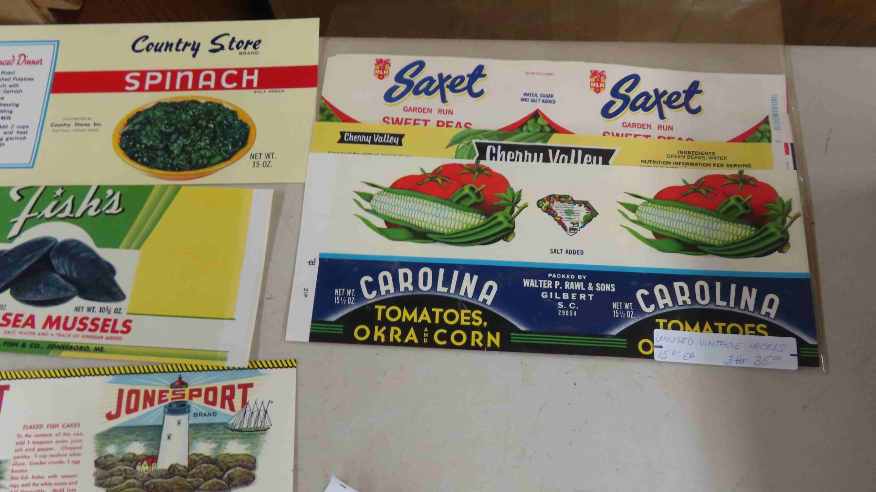 Vintage Labels - Cannon Valley, Big Giant, Lushus Corn, Ritas Pride, Jonesport Fish