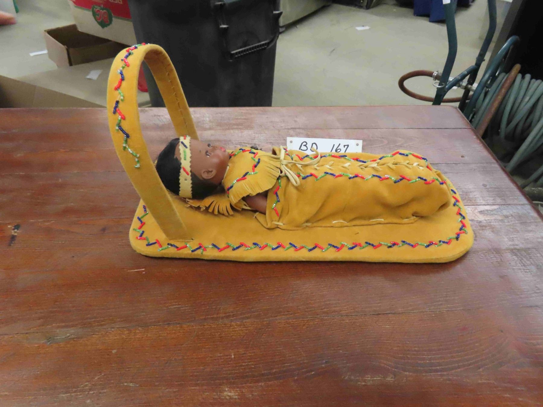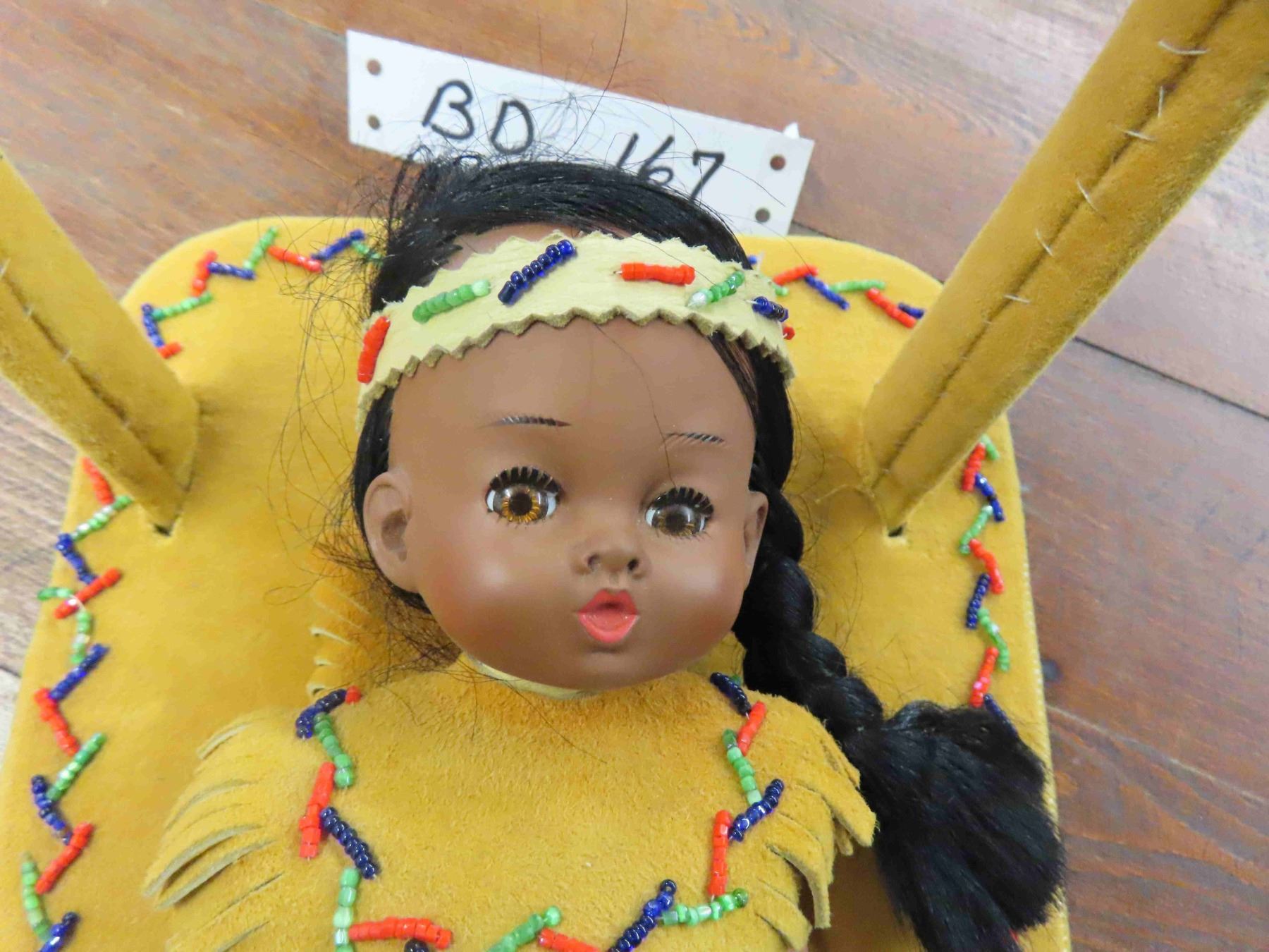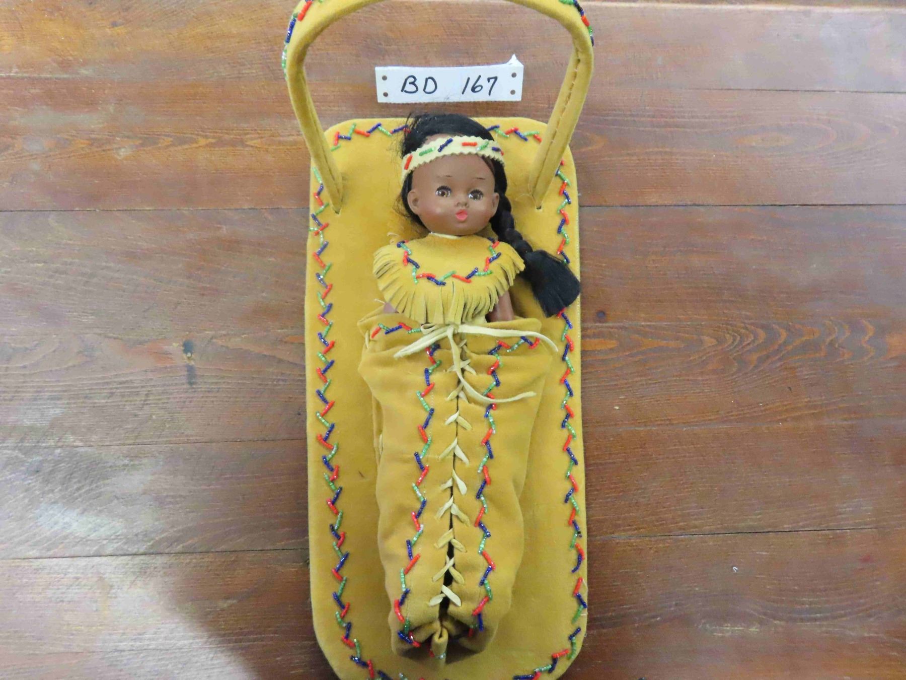 Vintage Leather & Wood First Nations Made Cradle Board with Doll 26'' x 7''