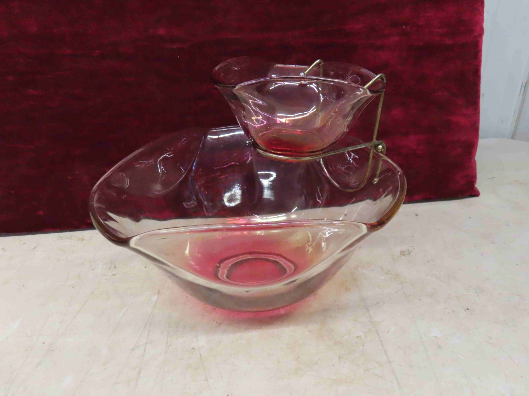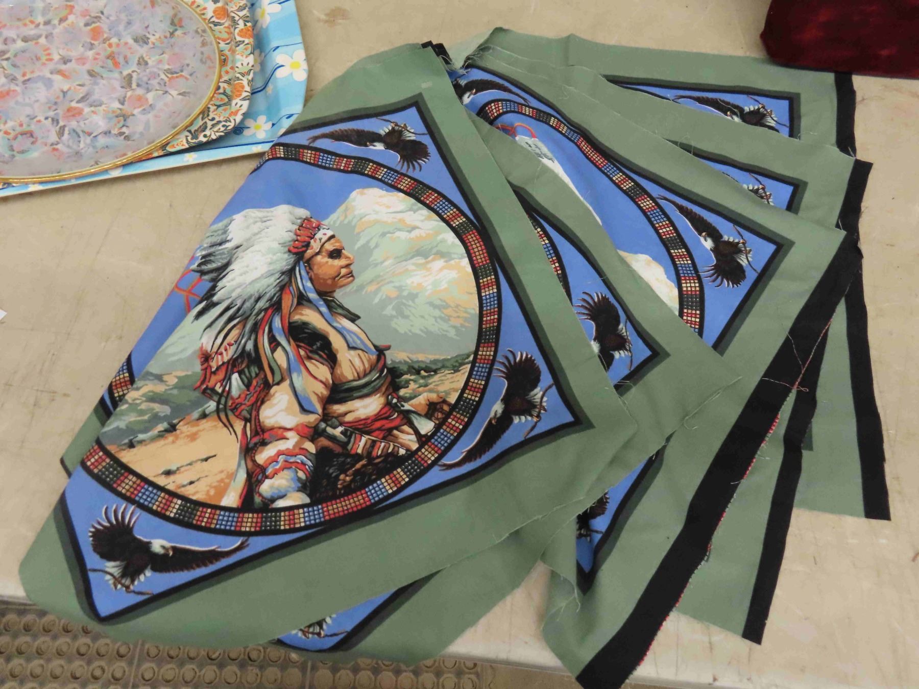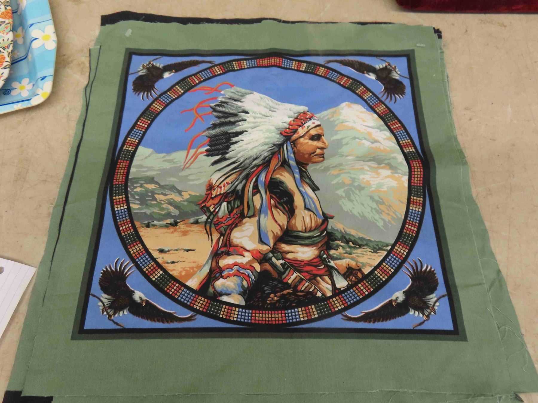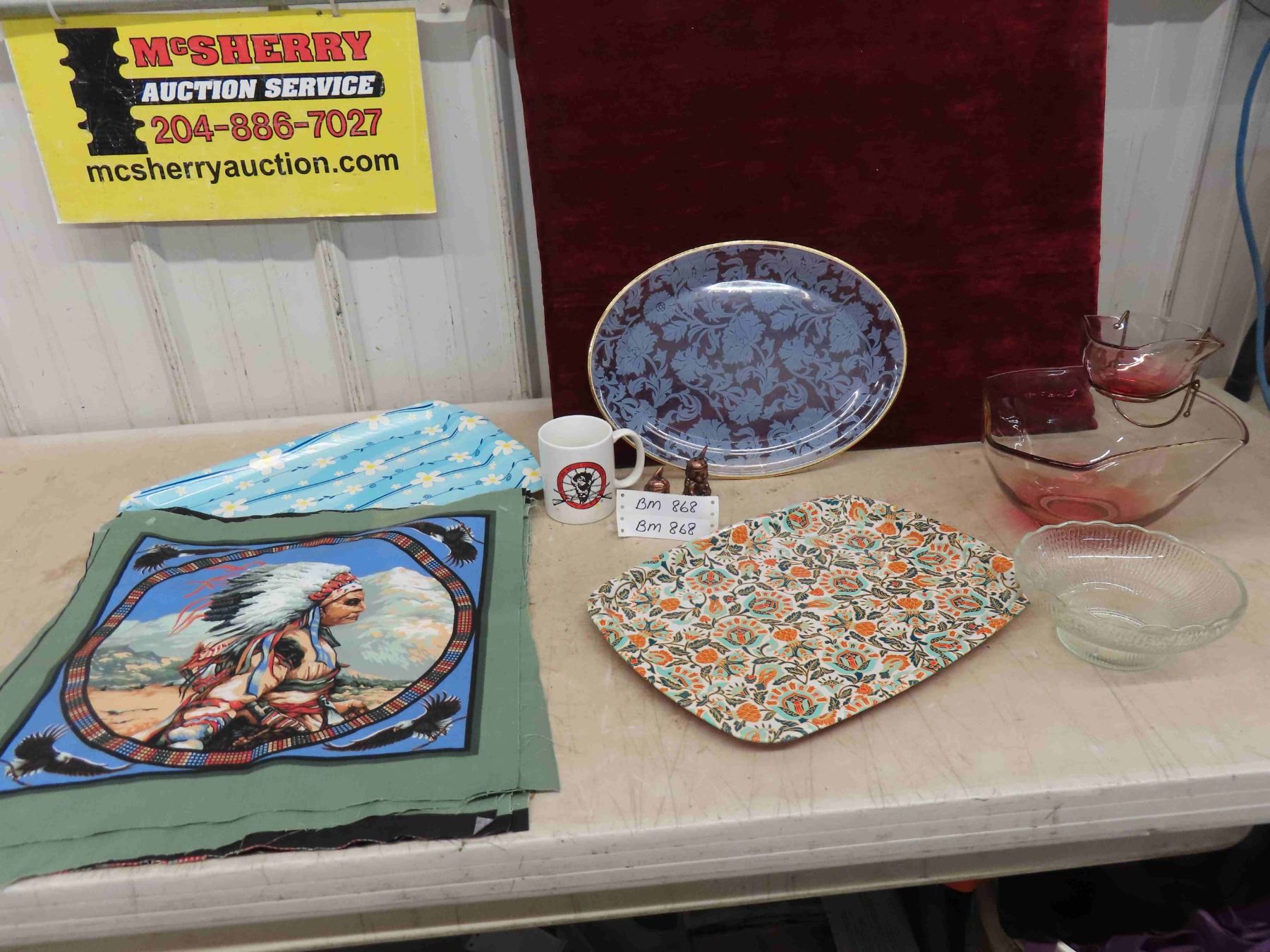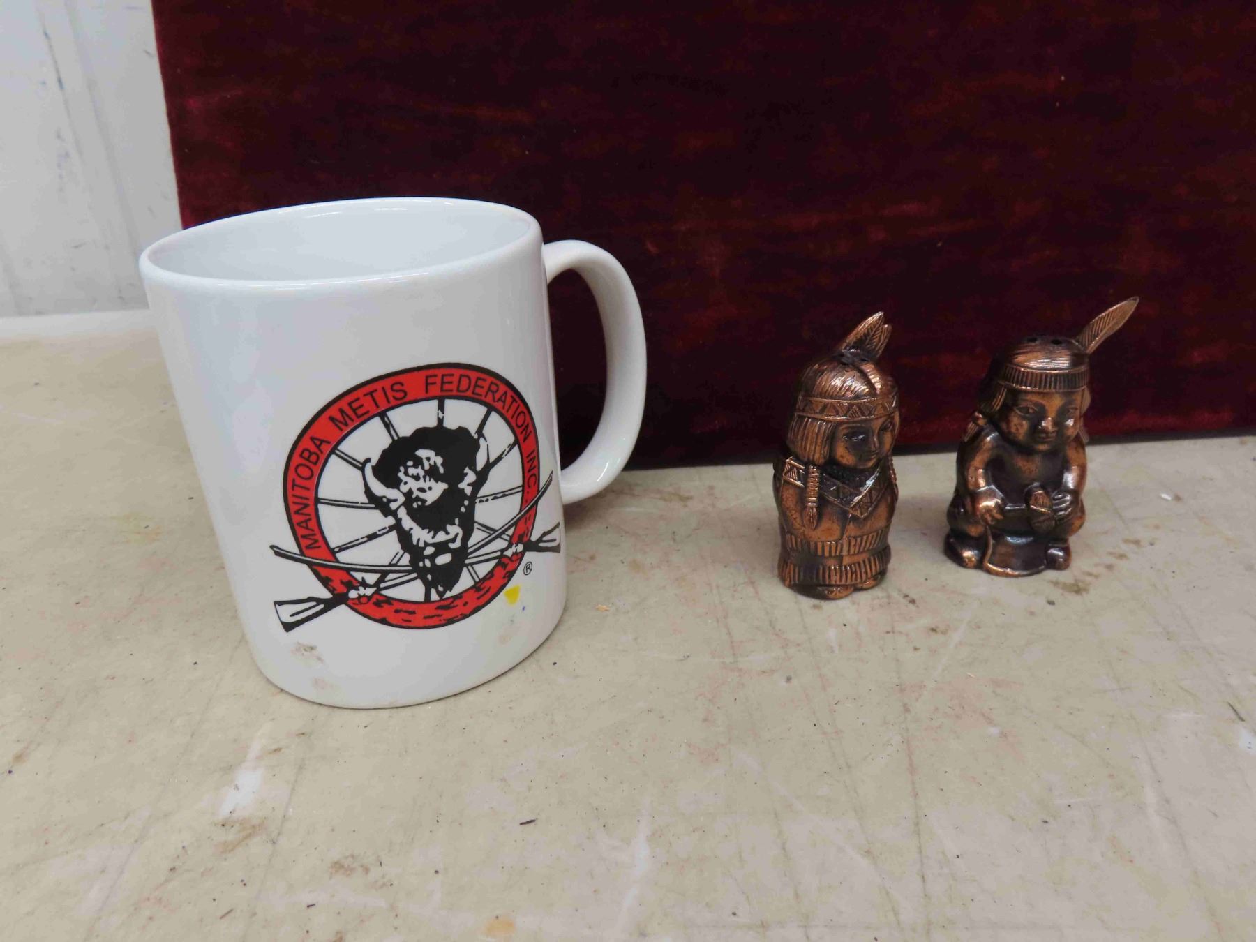 Vintage MTM Elite Metal Tray Made in England, Cranberry Pink Chip and Dip Bowl Set, 3'' Brass Salt and Pepper Shakers of Native American Boy and Girl, 5 Pieves 17'' Square Native American Chief/Eagle Fabric