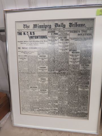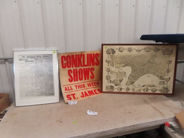 Vintage Map Showing 1884 Winnipeg Framed 36" x 25", Cardboard St James Conklin Shows Poster 26" x 22" , 1899 Newspaper " The Winnipeg Daily Tribune" Framed 24" x 19"