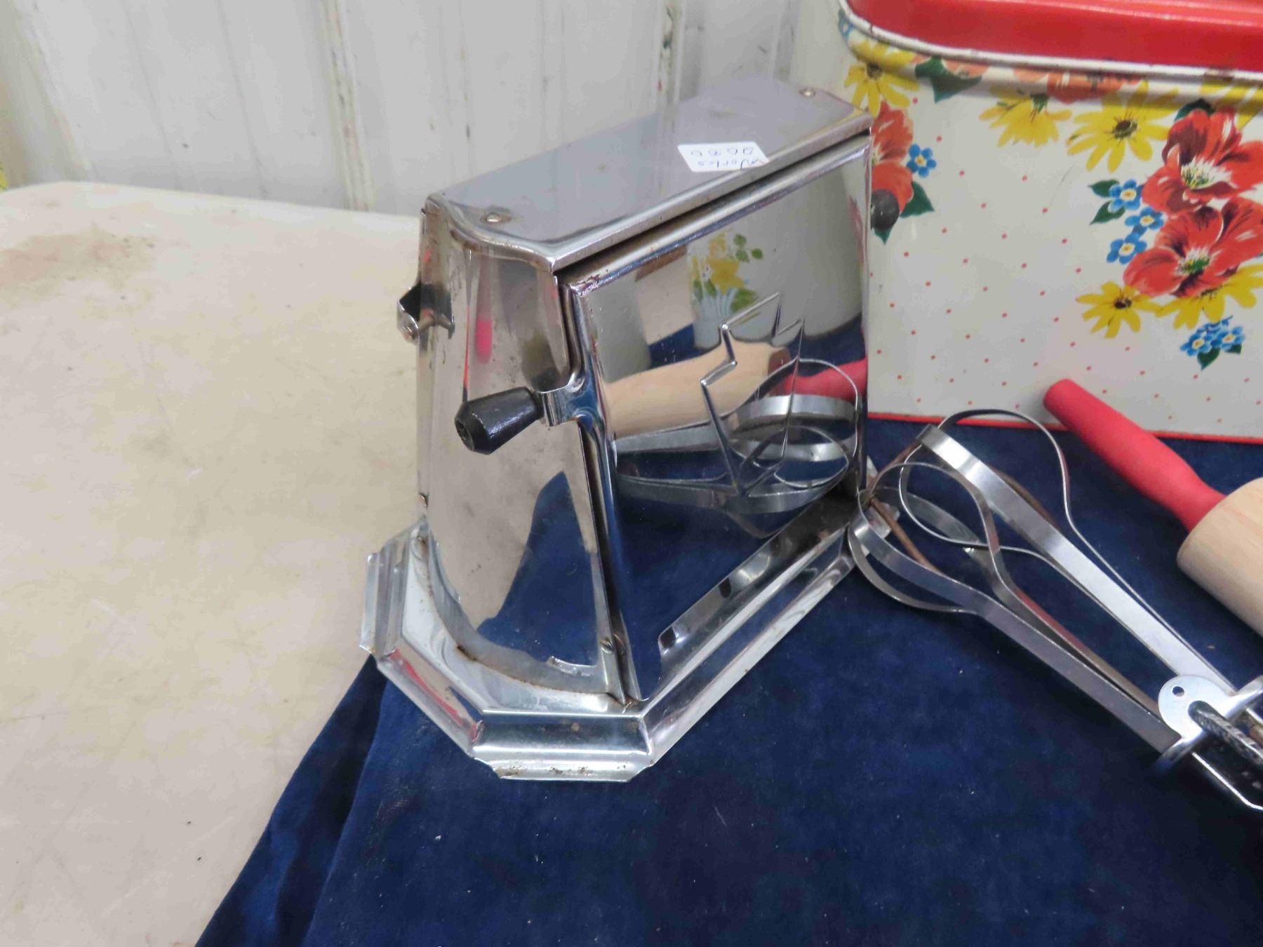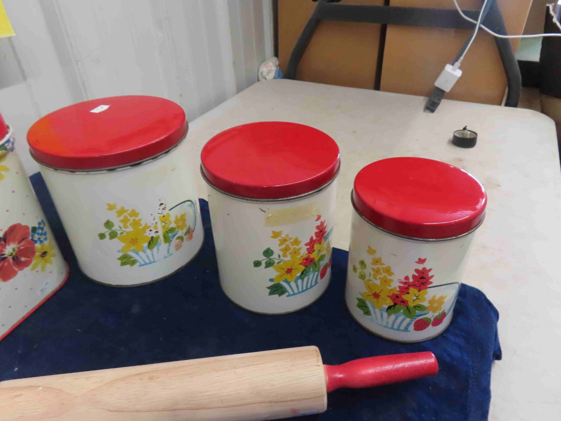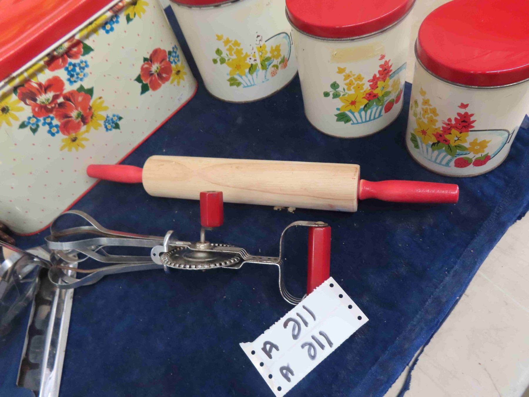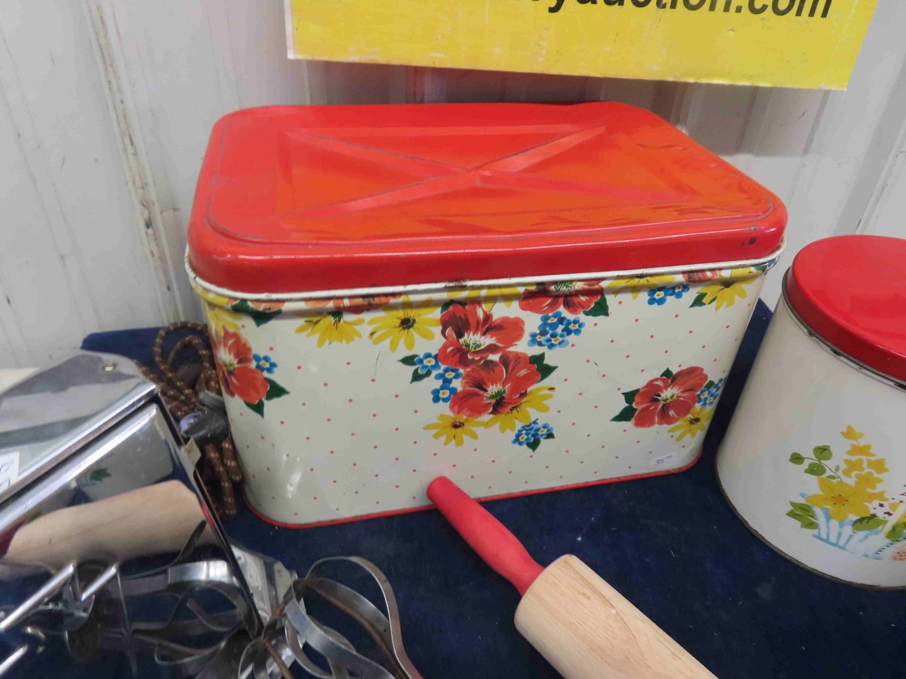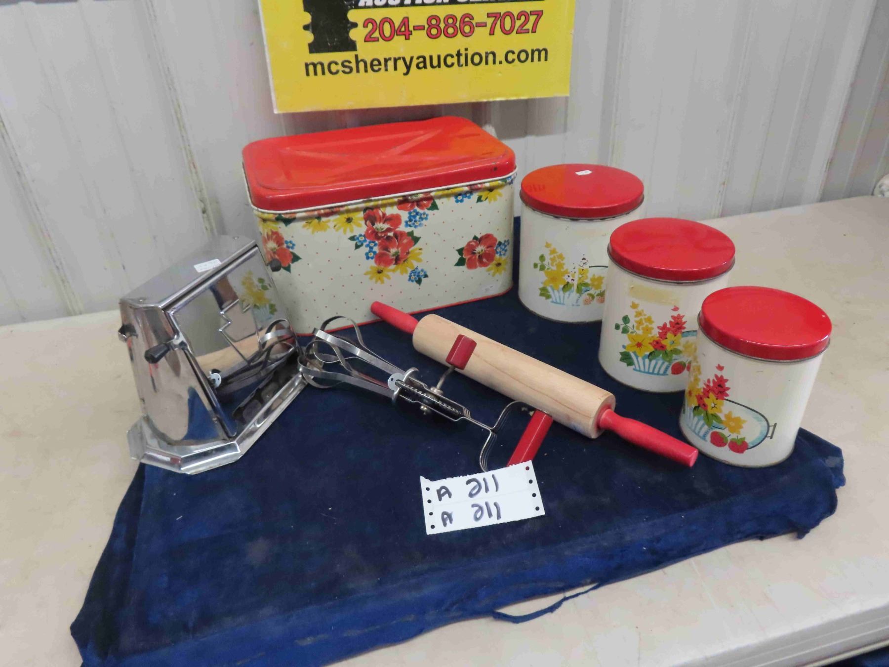 Vintage Metal Canister set, Bread Box, Drop Side Toaster, Rolling Pin + Mixer