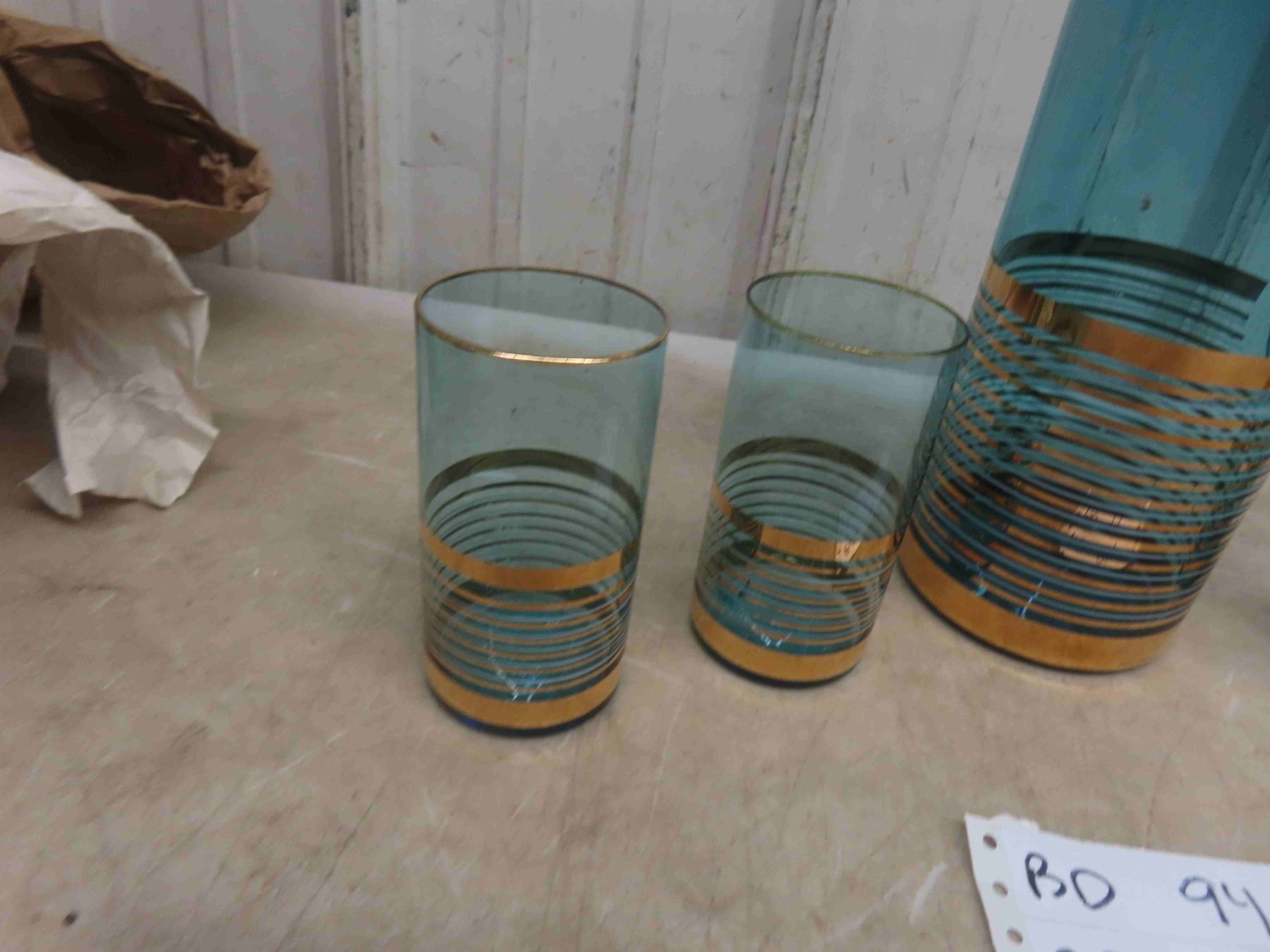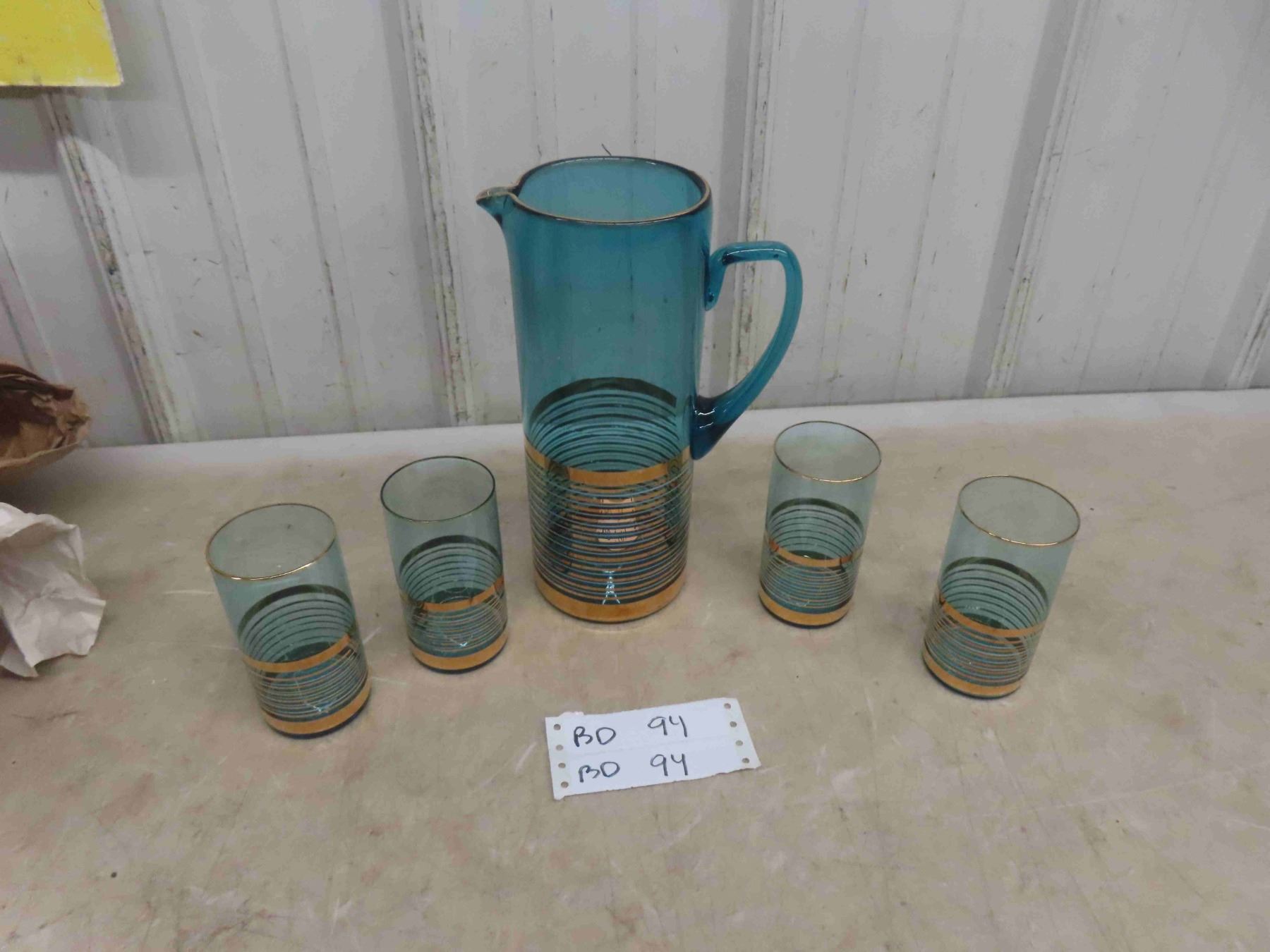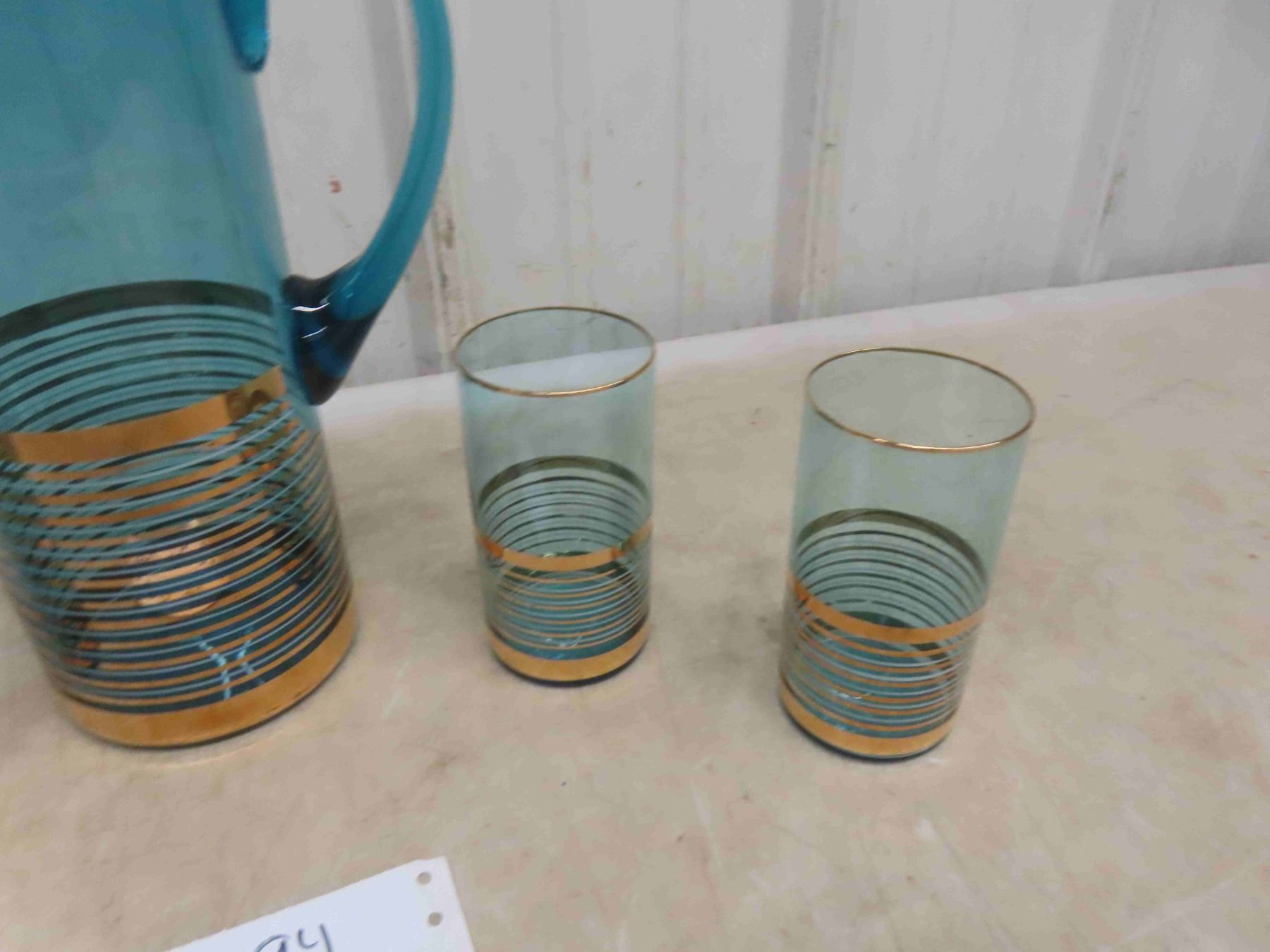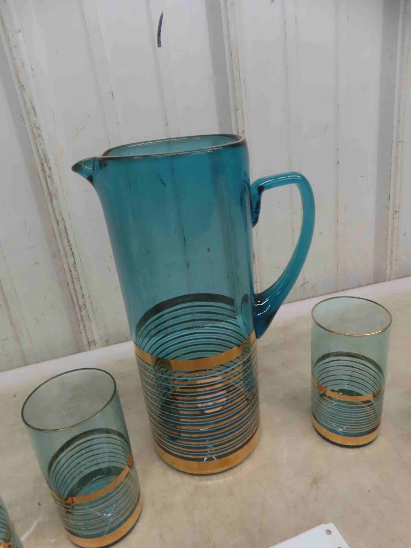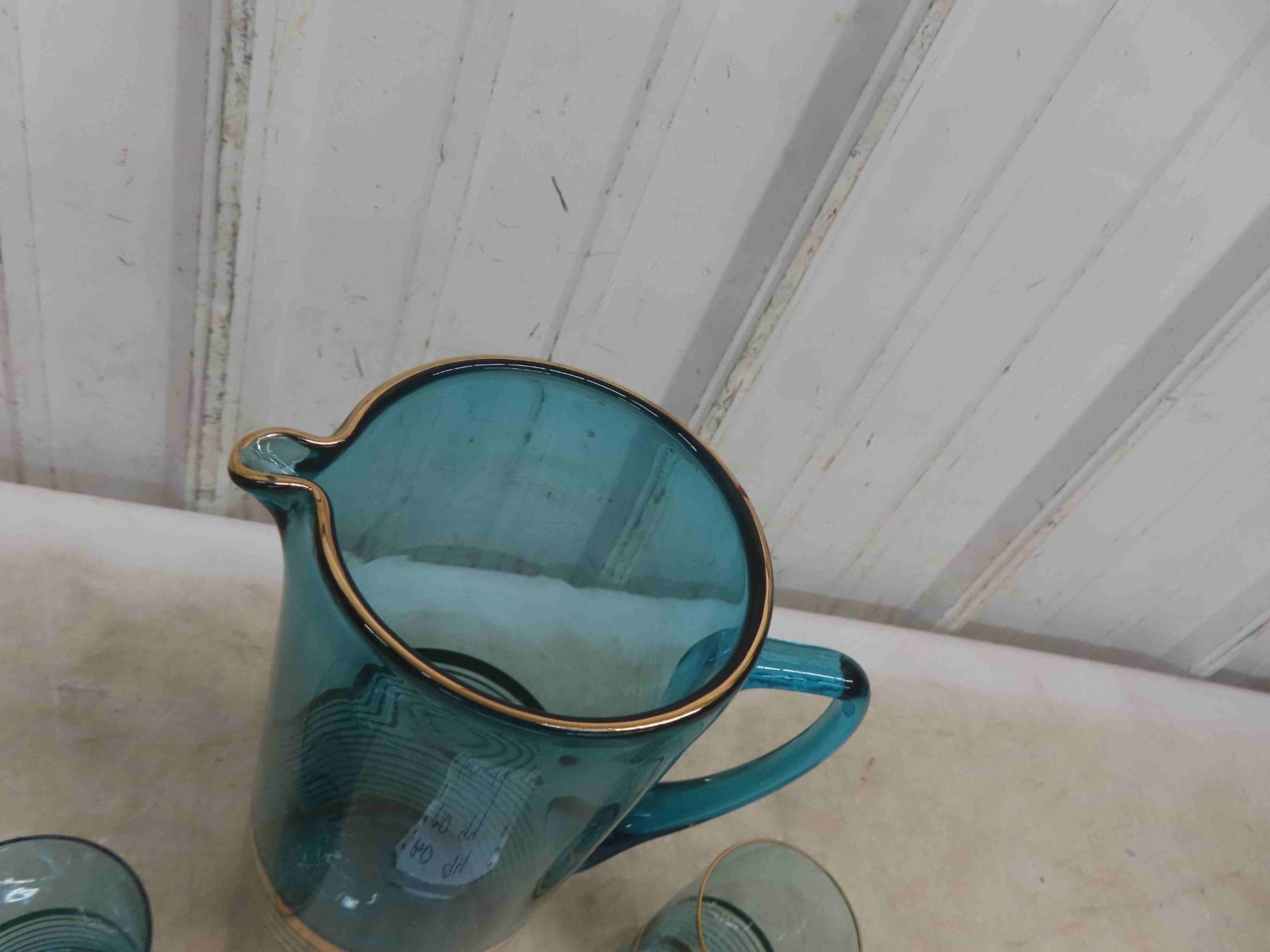 Vintage Mid Century 1960s Bohemia Glass Turquoise Pitcher/Glasses Set.