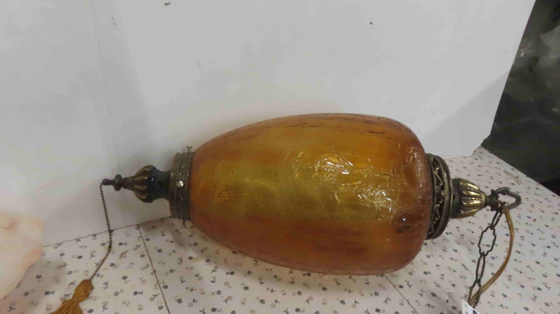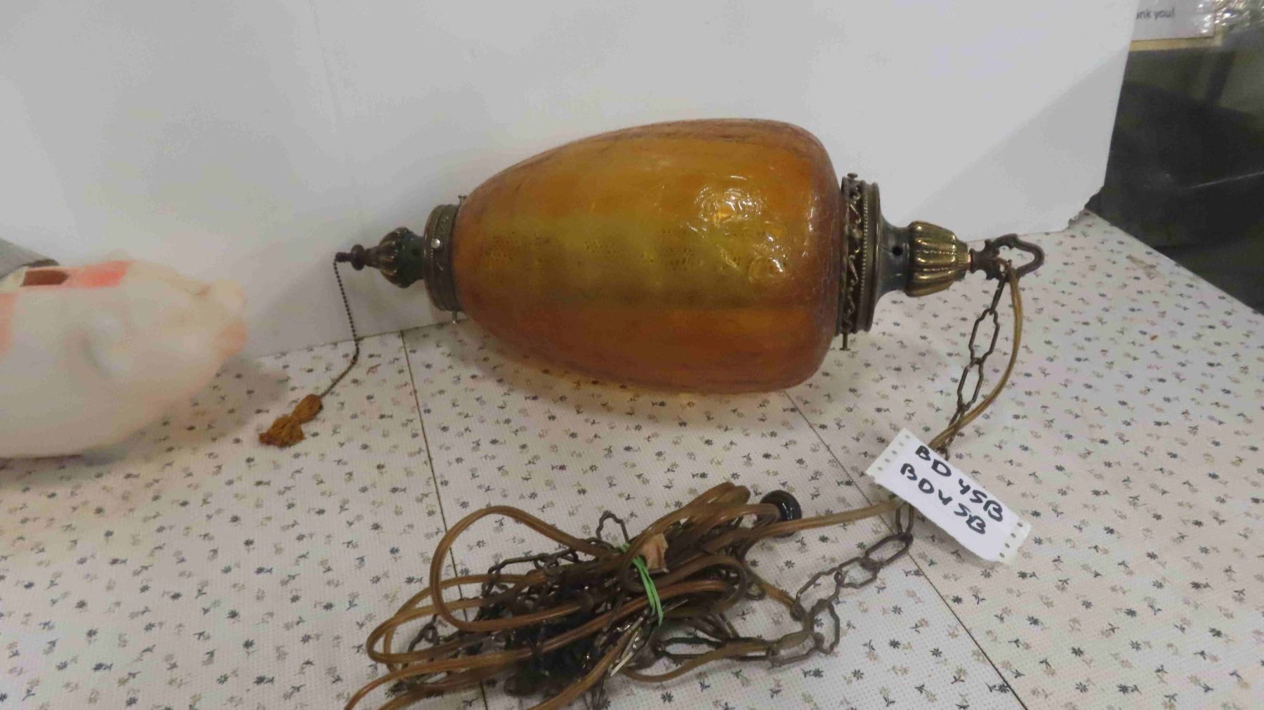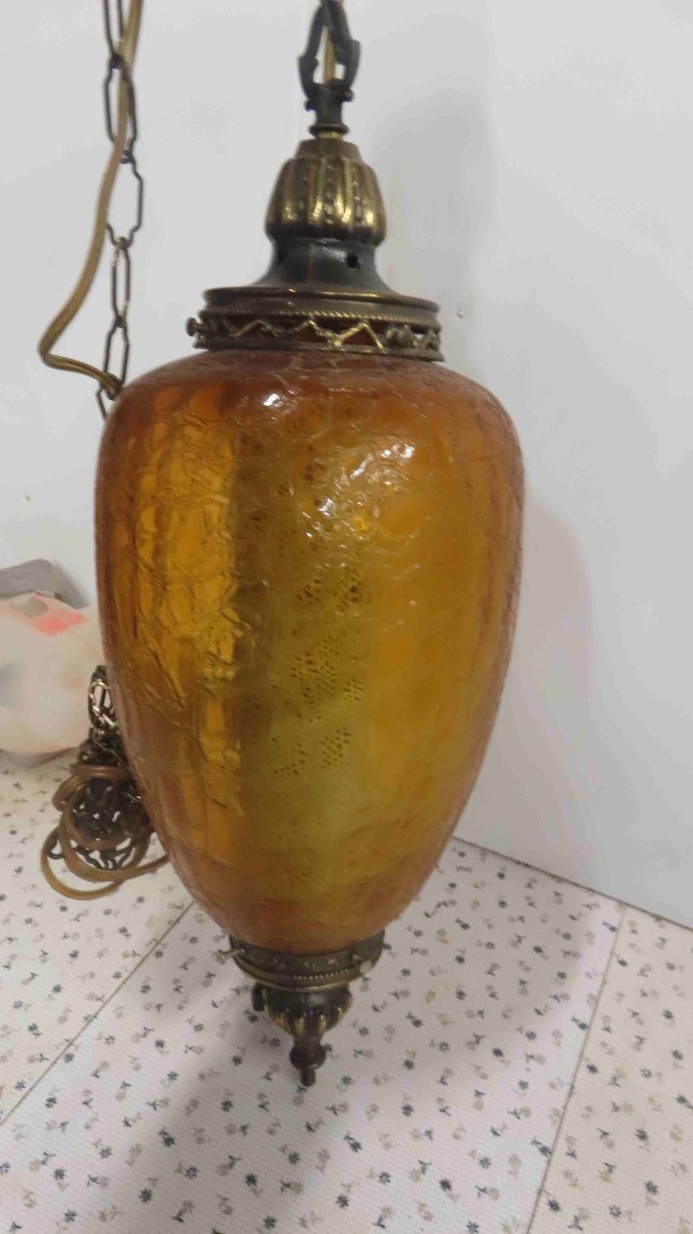 Vintage Mid Century Hanging Swag Lamp Brass with Amber Glass Shade - Shade is 25'' High , Has Chain with Plug - Excellent Condition