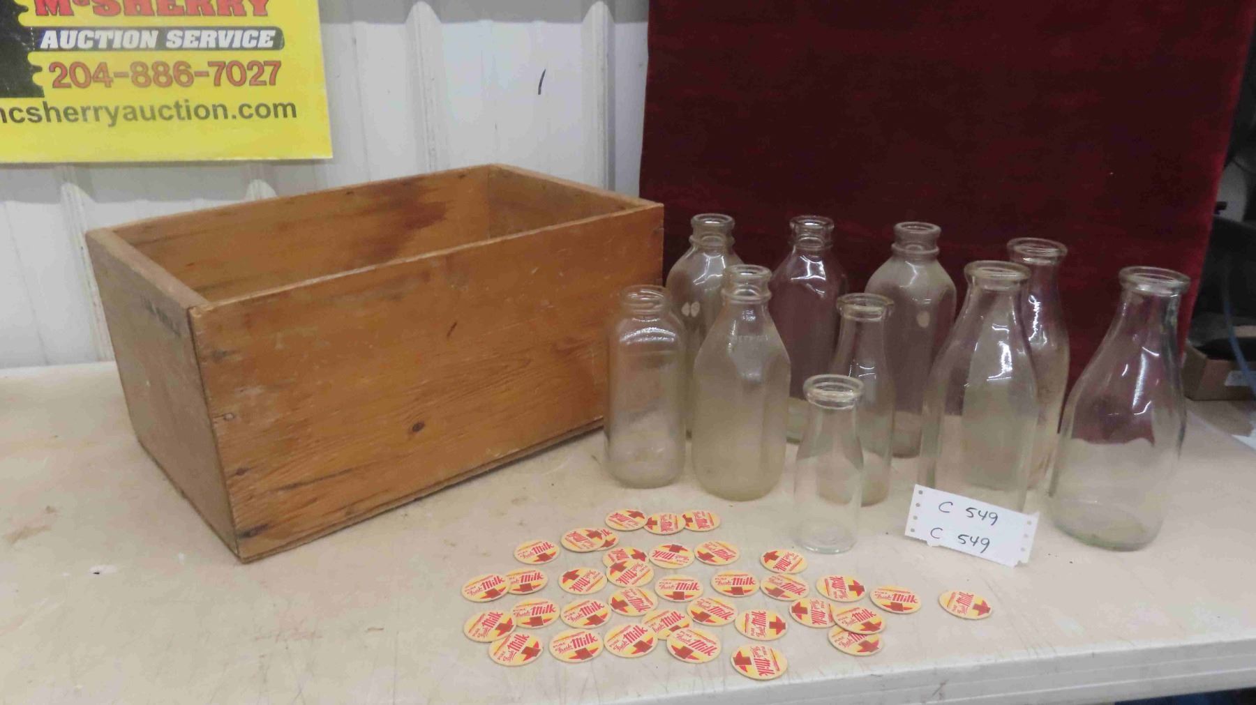 Vintage Milk and Cream Bottles , Cardboard Lids , Wood Crate 20'' x 13 1/4'' x 10''