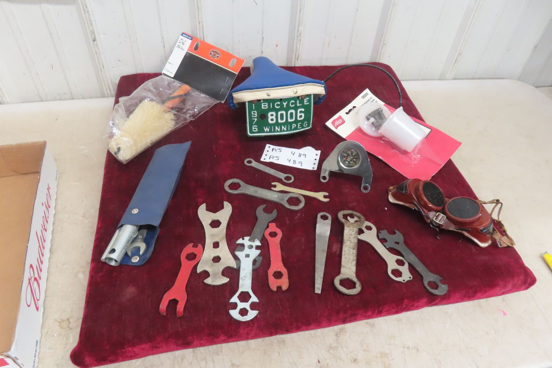 Vintage Motorcycle Bicycle Wrenches, Seat & Harley Davidson speedo with cable, brush