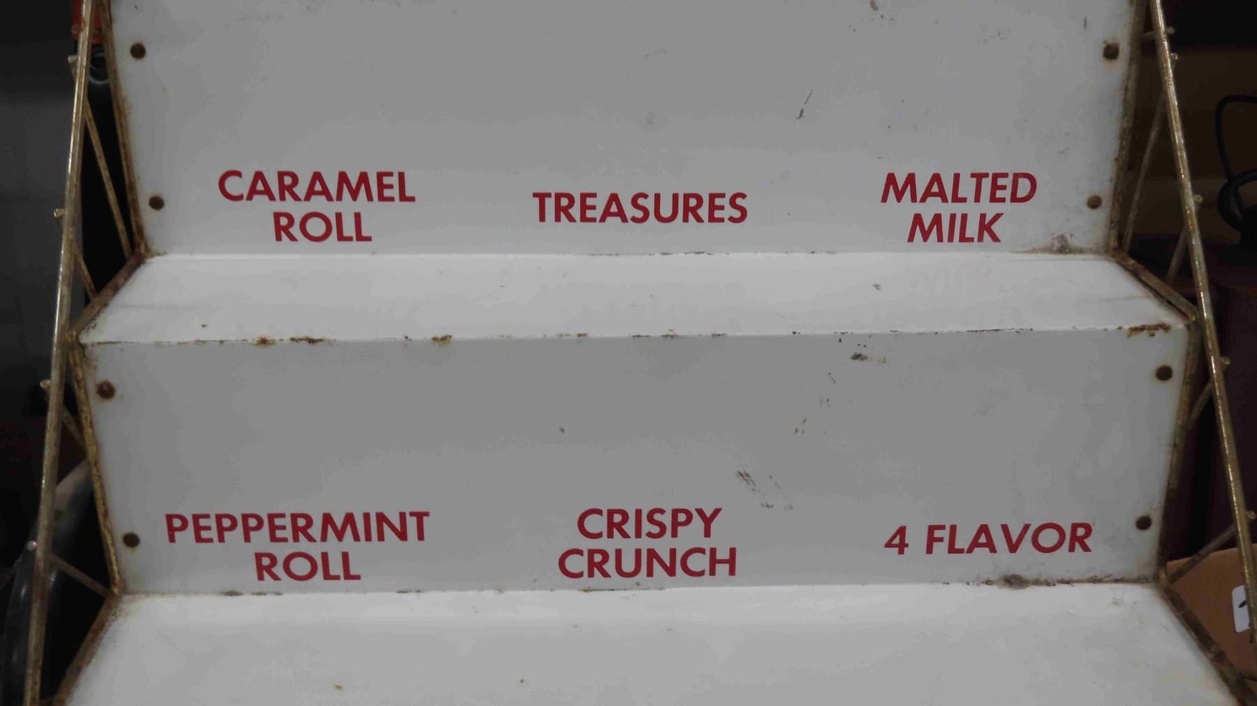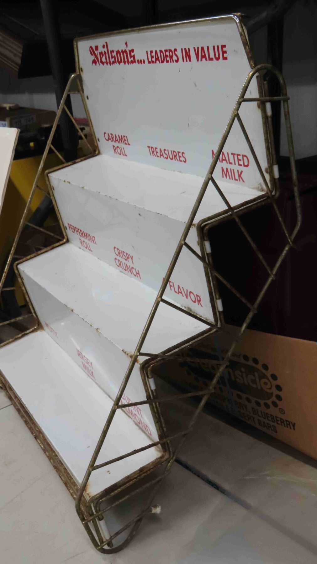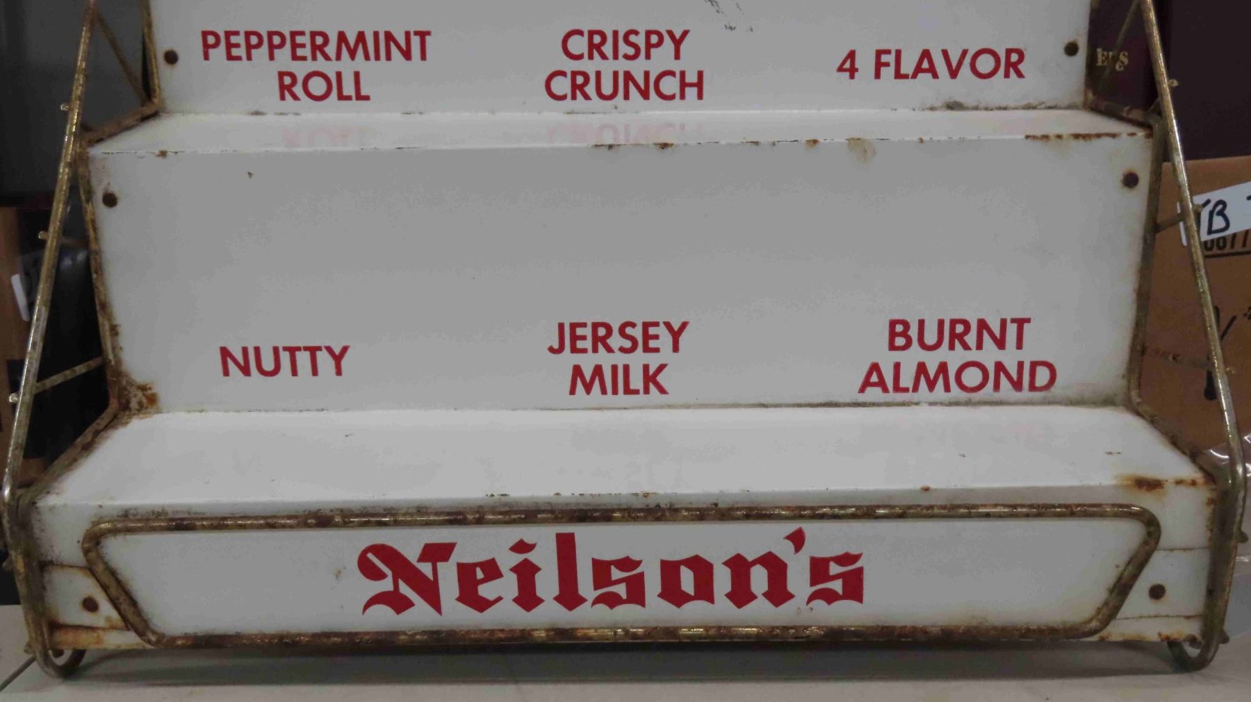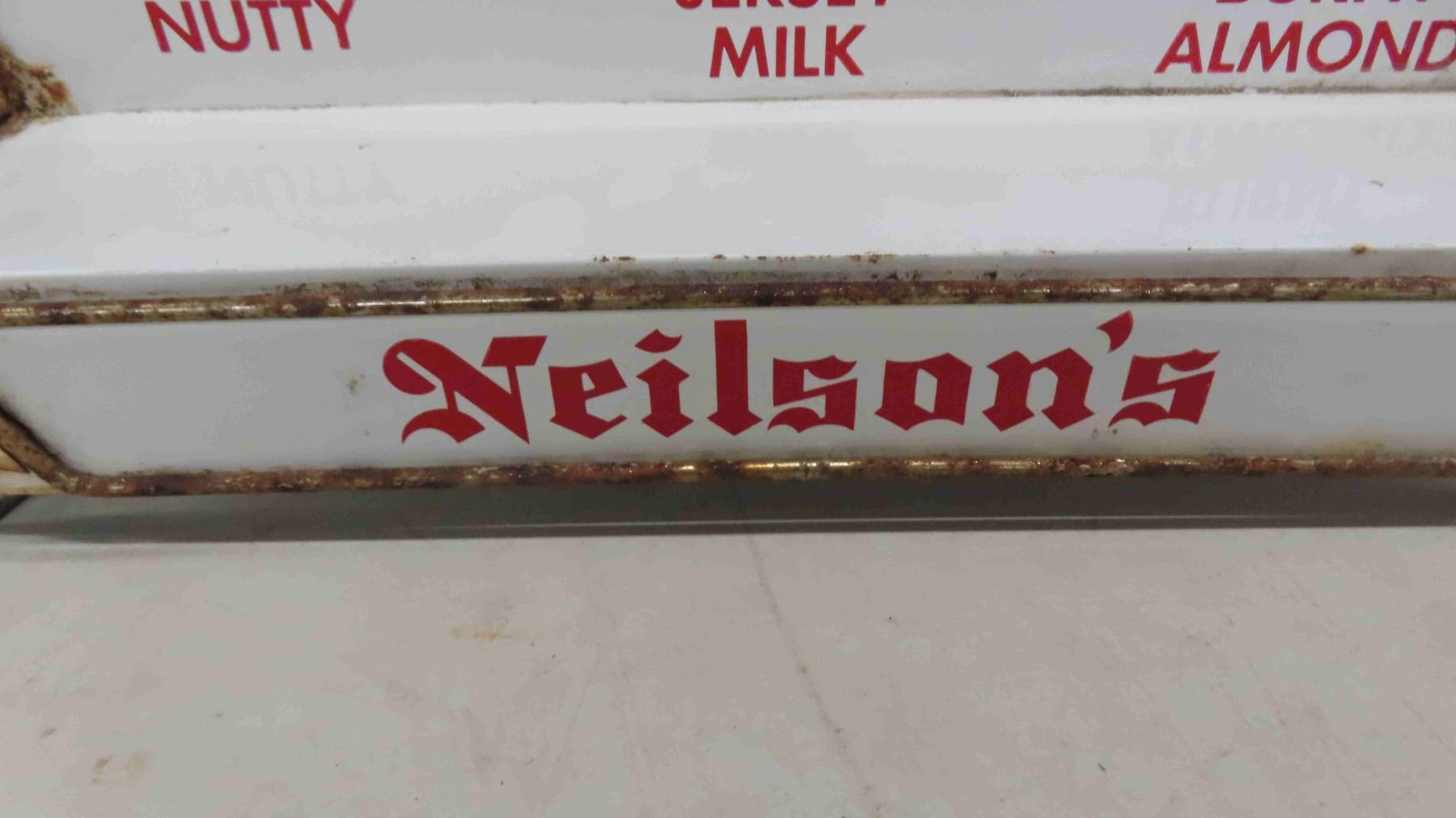 Vintage Neilsons Chocolate Bars Store Display Metal Shelf 21'' x 17'' with Popular Candy Bar Names including Crispy Crunch, Caramilk, Jersey Milk, Plus Others